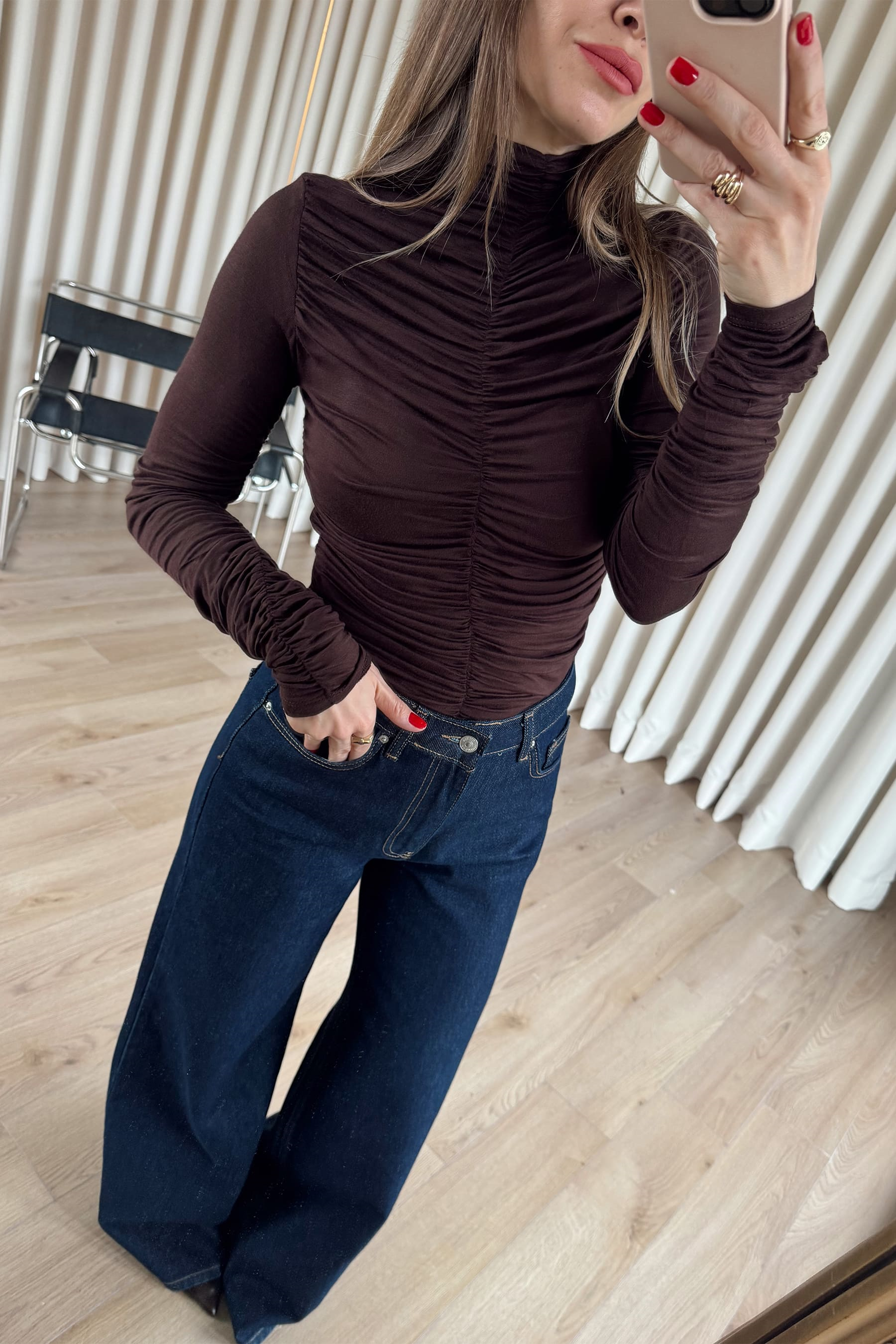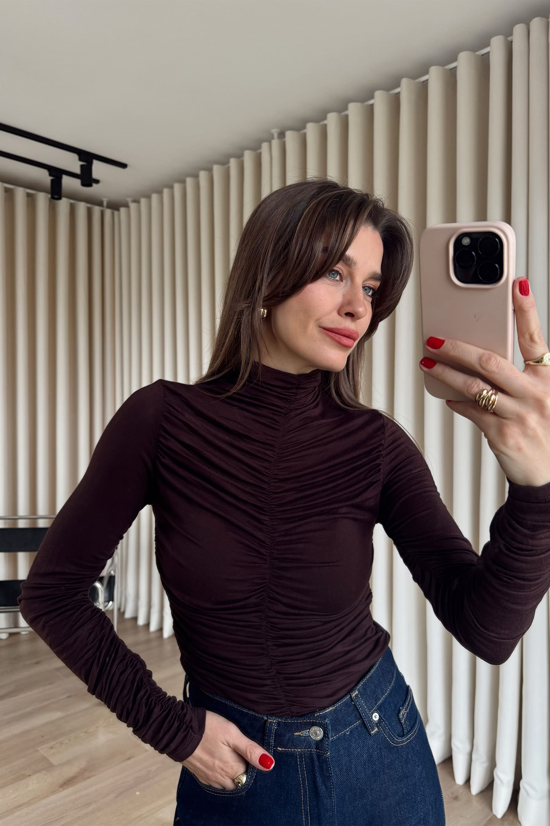 Acı Kahve Önü ve Kolu Drapeli Bluz Model Ölçüleri: Boy: 166 cm, Kilo:54 kg Modelin Üzerindeki Beden: S/36 Ürünün Uzunluğu: 57 cm (1-2 cm arası değişiklik gösterebilir.) Kumaş Türü:%95 Pamuk, %5 Elestan Yıkama Talimatı : Ürünün iç kısmında bulunan etiketten yıkama talimatına ulaşabilirsiniz.