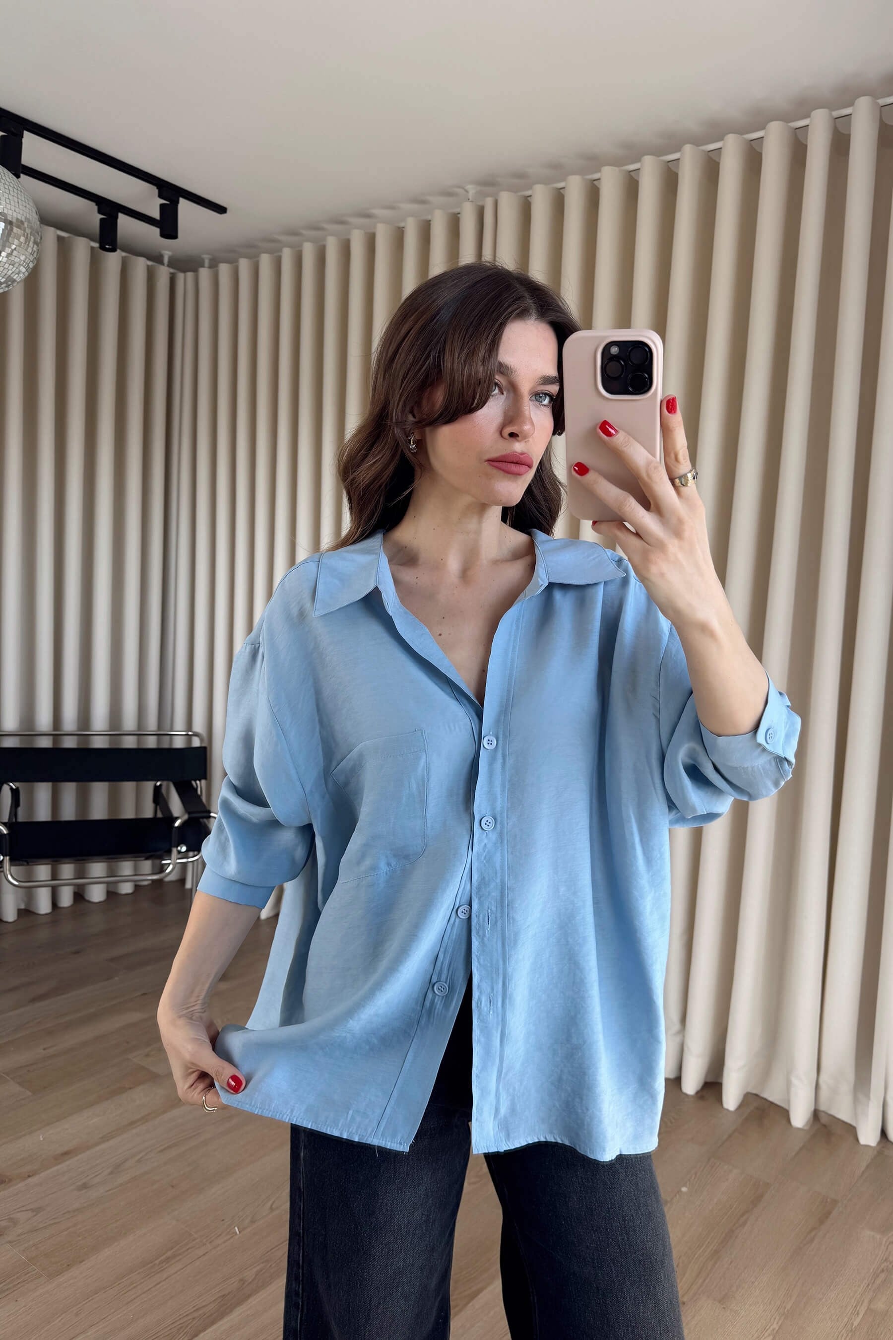 Açık Mavi Oversize Modal Kumaş Gömlek Model Ölçüleri: Boy: 166 cm, Kilo:54 kg Modelin Üzerindeki Beden: S/36 Ürünün Uzunluğu: 68 cm (1-2 cm arası değişiklik gösterebilir.) Kumaş Türü: %80 Modal, %20 Polyester Yıkama Talimatı : Ürünün iç kısmında bulunan etiketten yıkama talimatına ulaşabilirsiniz.