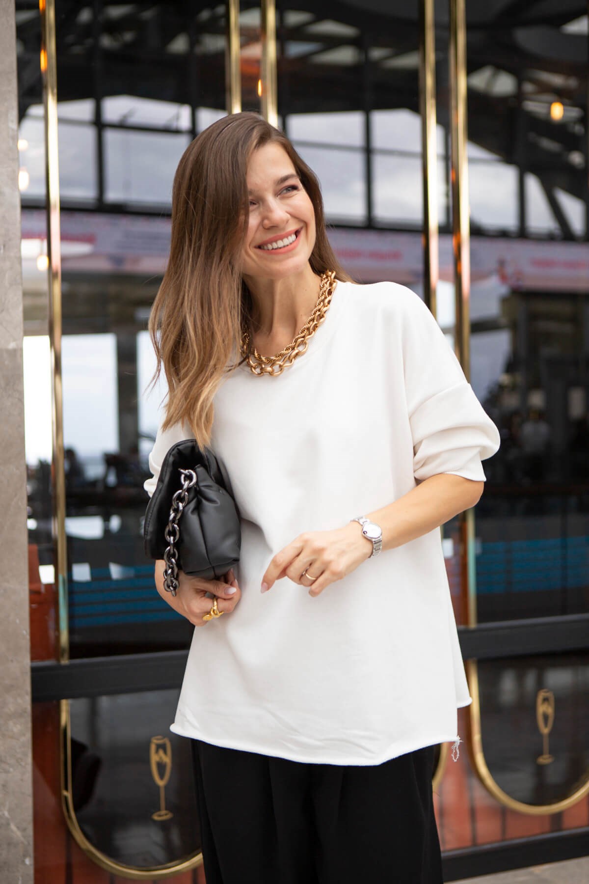 Beyaz Dikişsiz Bisiklet Yaka Sweatshirt