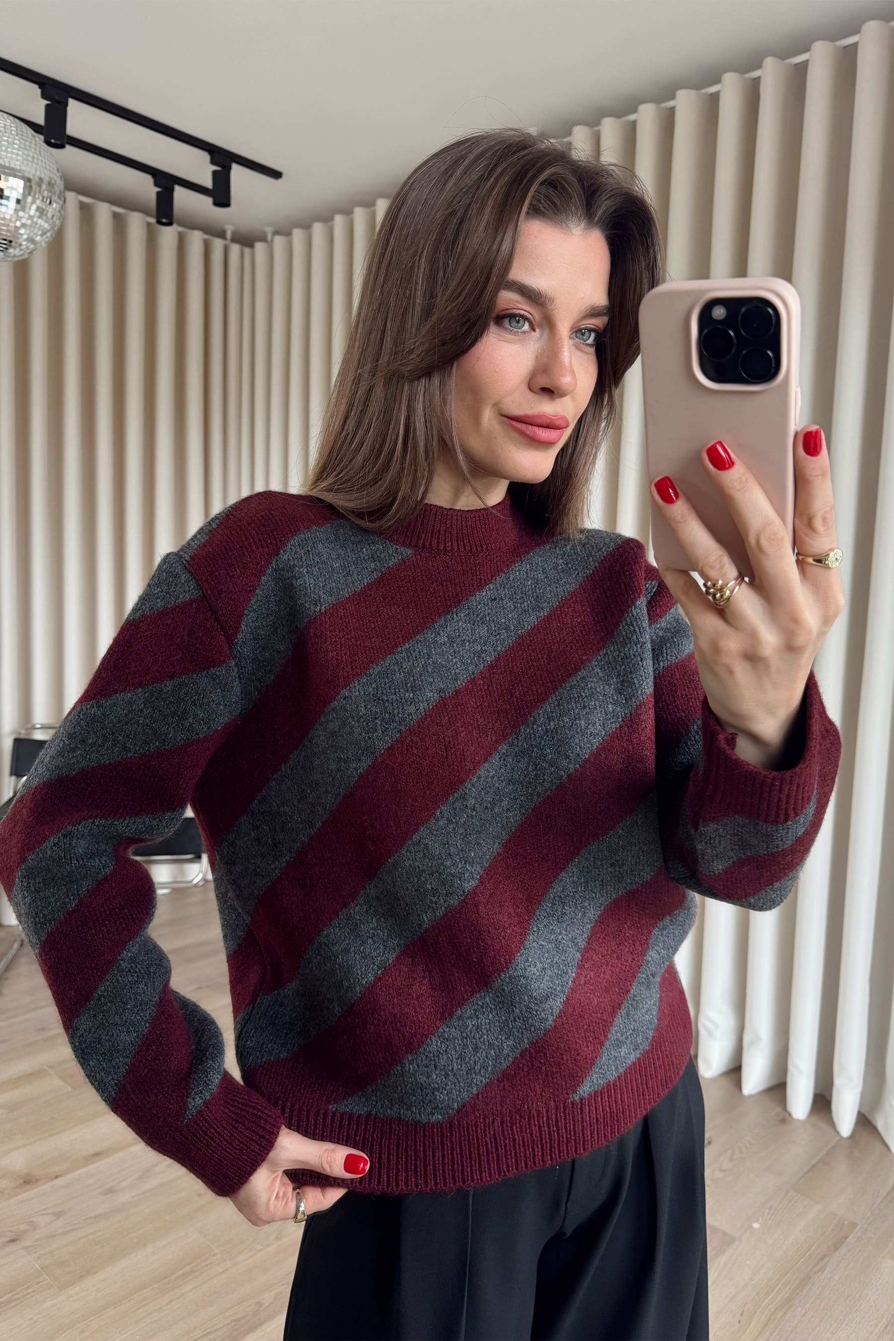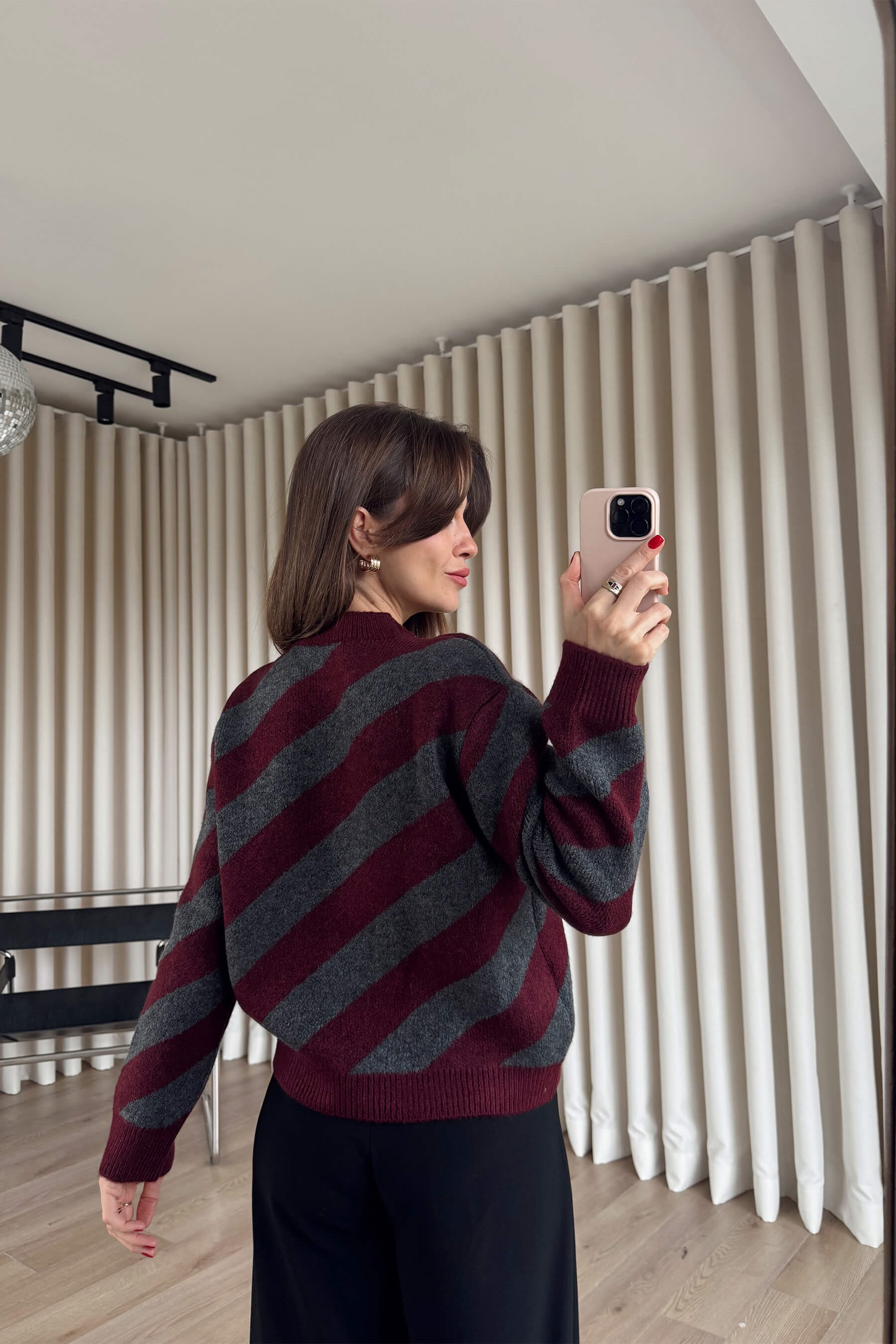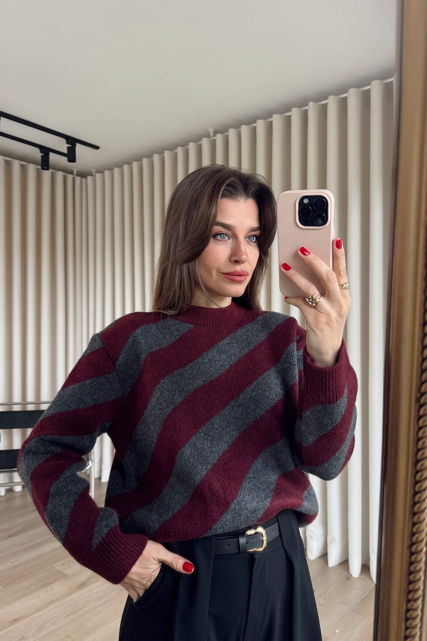 Bordo Antrasit Şeritli Atkılı Oversize Triko Kazak Model Ölçüleri: Boy: 166 cm, Kilo:54 kg Modelin Üzerindeki Beden: Standart Ürünün Uzunluğu: 55 cm (1-2 cm arası değişiklik gösterebilir.) Kumaş Türü: % 80 Akrilik, %13 Polyester, %7 Pbt