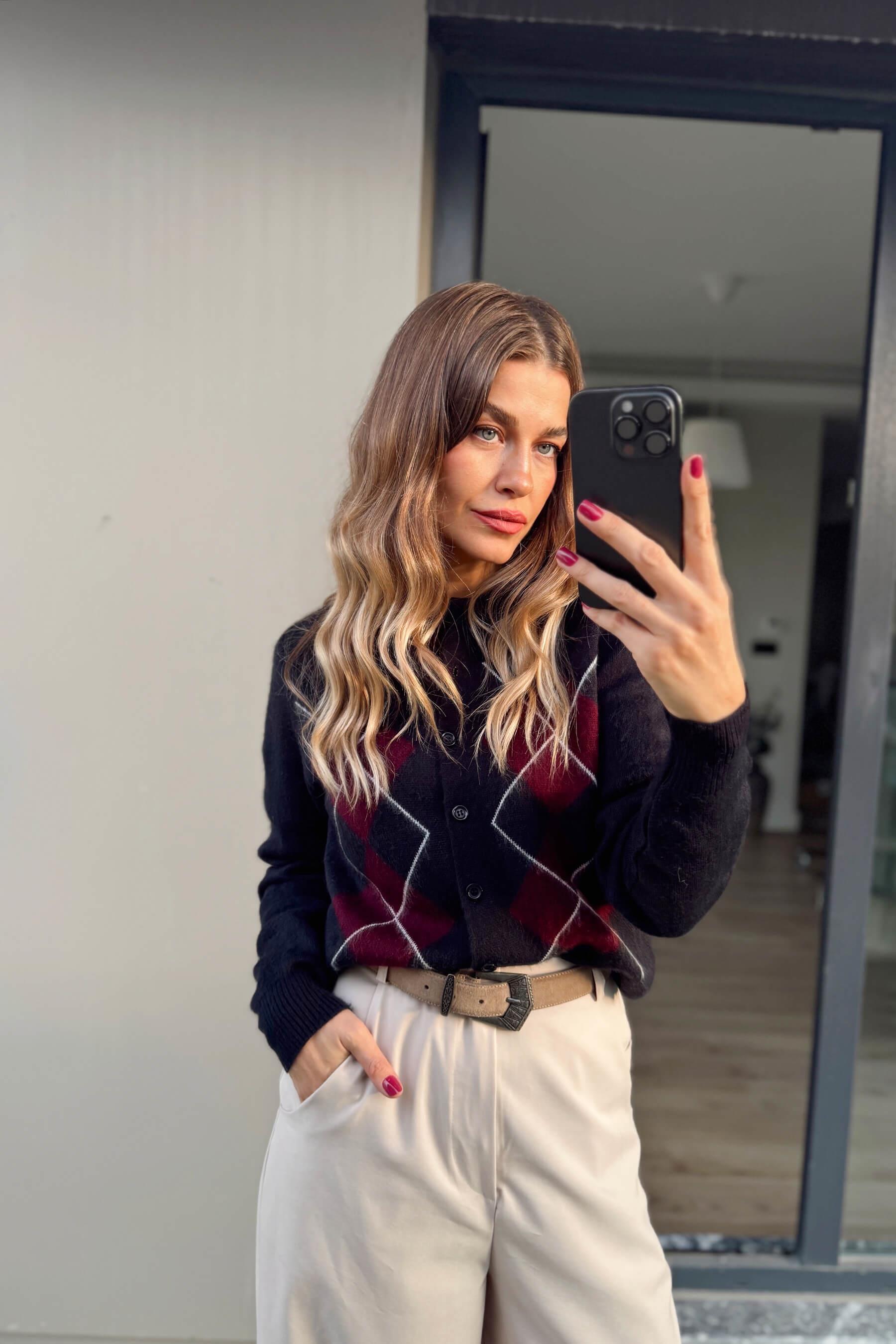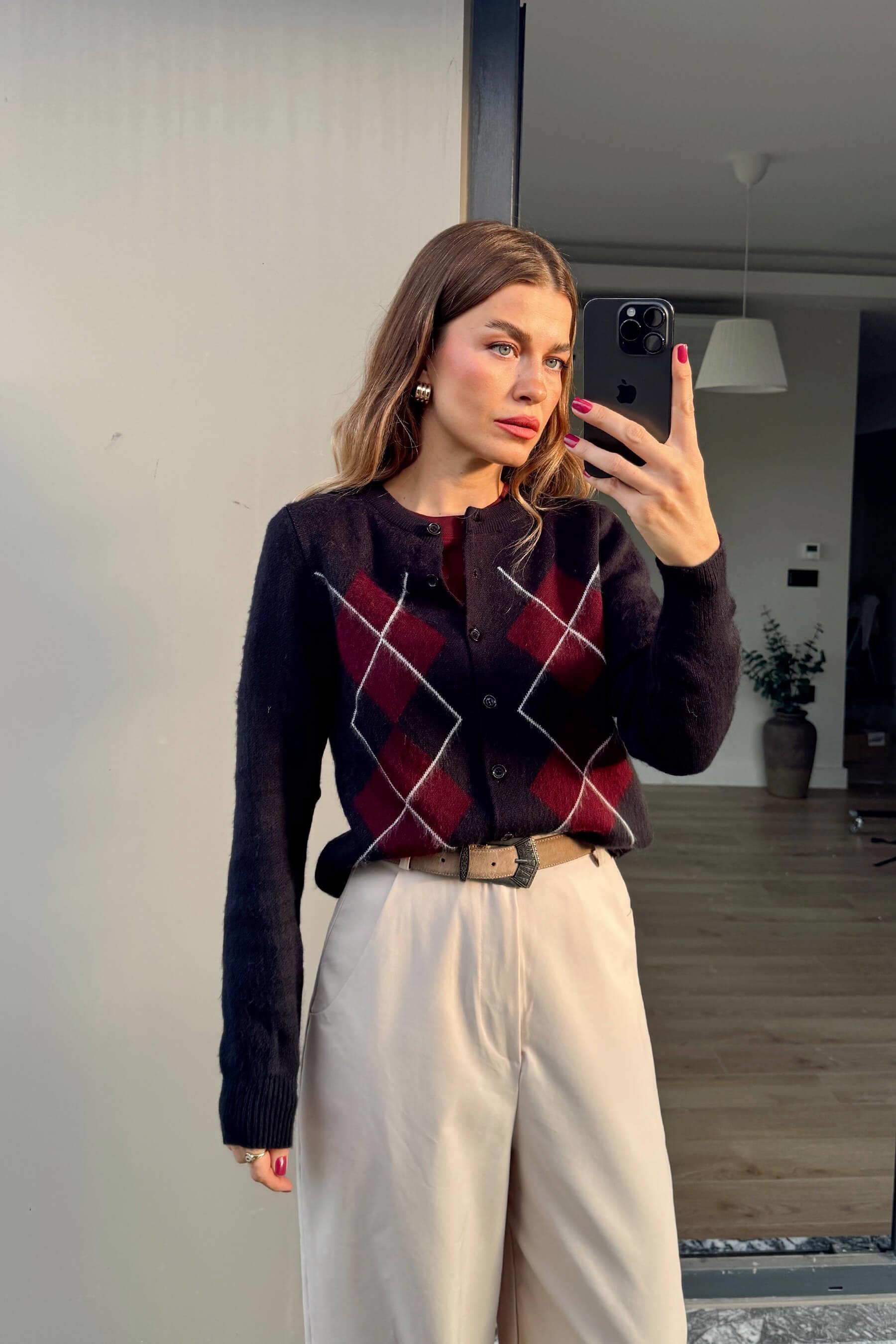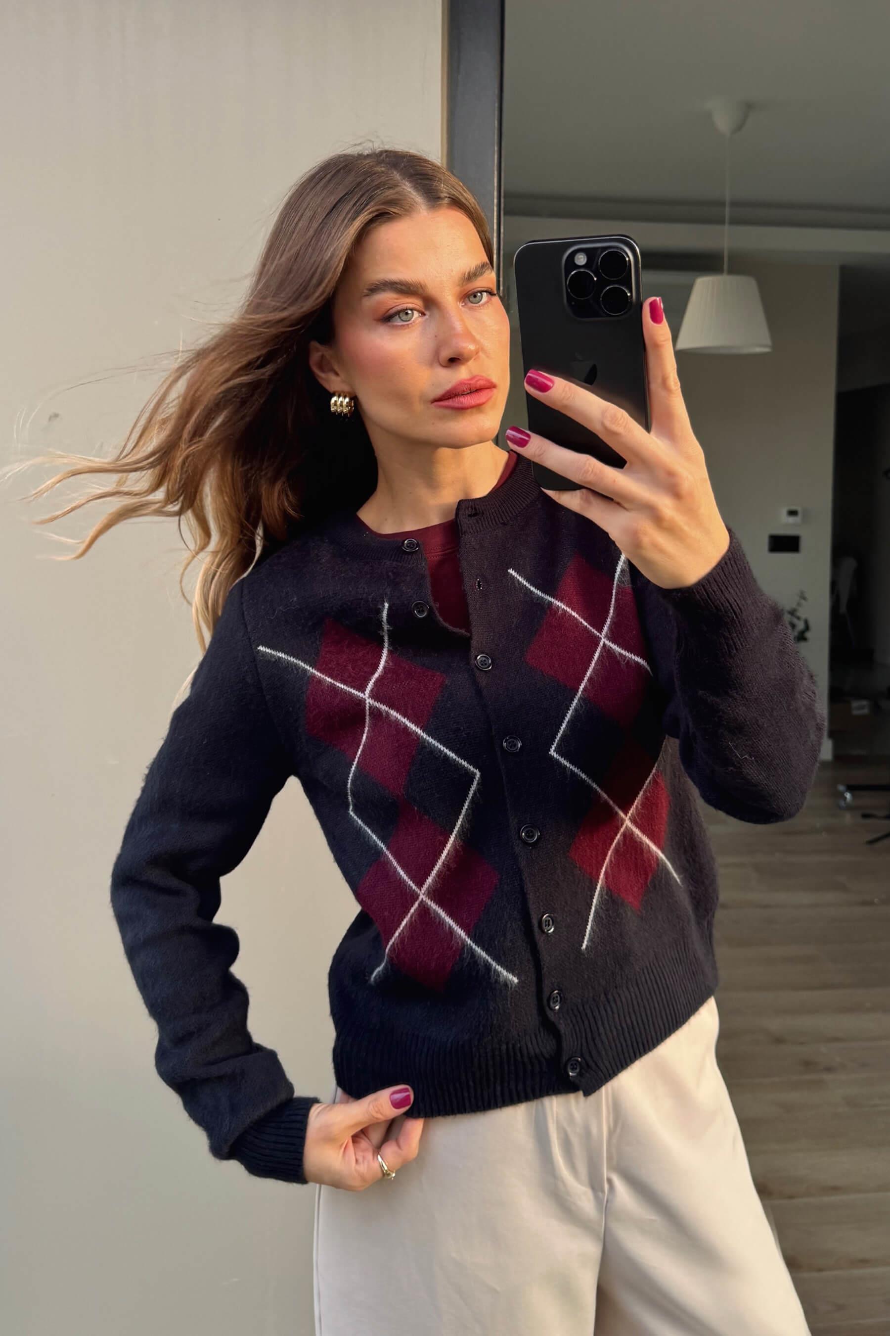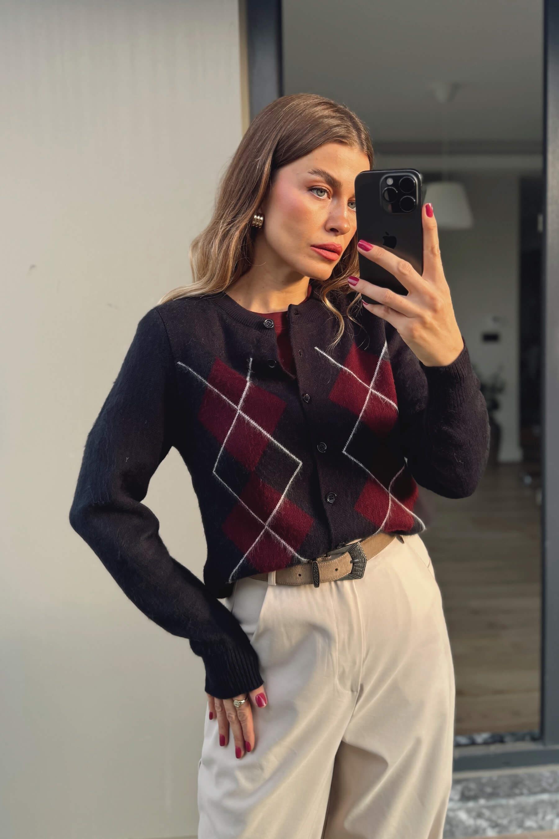 Bordo Baklava Desenli Triko HırkaModel Ölçüleri: Boy: 166 cm, Kilo:54 kg Modelin Üzerindeki Beden: Standart Ürünün Uzunluğu:56 cm (1-2 cm arası değişiklik gösterebilir.) Kumaş Türü: Akrilik Yıkama Talimatı : Ürünün iç kısmında bulunan etiketten yıkama talimatına ulaşabilirsiniz.