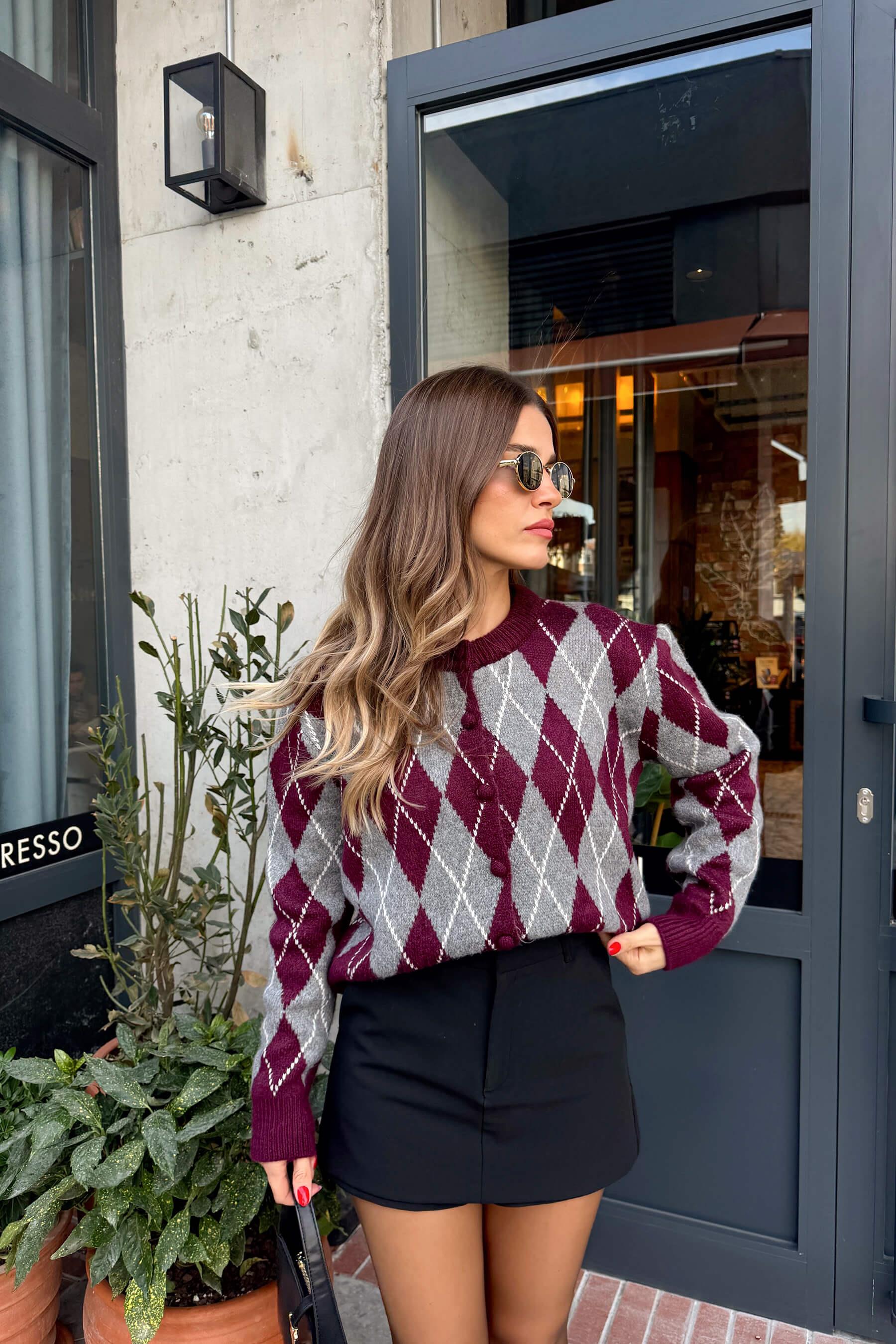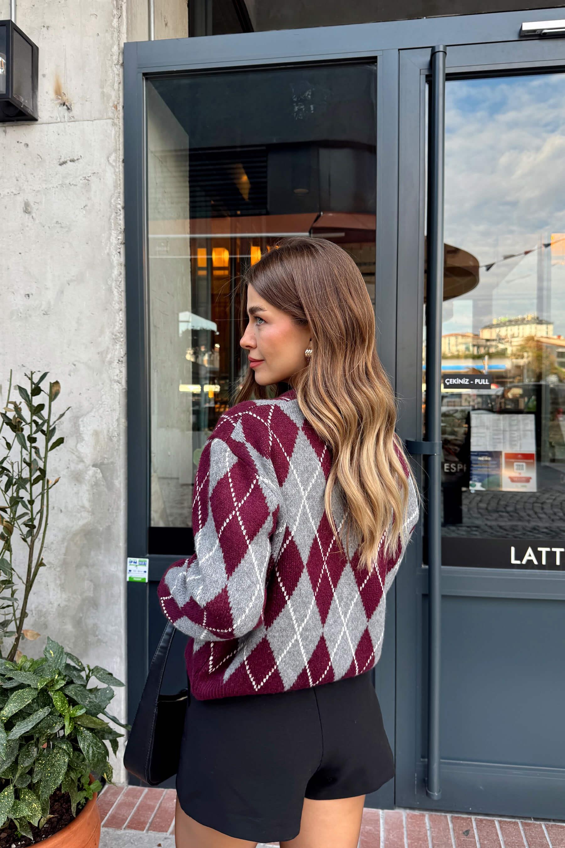 Bordo Gri Baklava Desen Kaplama Düğme Premium Hırka