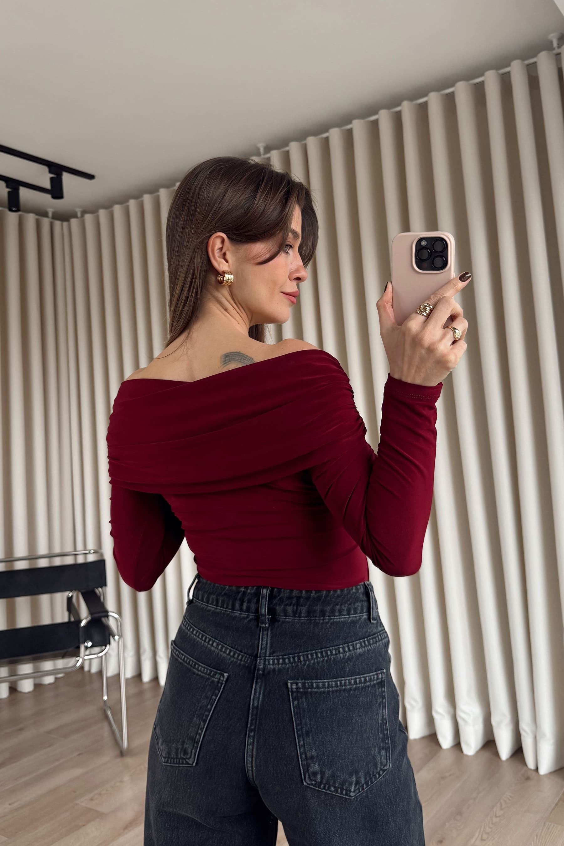 Bordo Omuzdan Çapraz Drapeli Bluz Model Ölçüleri: Boy: 166 cm, Kilo:54 kg Modelin Üzerindeki Beden: S/36 Ürünün Uzunluğu: 47 cm (1-2 cm arası değişiklik gösterebilir.) Kumaş Türü:%95 Polyester, %5 Elestan Yıkama Talimatı : Ürünün iç kısmında bulunan etiketten yıkama talimatına ulaşabilirsiniz.