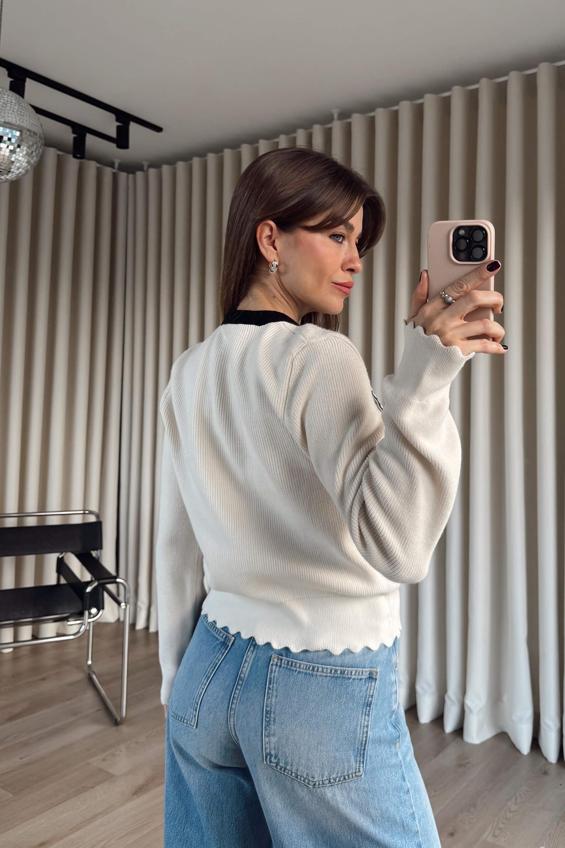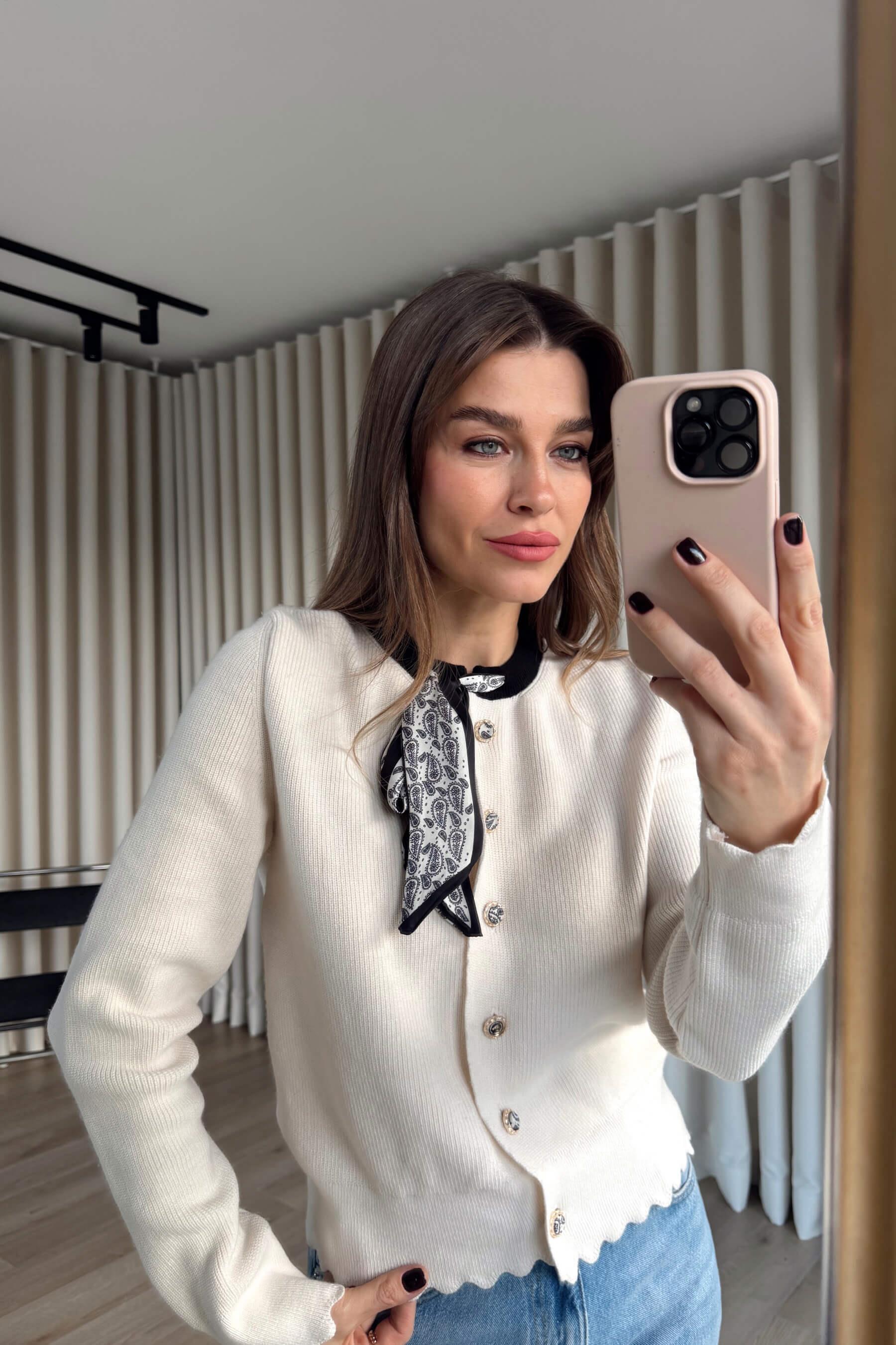 Ekru Siyah Fularlı Premium Düğmeli Triko Hırka