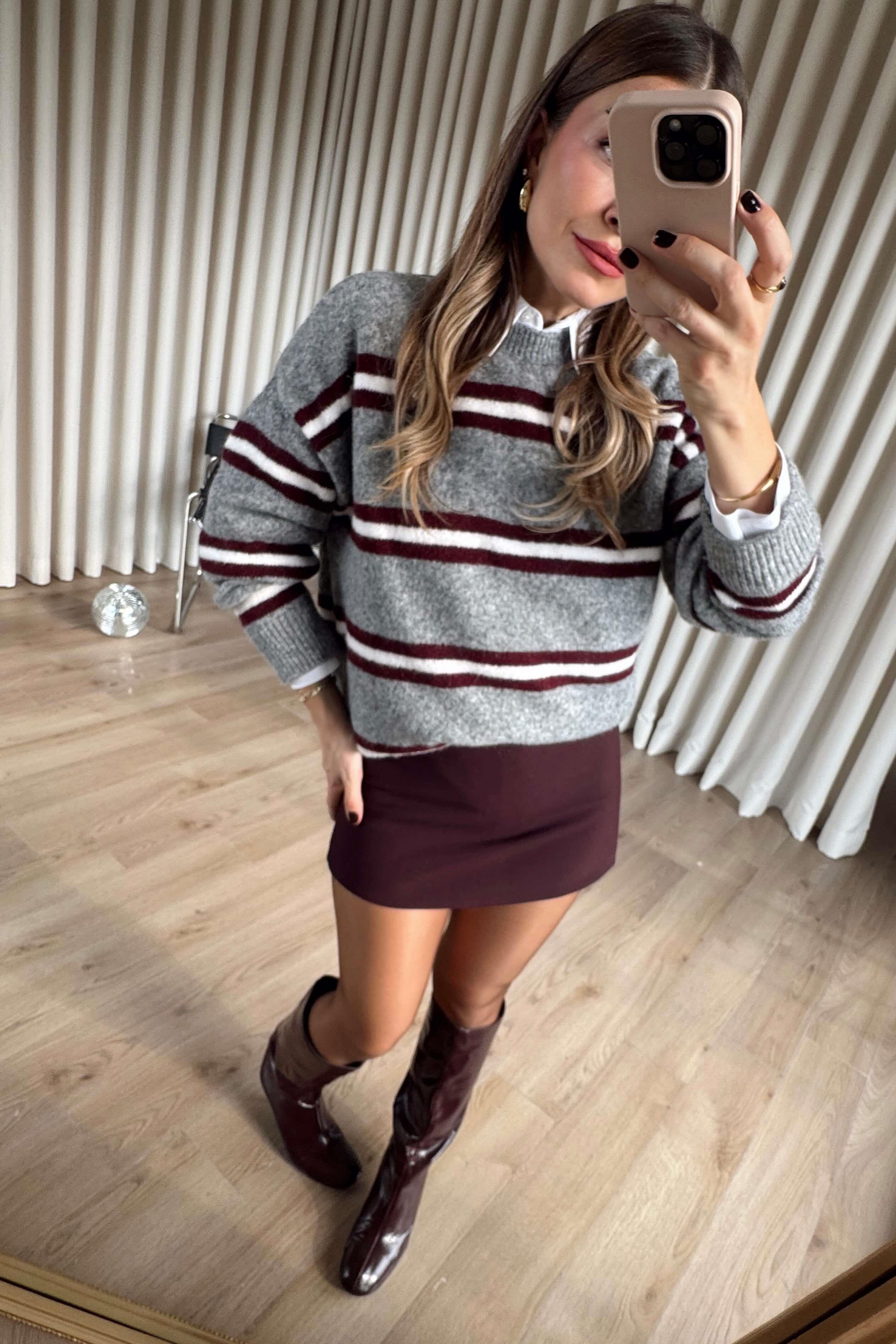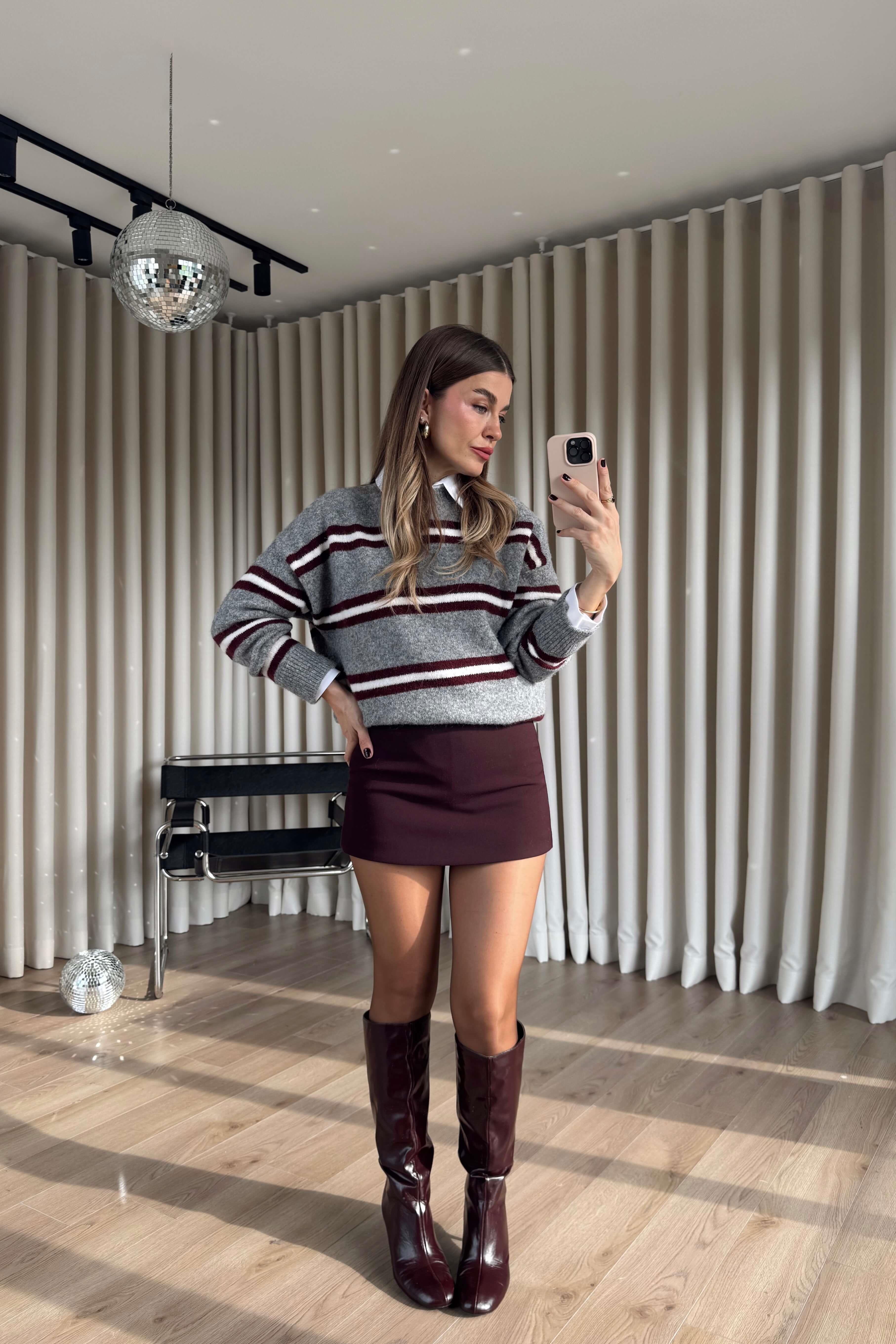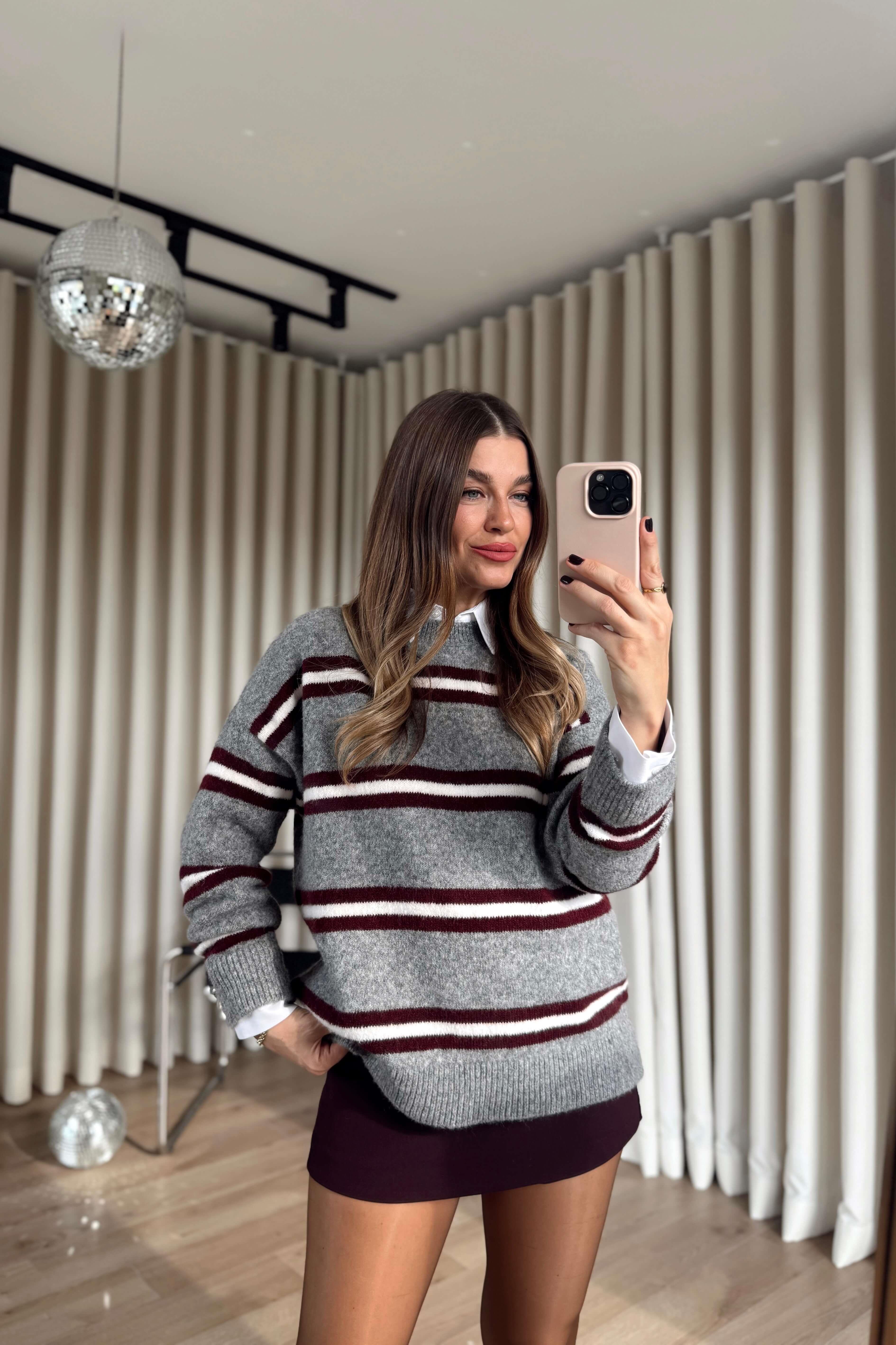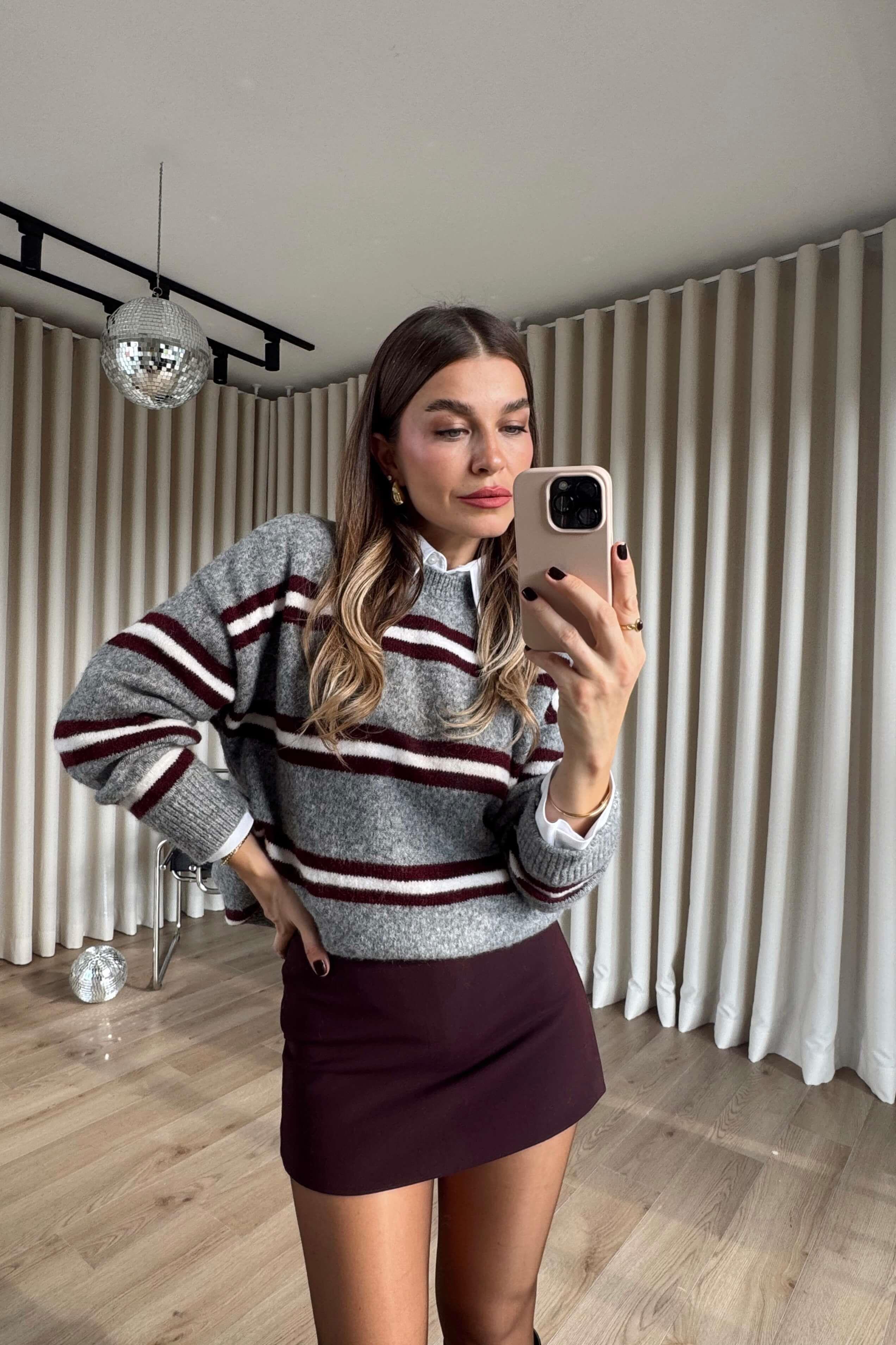 Gri Bordo Şeritli Oversize Yün Dokulu Kazak Model Ölçüleri: Boy: 166 cm, Kilo:54 kg Modelin Üzerindeki Beden: Standart Ürünün Uzunluğu: 65 cm (1-2 cm arası değişiklik gösterebilir.) Kumaş Türü: %39 Akrilik, %29 recycled, %14 Polyester Yıkama Talimatı : Ürünün iç kısmında bulunan etiketten yıkama talimatına ulaşabilirsiniz.