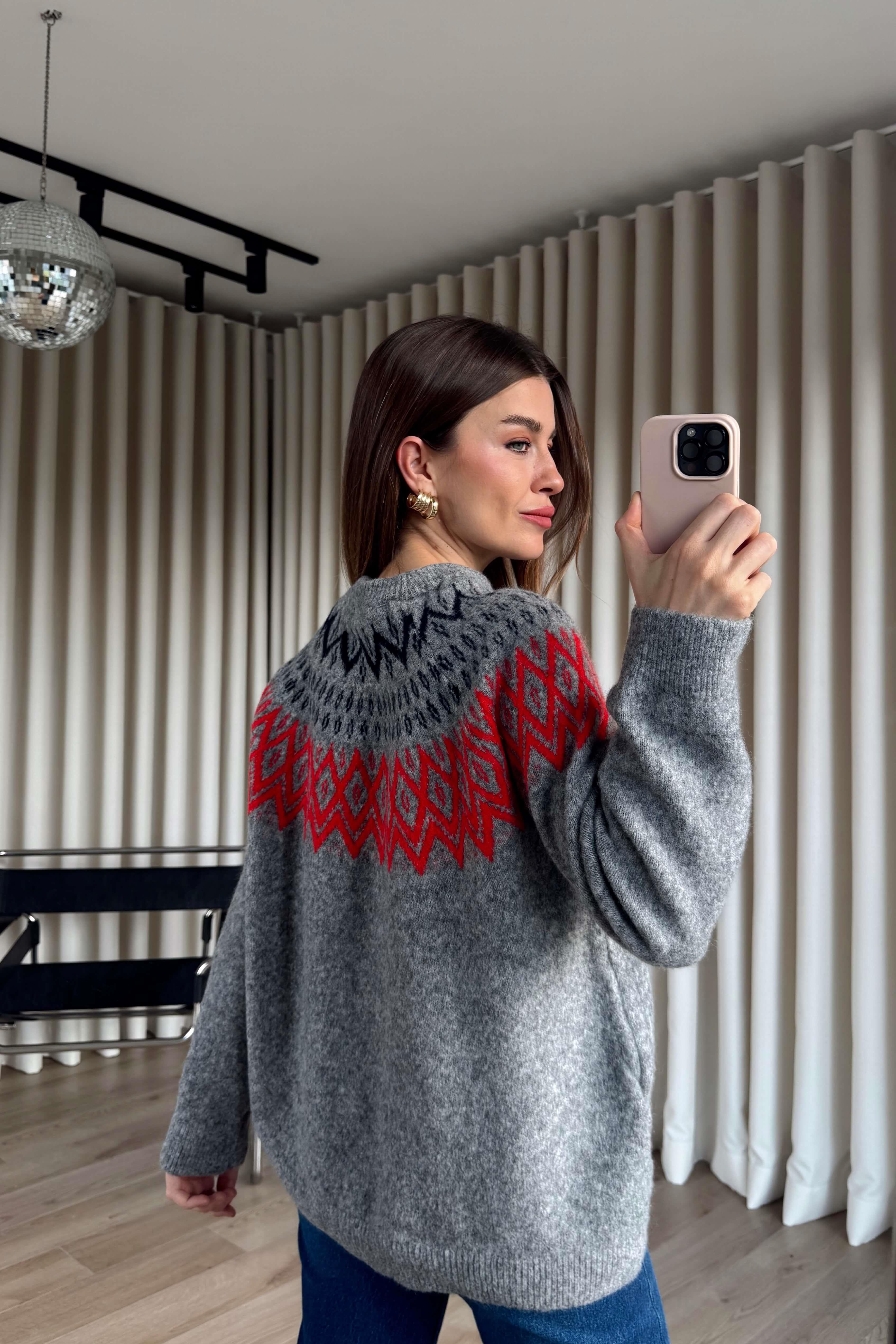 Gri Kırmızı Siyah Yaka Oversize Desenli Triko Kazak Model Ölçüleri: Boy: 166 cm, Kilo:54 kg Modelin Üzerindeki Beden: Standart Ürünün Uzunluğu: 70 cm (1-2 cm arası değişiklik gösterebilir.) Kumaş Türü: %39 Akrilik, %29 Rcl, %14 Polyester, %9 Naylon, %5 Yün, %4 Spandex