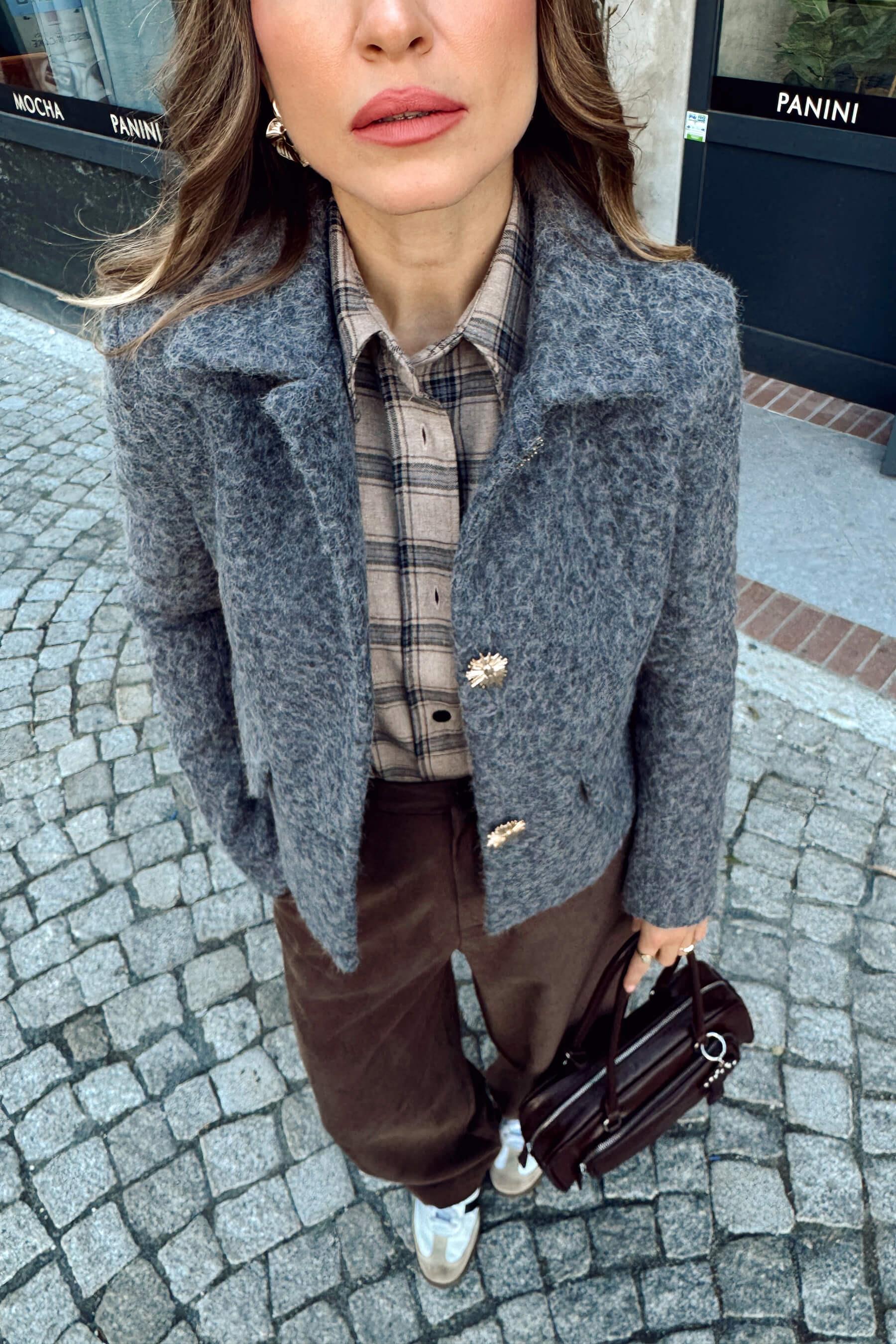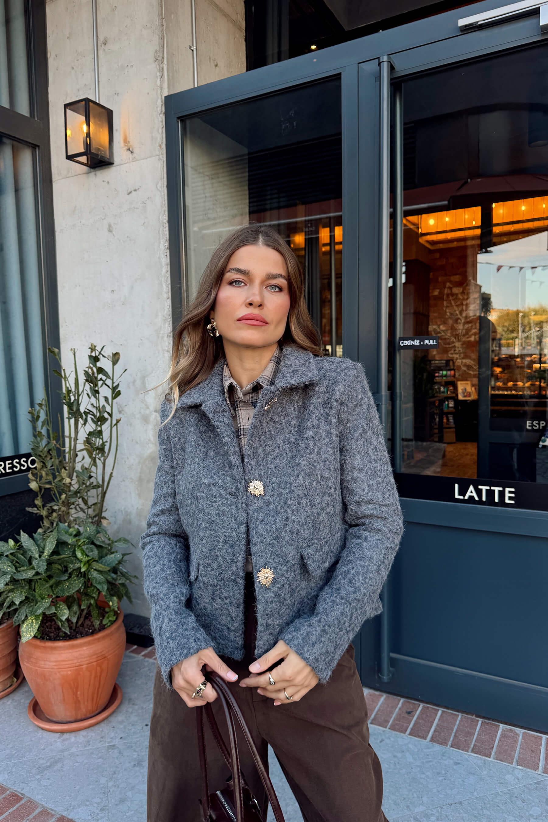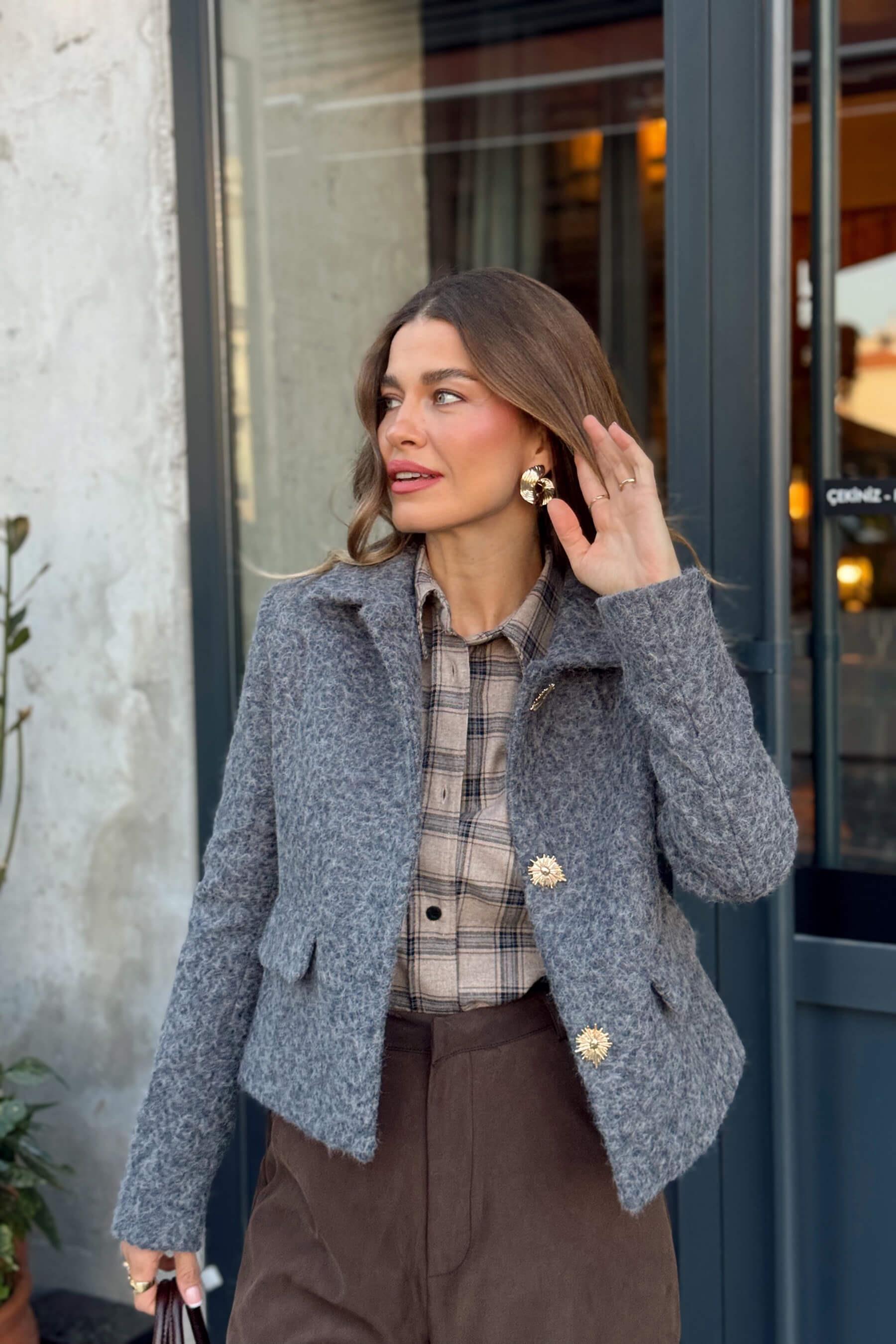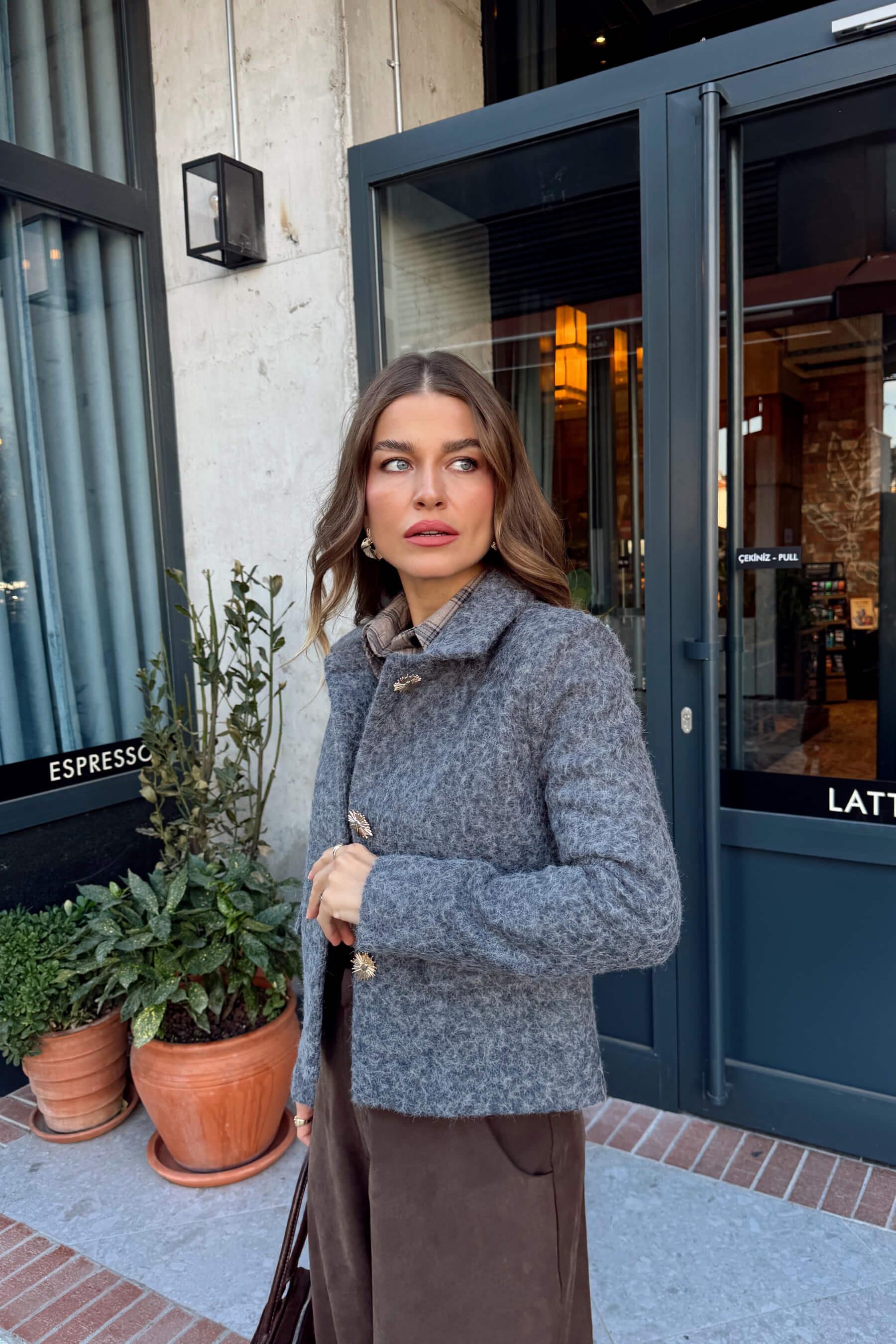 Gri Tüylü Dokulu Astarlı Yıldız Düğmeli Fit Yünlü Ceket