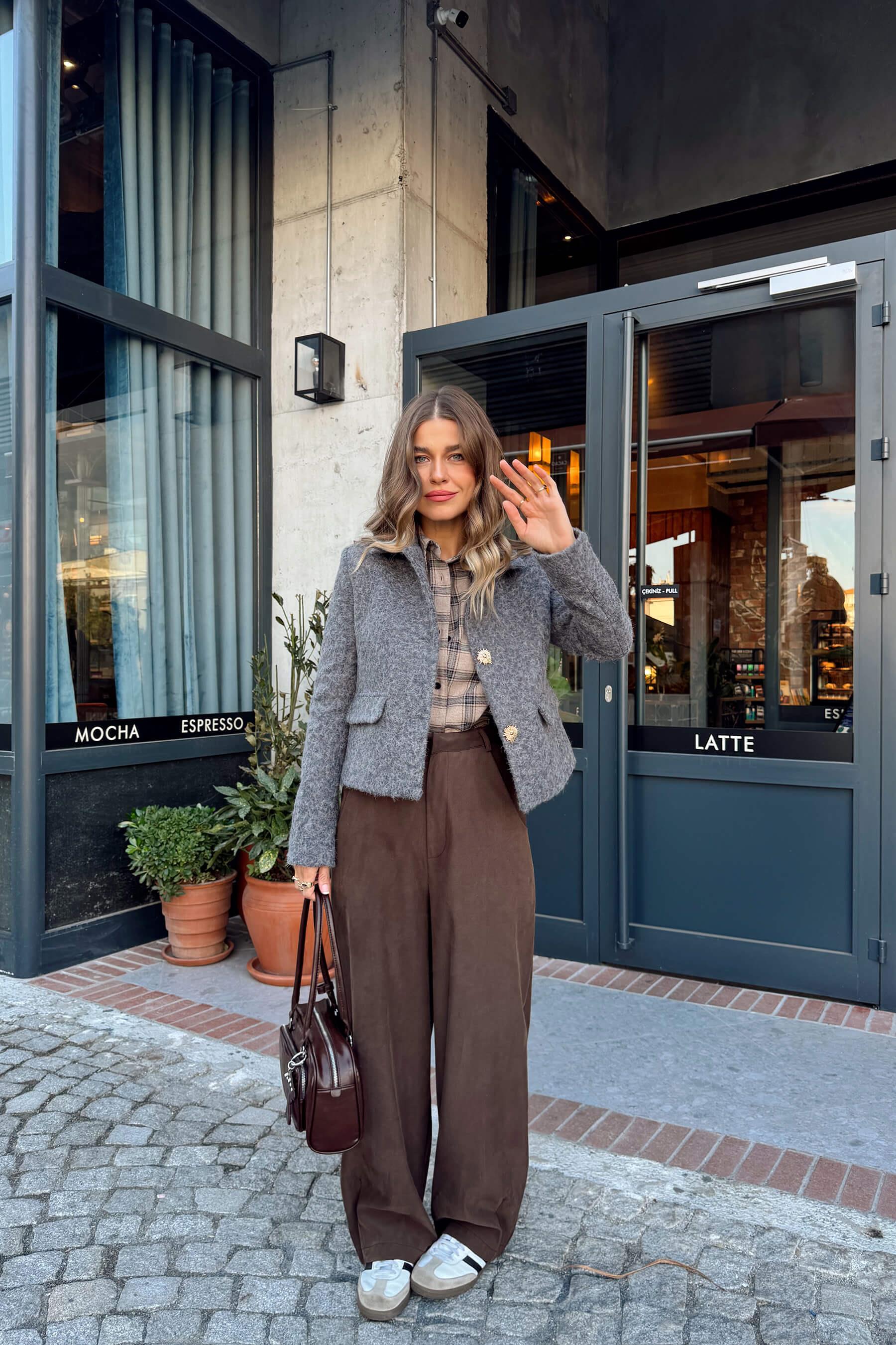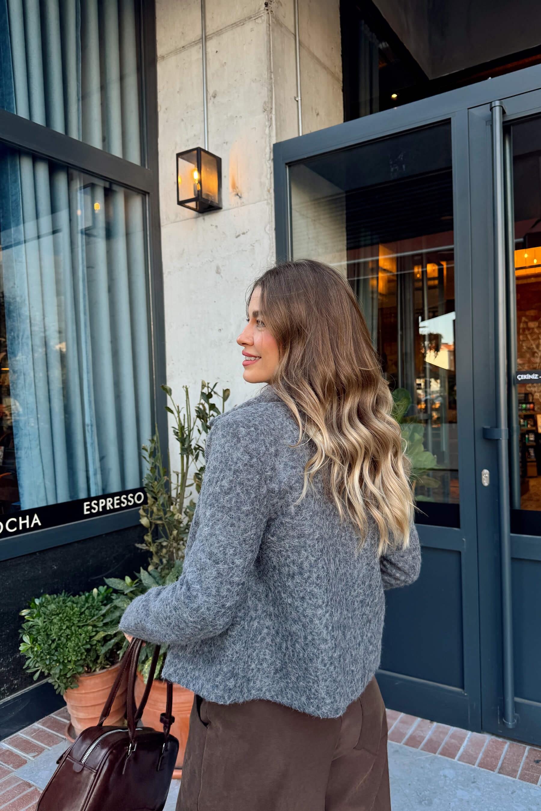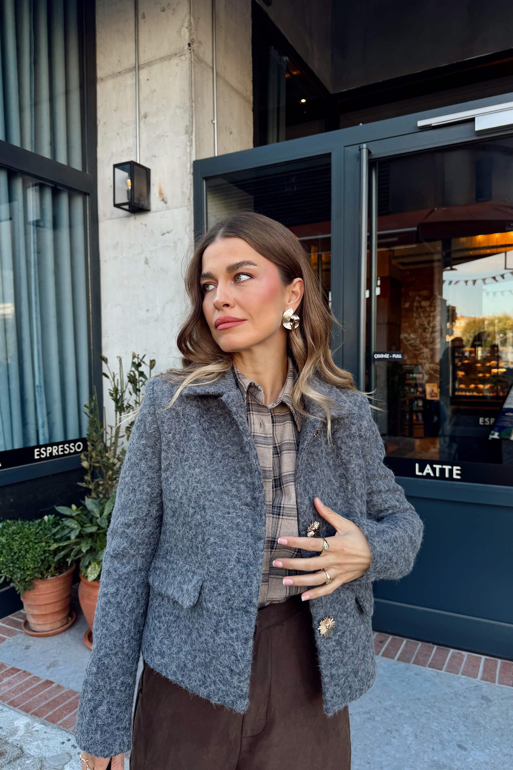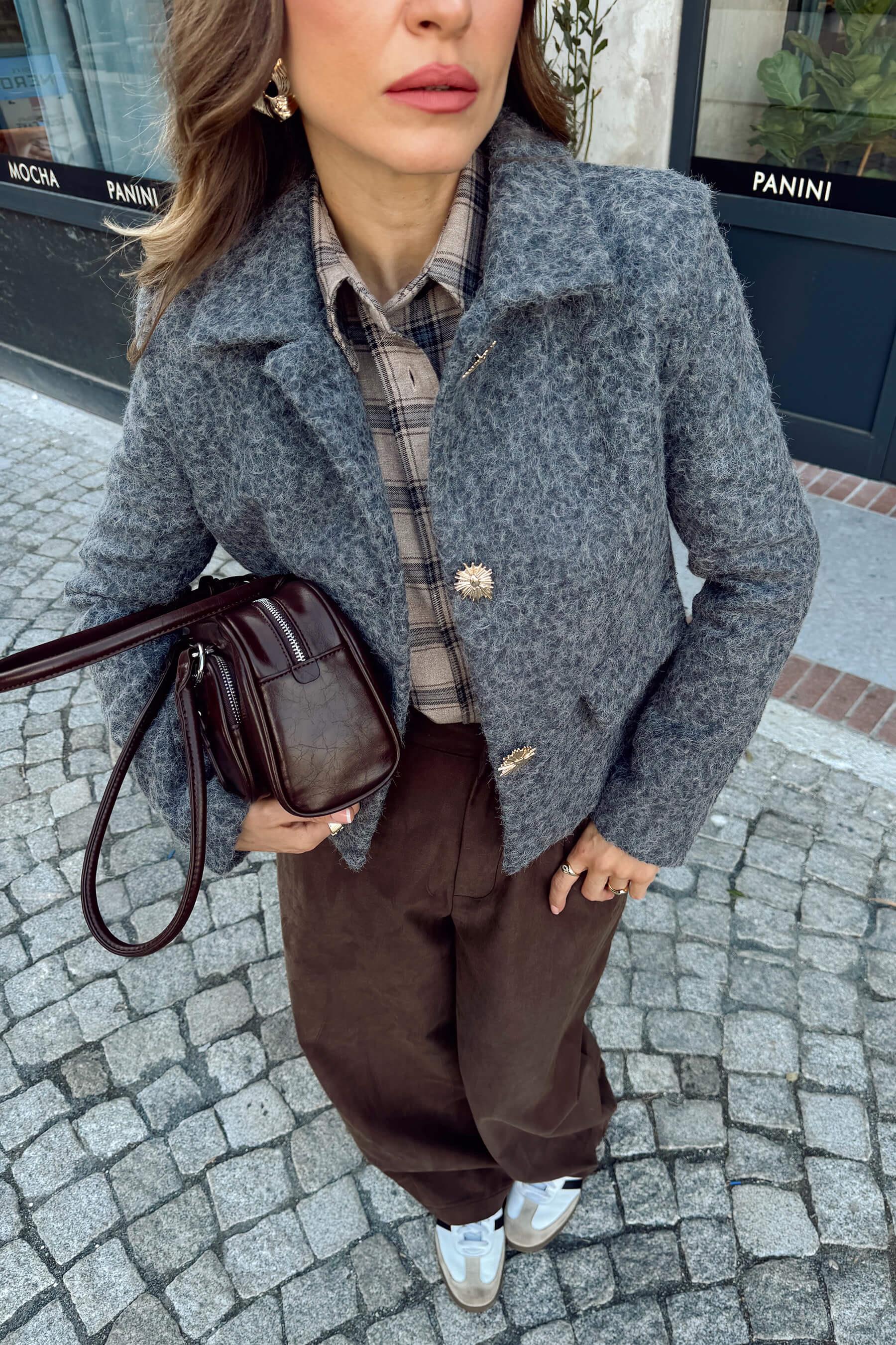 Gri Tüylü Dokulu Astarlı Yıldız Düğmeli Fit Yünlü Ceket