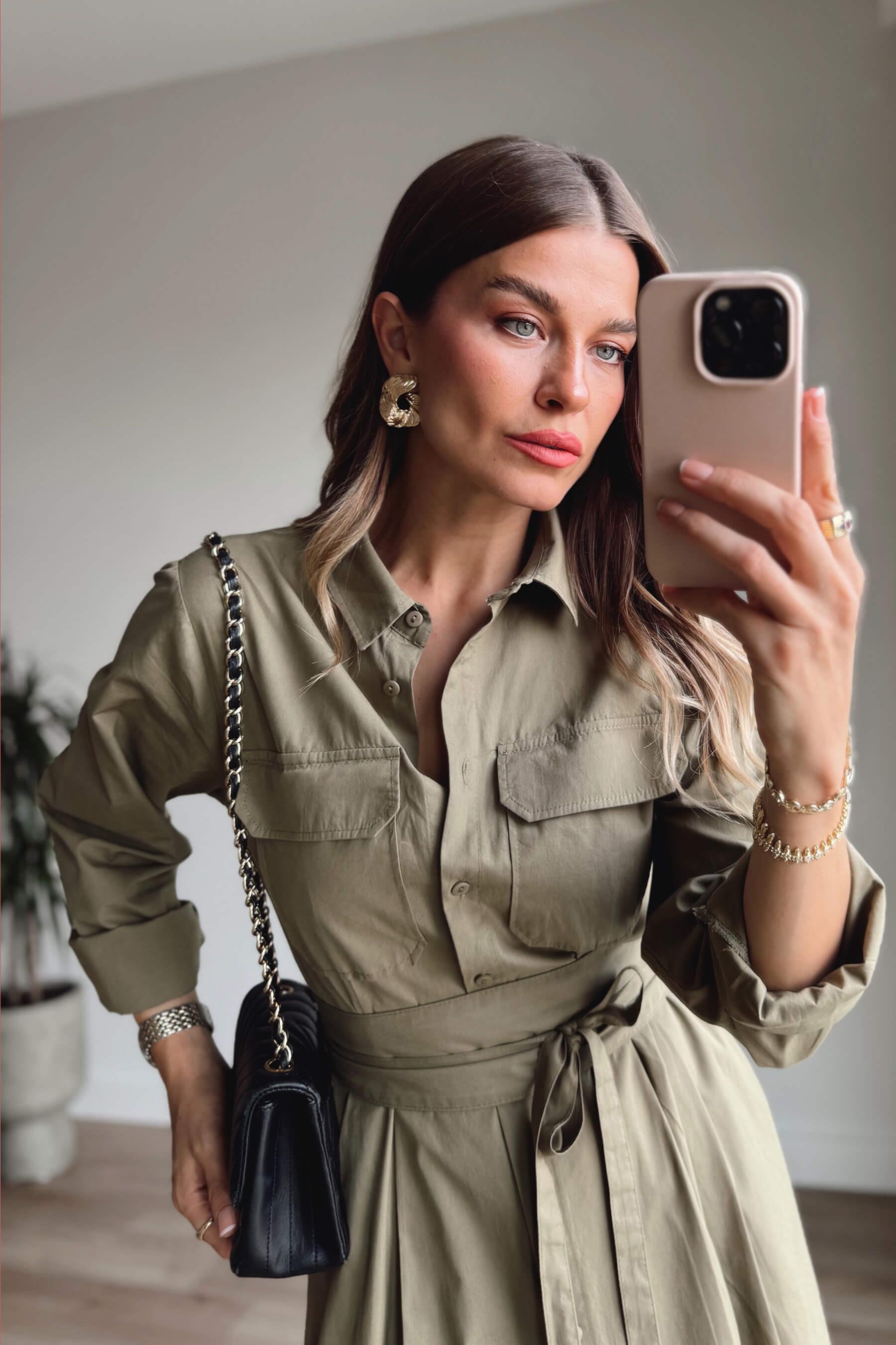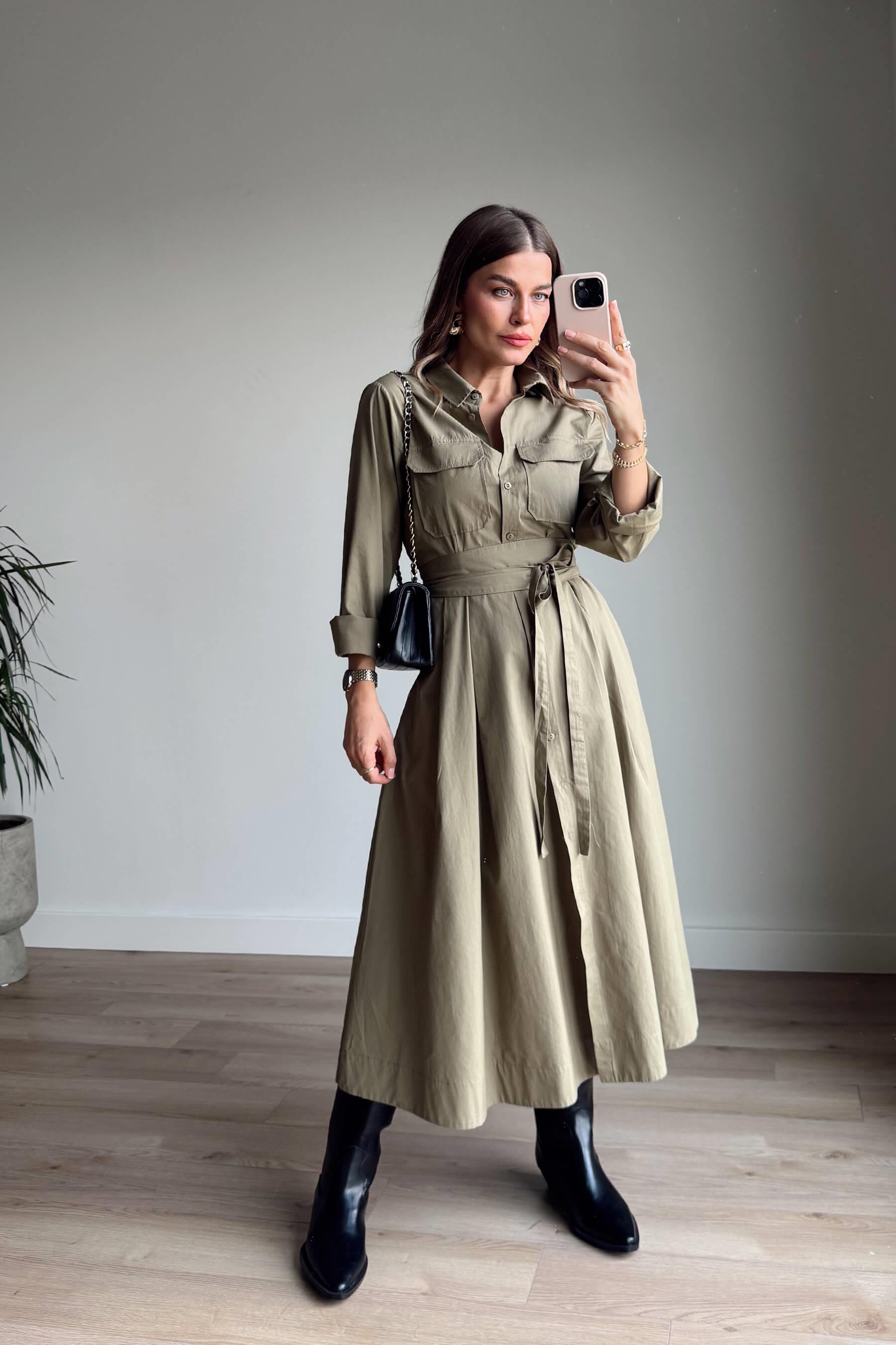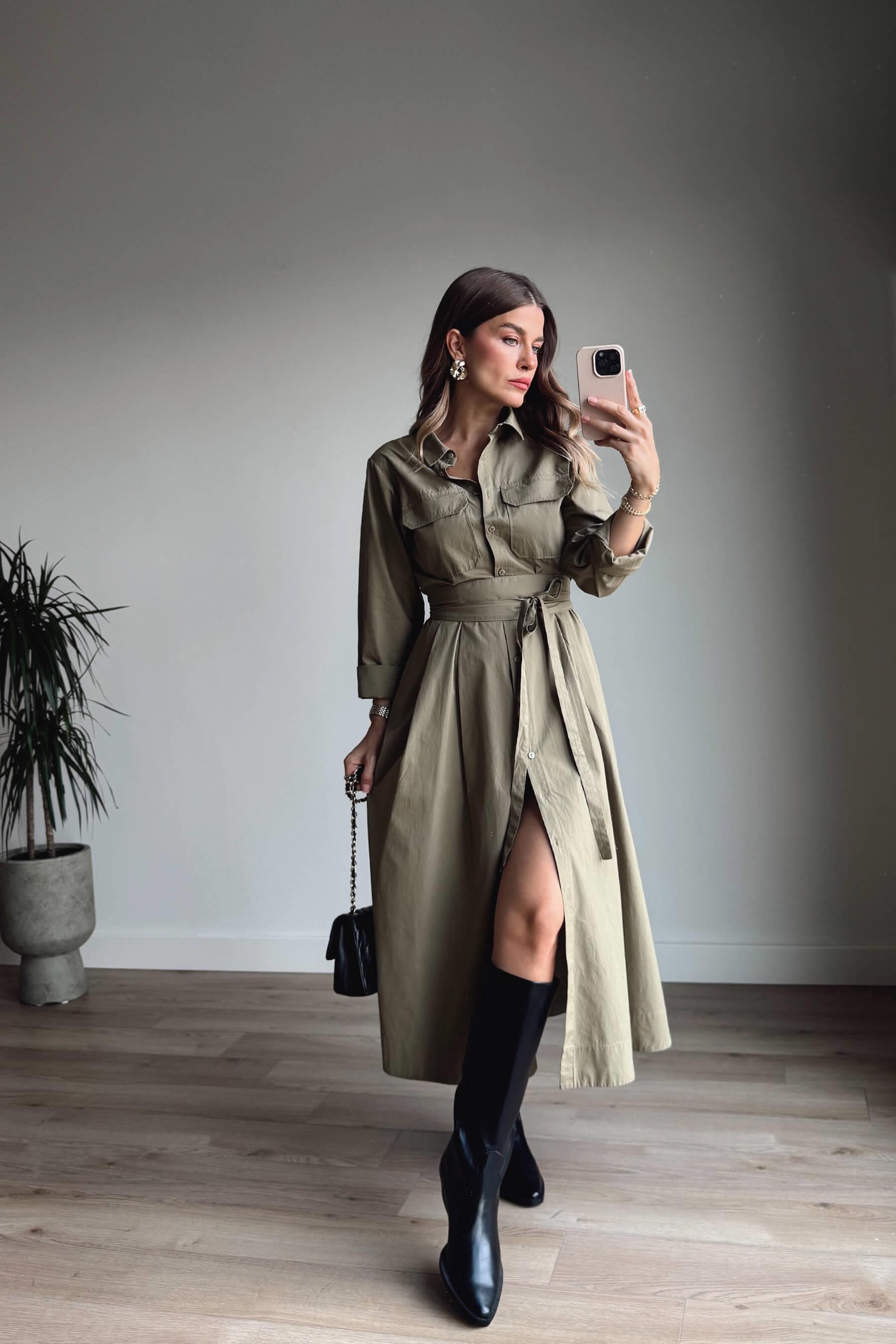 Haki Korseli Cep Detaylı Maxi Gömlek Elbise Model Ölçüleri: Boy: 166 cm, Kilo:54 kg Modelin Üzerindeki Beden: S/36 Ürünün Uzunluğu: 120 cm (1-2 cm arası değişiklik gösterebilir.) Kumaş Türü: Pamuk Yıkama Talimatı : Ürünün iç kısmında bulunan etiketten yıkama talimatına ulaşabilirsiniz.