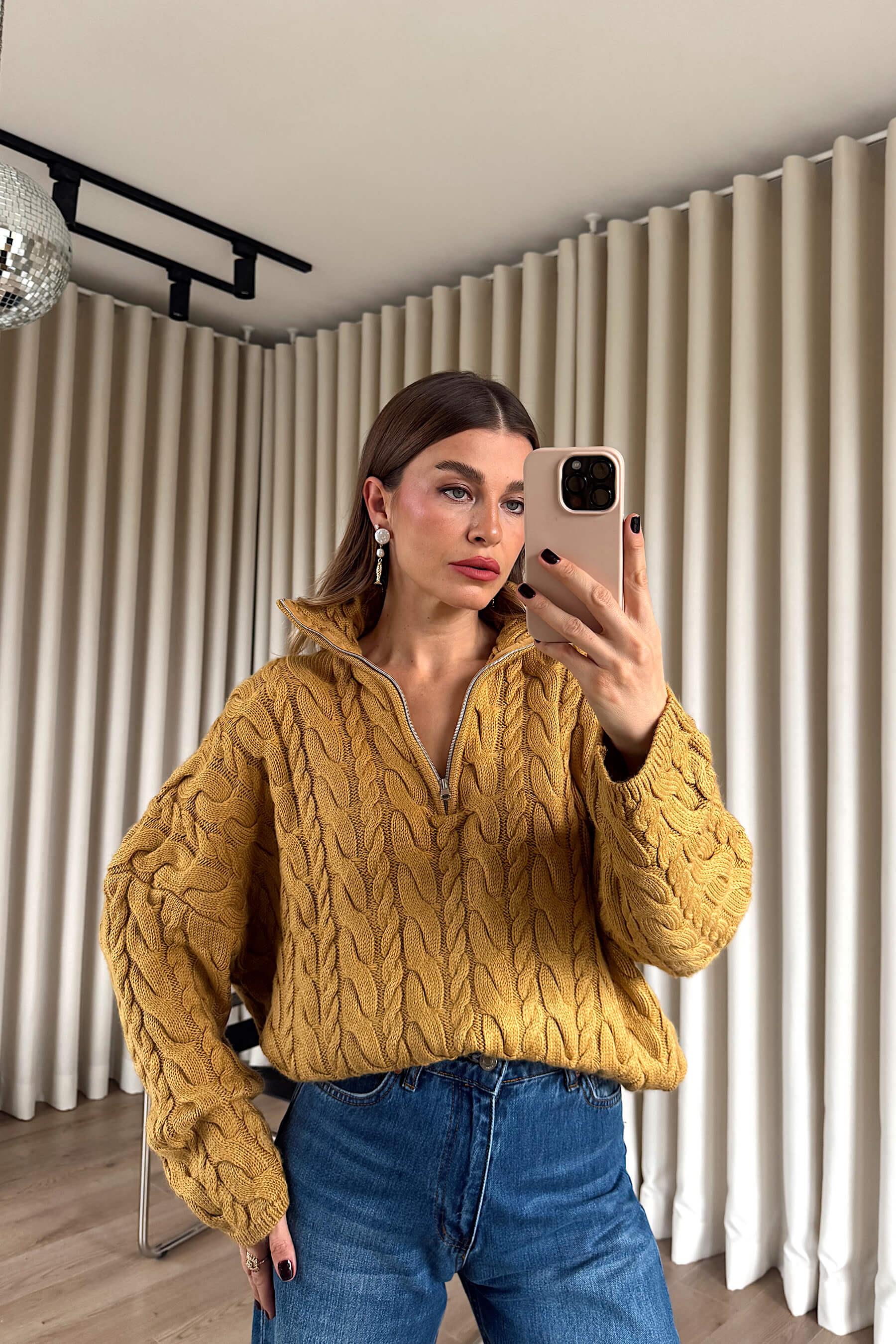 Hardal Fermuarlı Saç Örgü Kazak Model Ölçüleri: Boy: 166 cm, Kilo:54 kg Modelin Üzerindeki Beden: Standart Ürünün Uzunluğu: 61 cm (1-2 cm arası değişiklik gösterebilir.) Kumaş Türü: %100 Akrilik Yıkama Talimatı : Ürünün iç kısmında bulunan etiketten yıkama talimatına ulaşabilirsiniz.