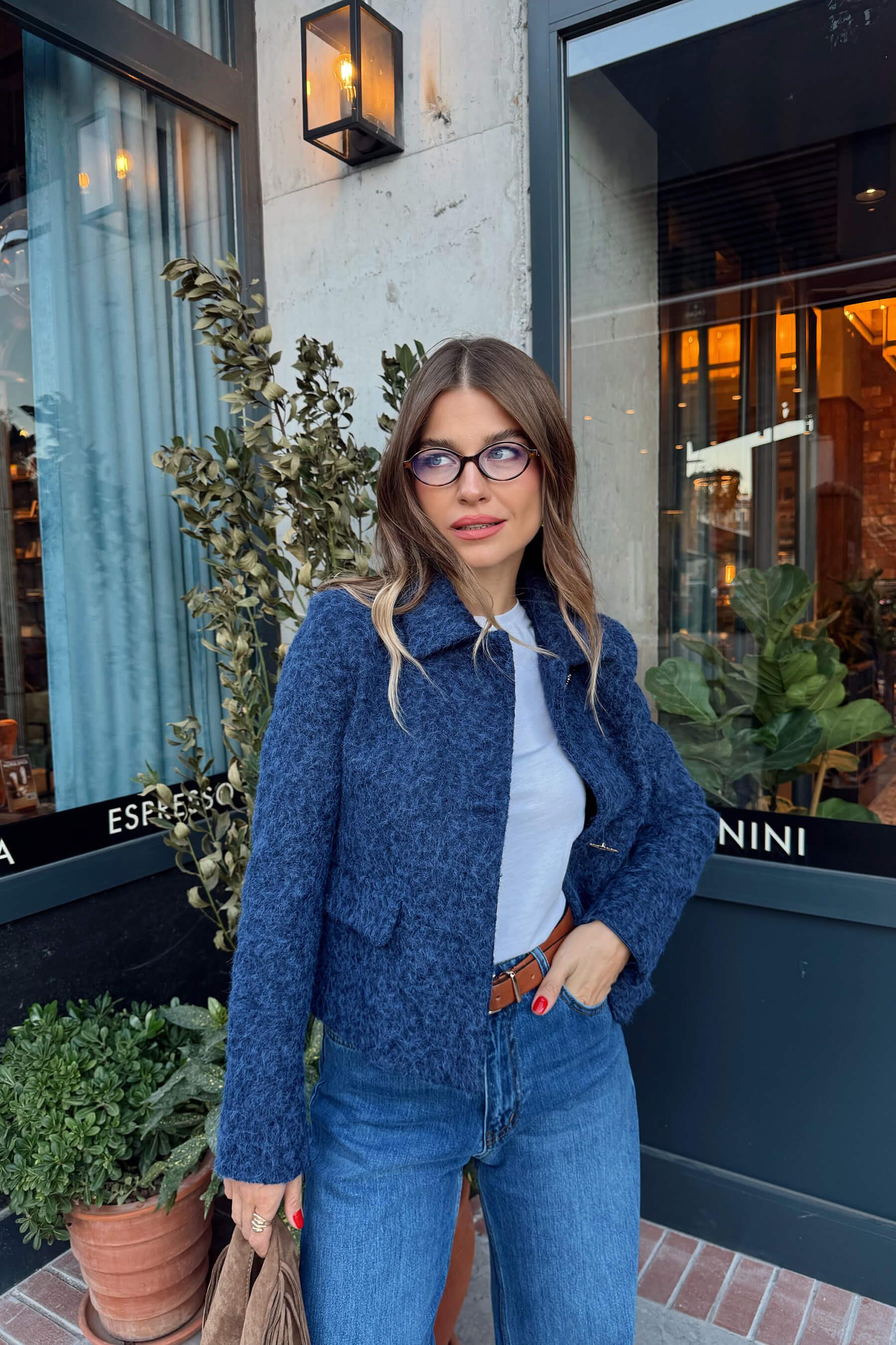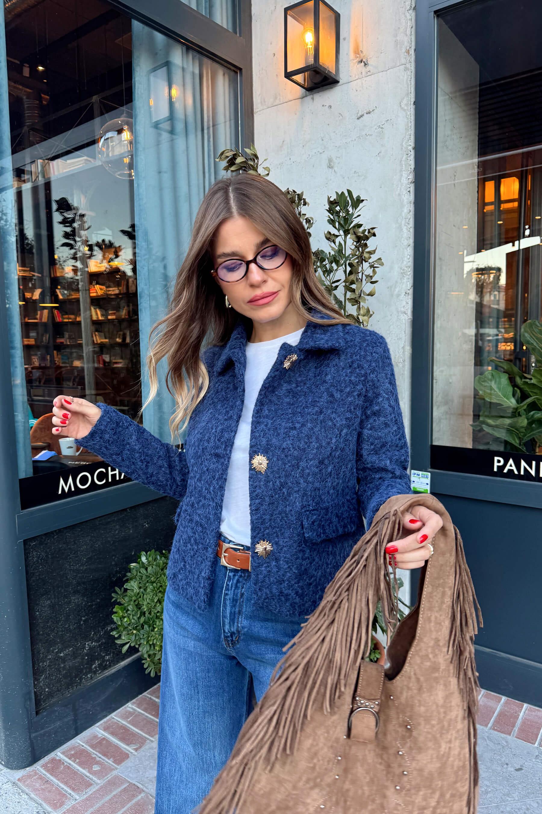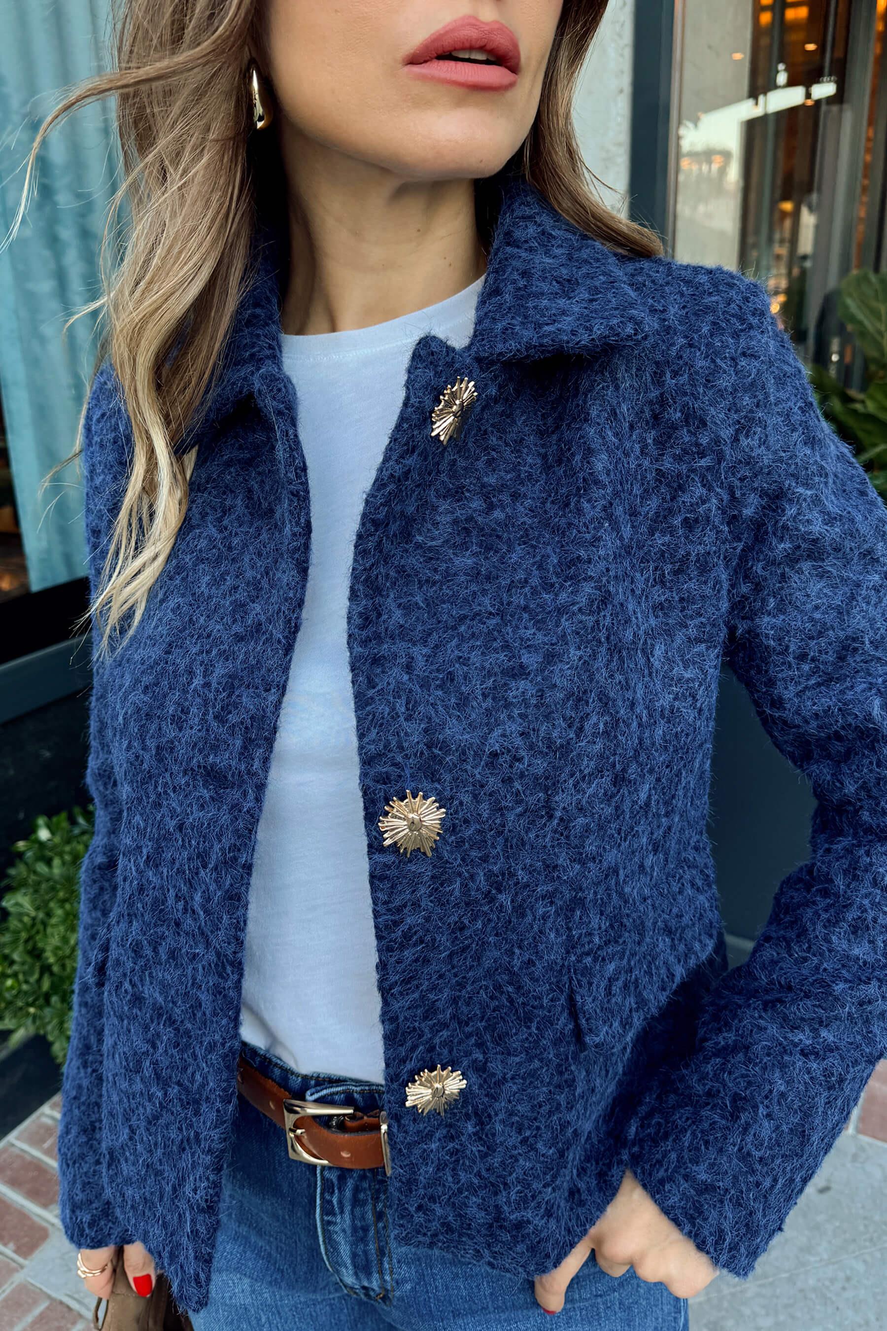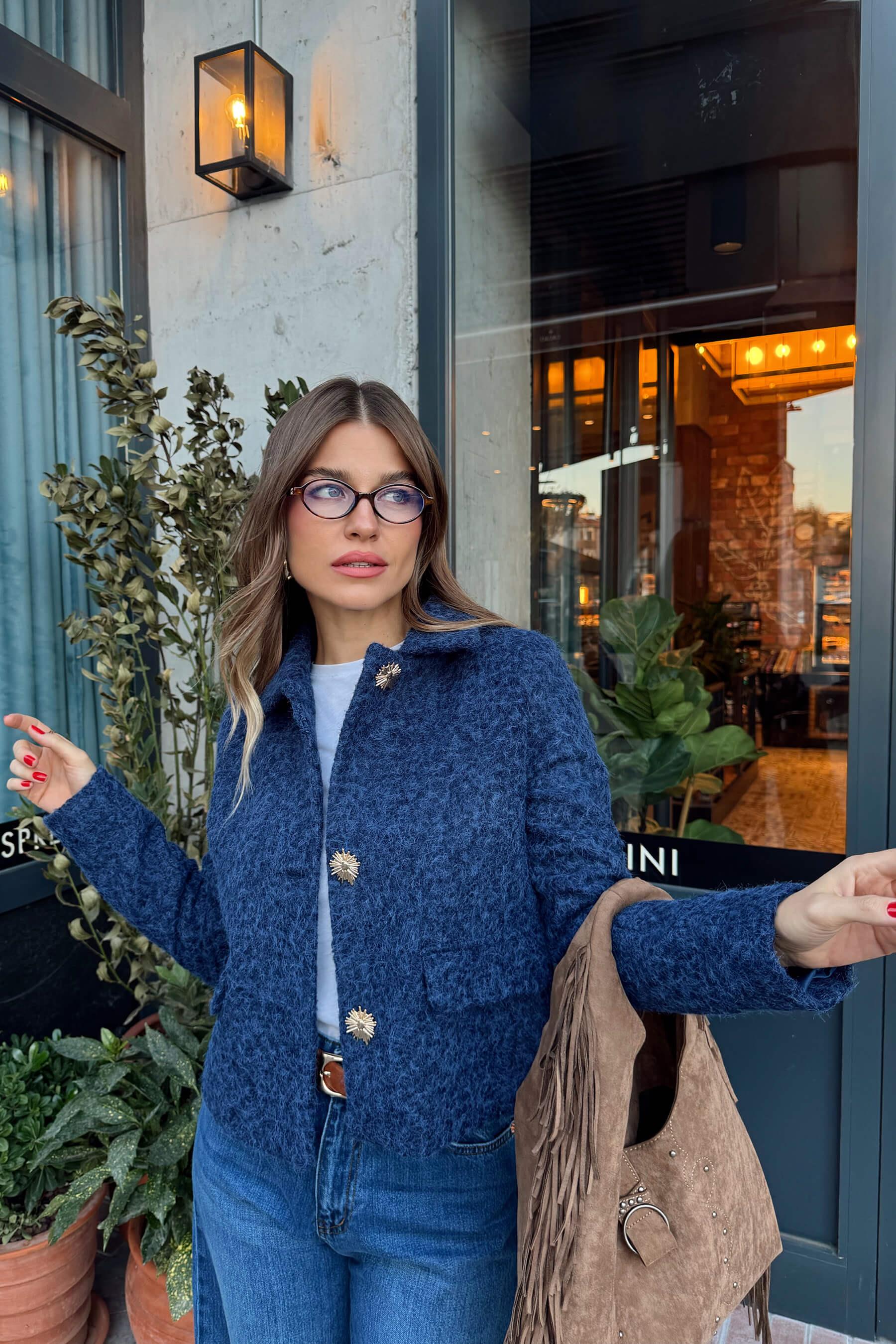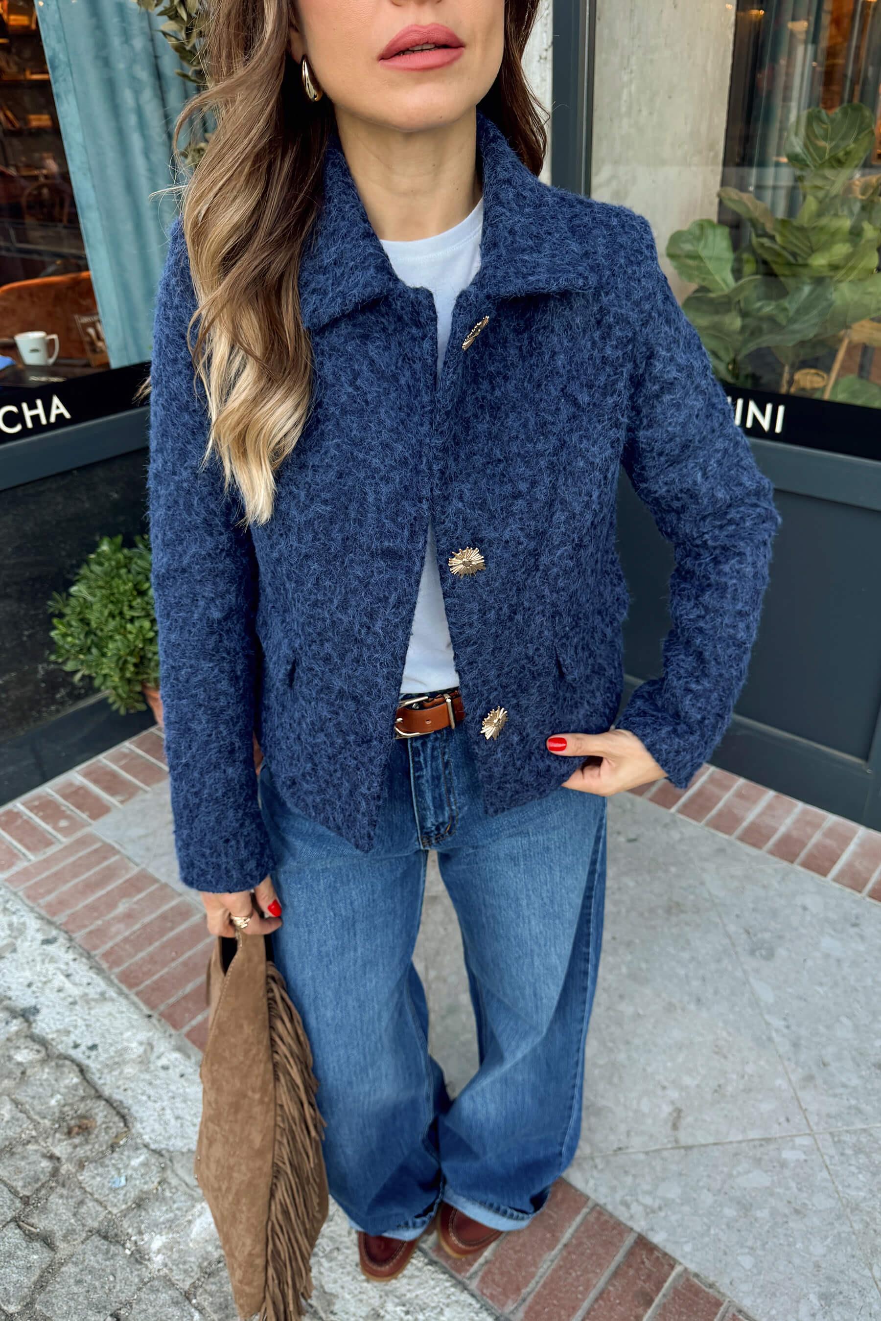 İndigo Tüylü Dokulu Astarlı Yıldız Düğmeli Fit Yünlü Ceket