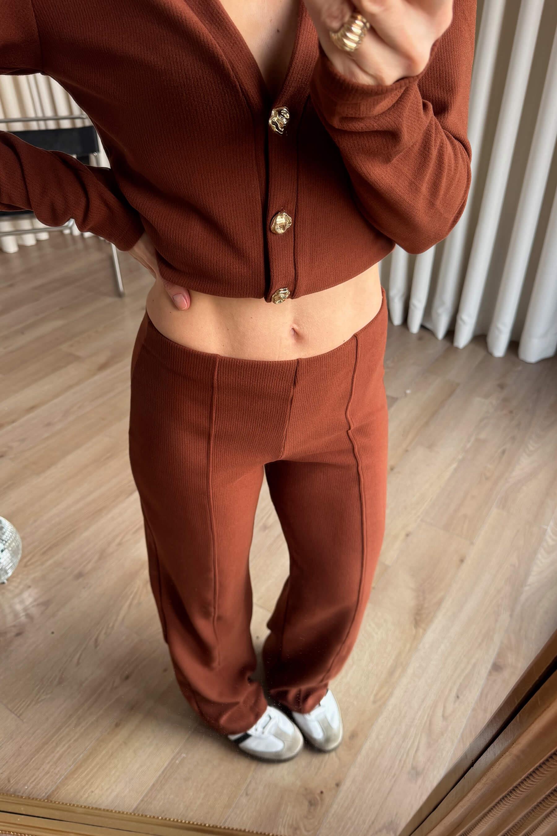 Kahve Gold Düğmeli Bluz Pantolon Soft Touch Takım