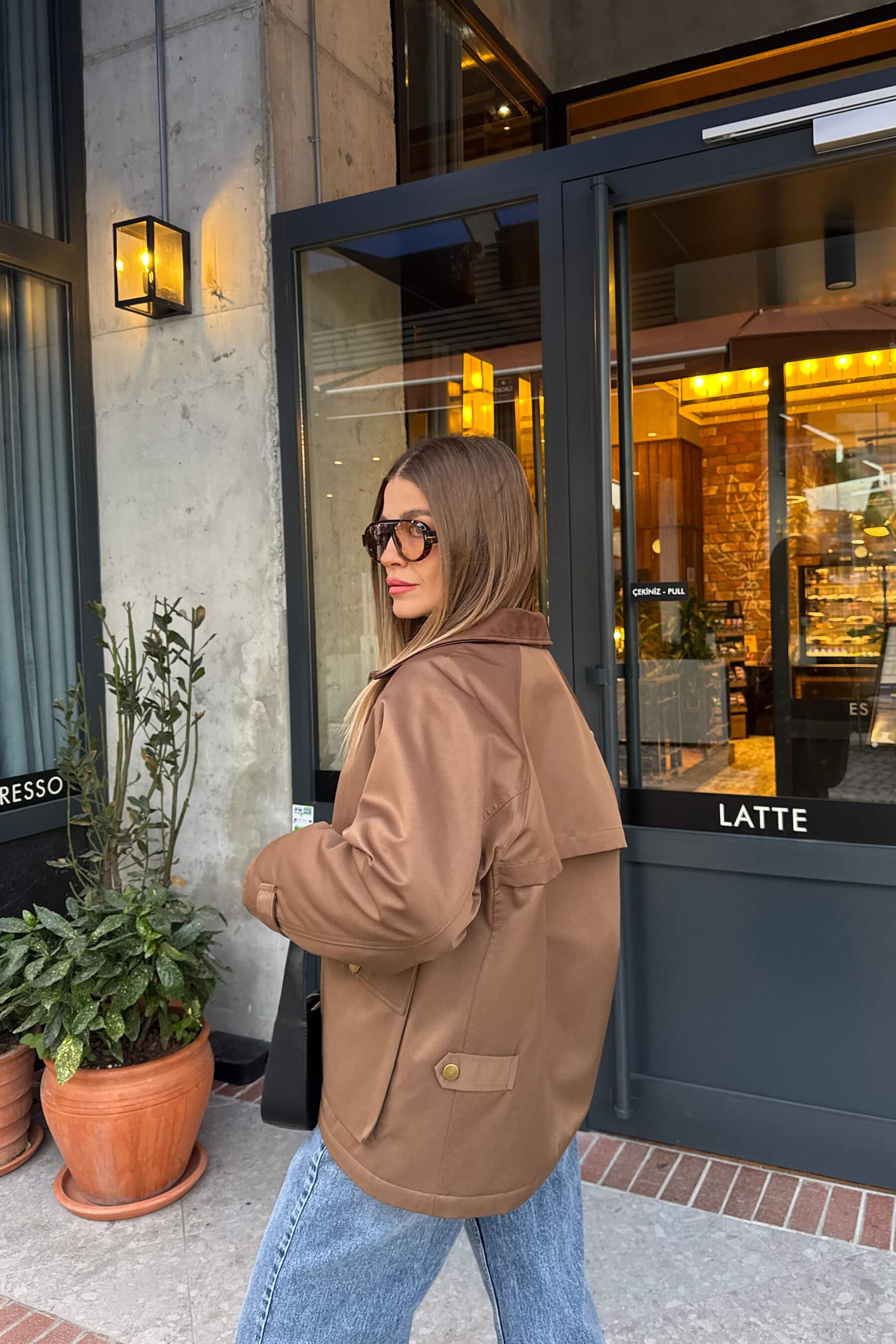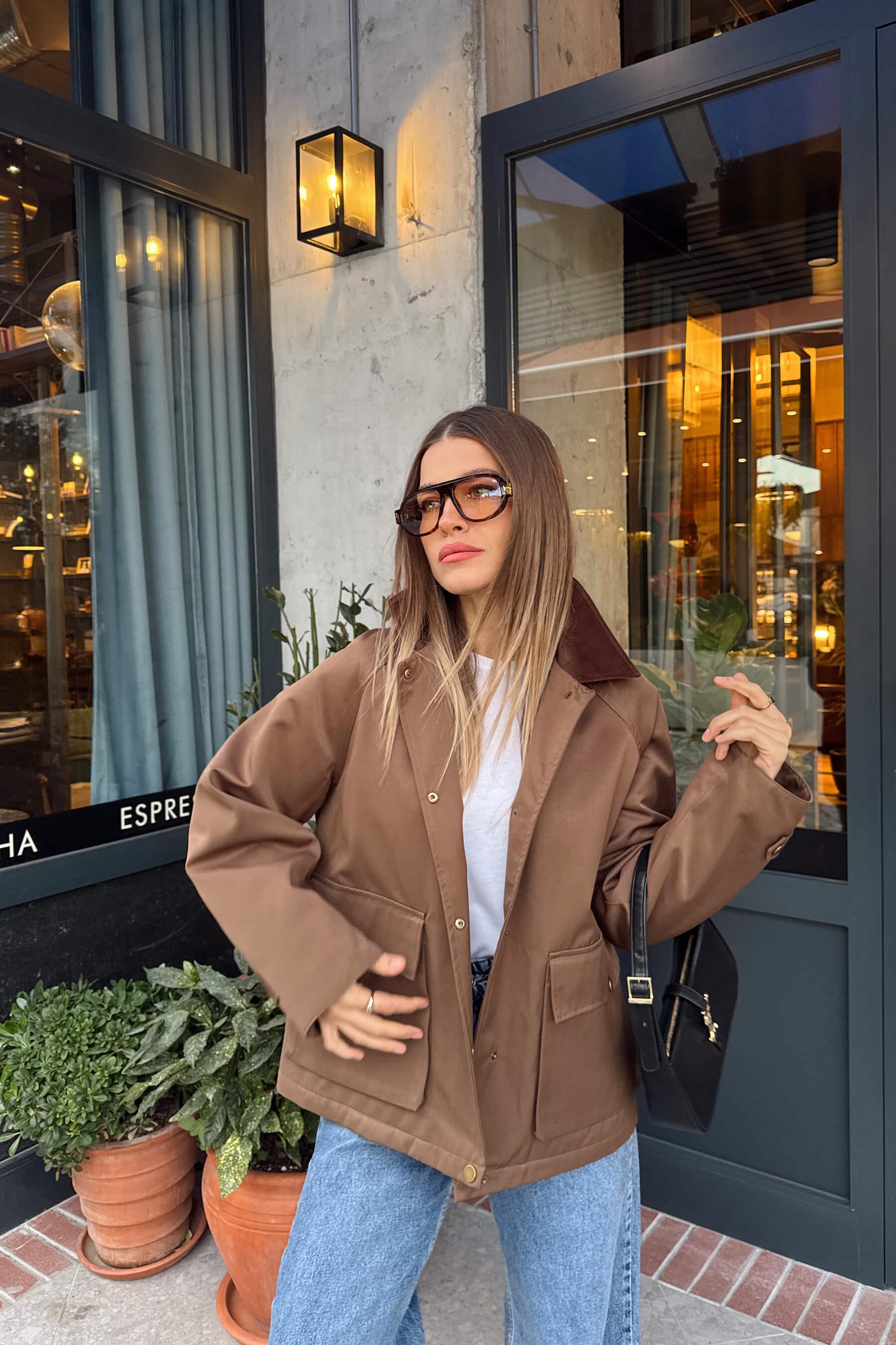 Kahverengi Kadife Yakalı Fermuarlı Oversize Kapitone Gabardin Ceket Model Ölçüleri: Boy: 166 cm, Kilo:54 kg Modelin Üzerindeki Beden: S/36 Ürünün Uzunluğu: 67 cm (1-2 cm arası değişiklik gösterebilir.) Kumaş Türü: %50 Pamuk, %50 Naylon Yıkama Talimatı : Ürünün iç kısmında bulunan etiketten yıkama talimatına ulaşabilirsiniz.