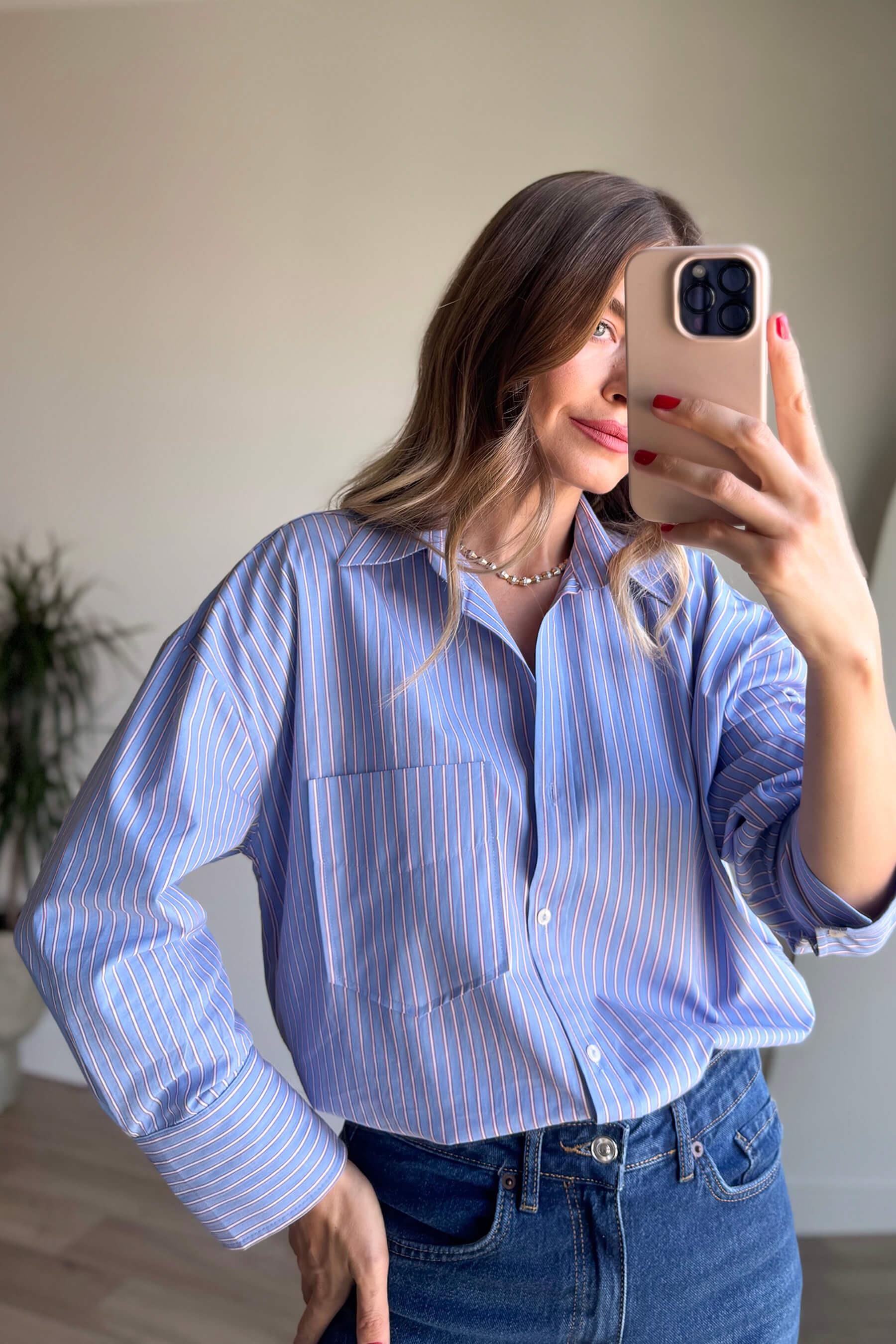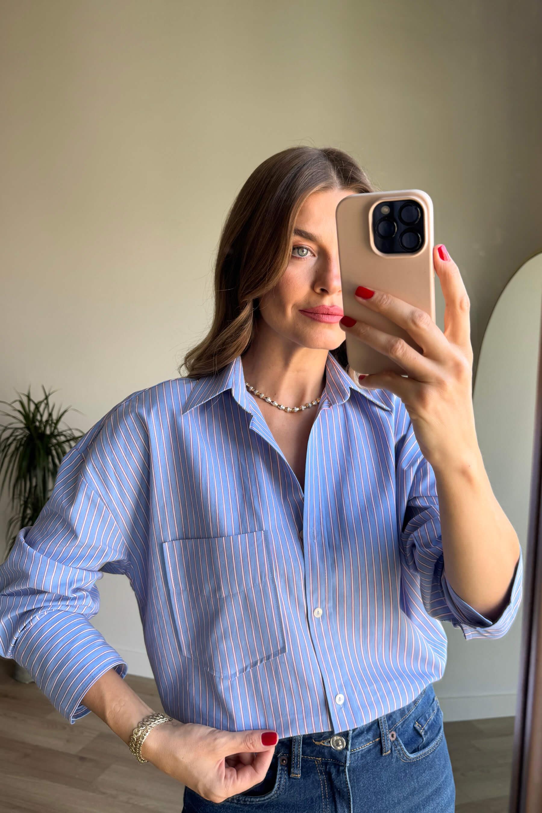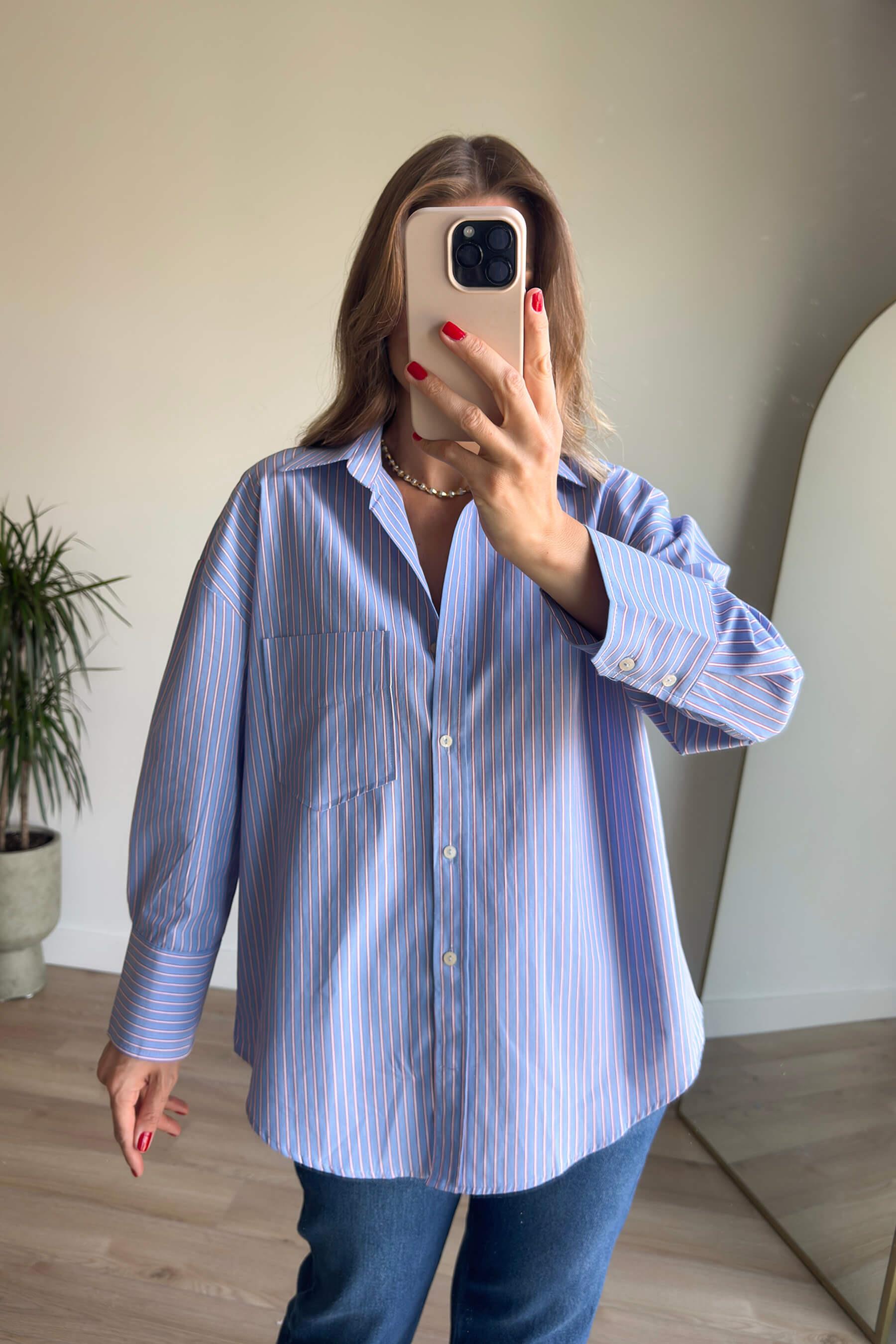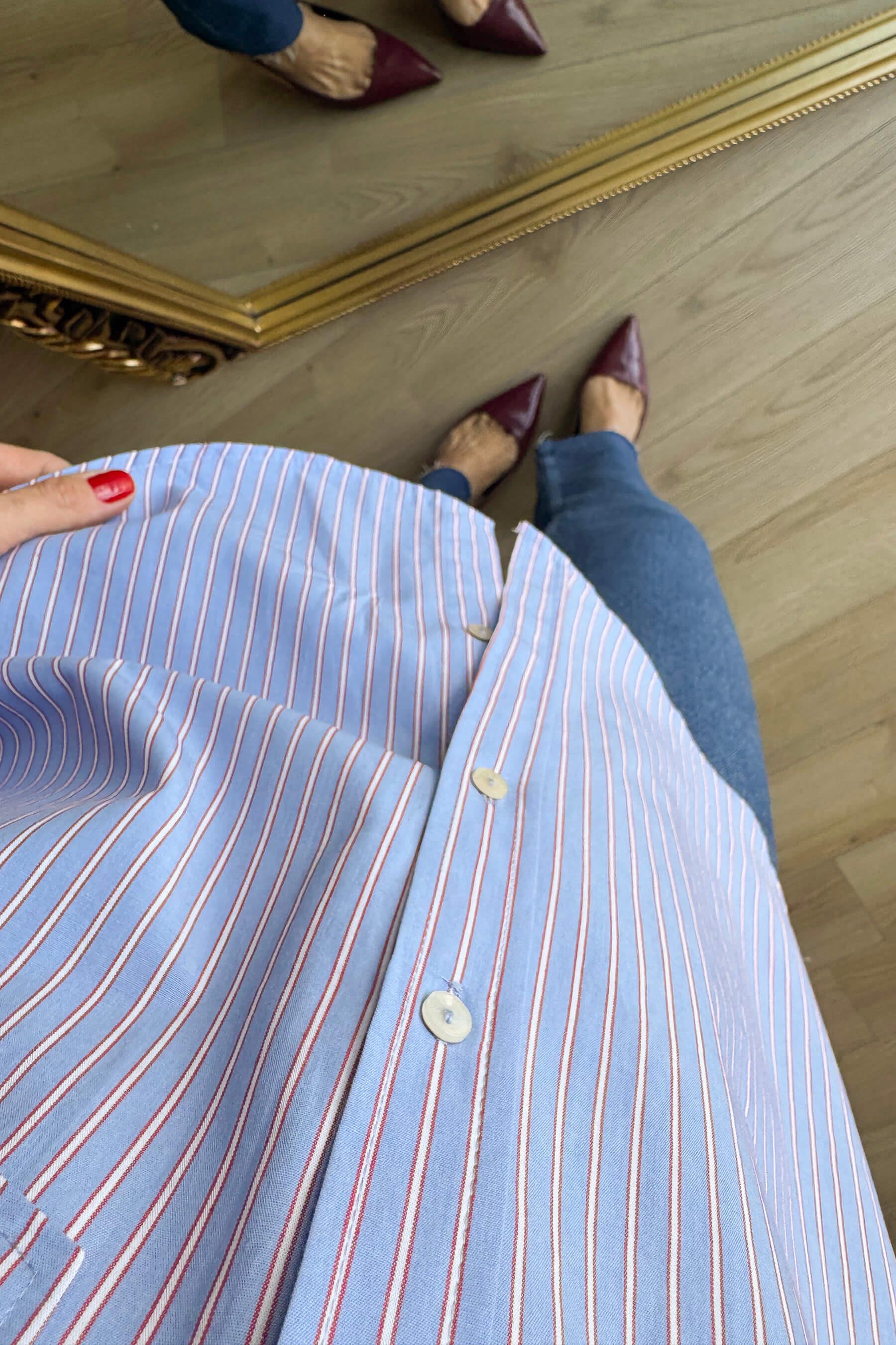 Mavi Kırmızı Çizgili Cepli Oversize Gömlek Model Ölçüleri: Boy: 166 cm, Kilo:54 kg Modelin Üzerindeki Beden: S beden Ürünün Uzunluğu: 72 cm (1-2 cm arası değişiklik gösterebilir.) Kumaş Türü: %76 Modal, %24 Polyester Yıkama Talimatı : Ürünün iç kısmında bulunan etiketten yıkama talimatına ulaşabilirsiniz.