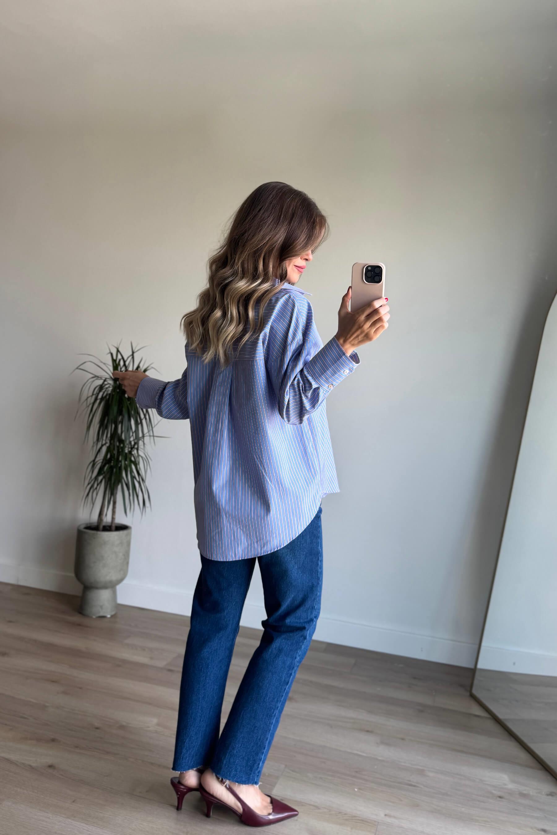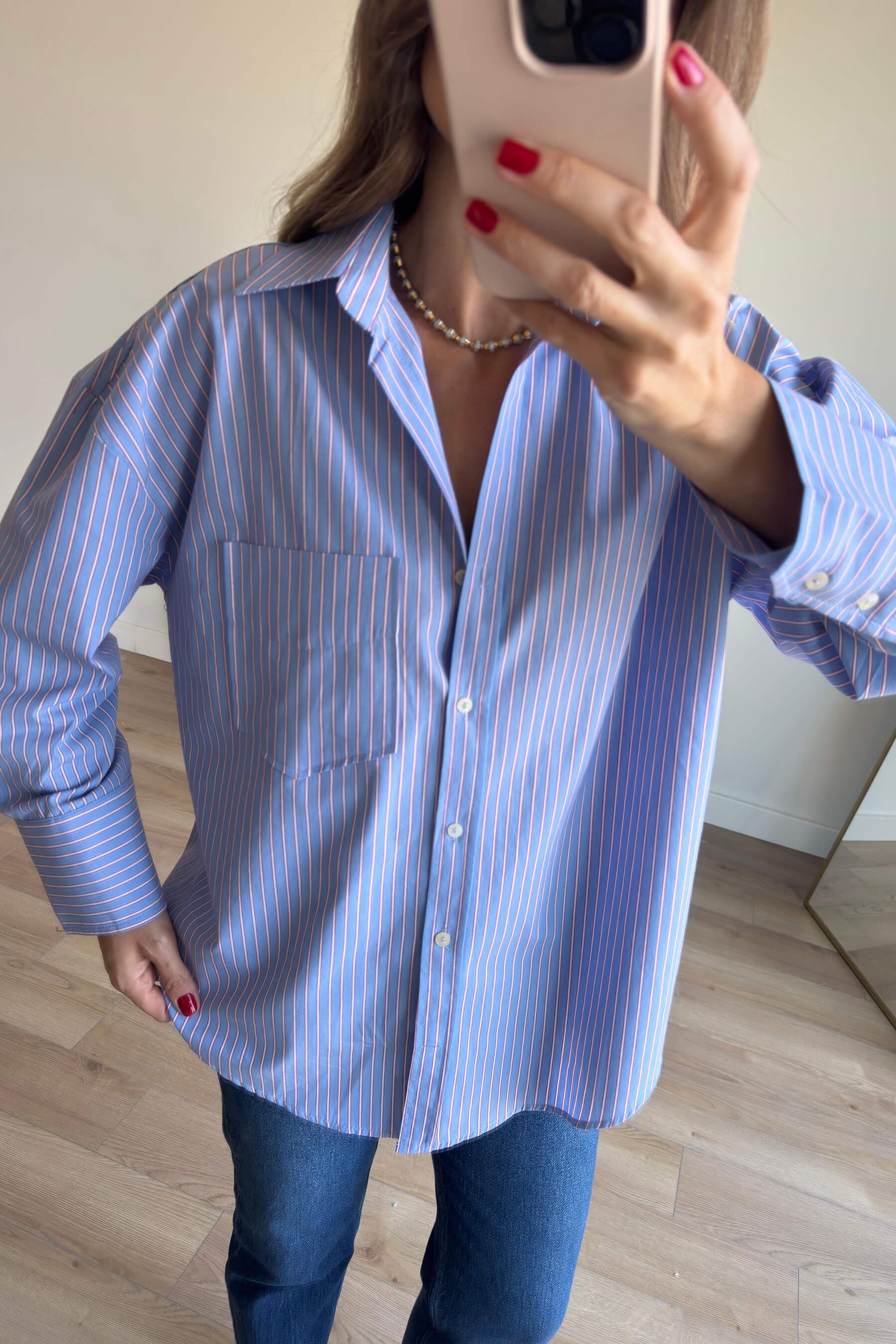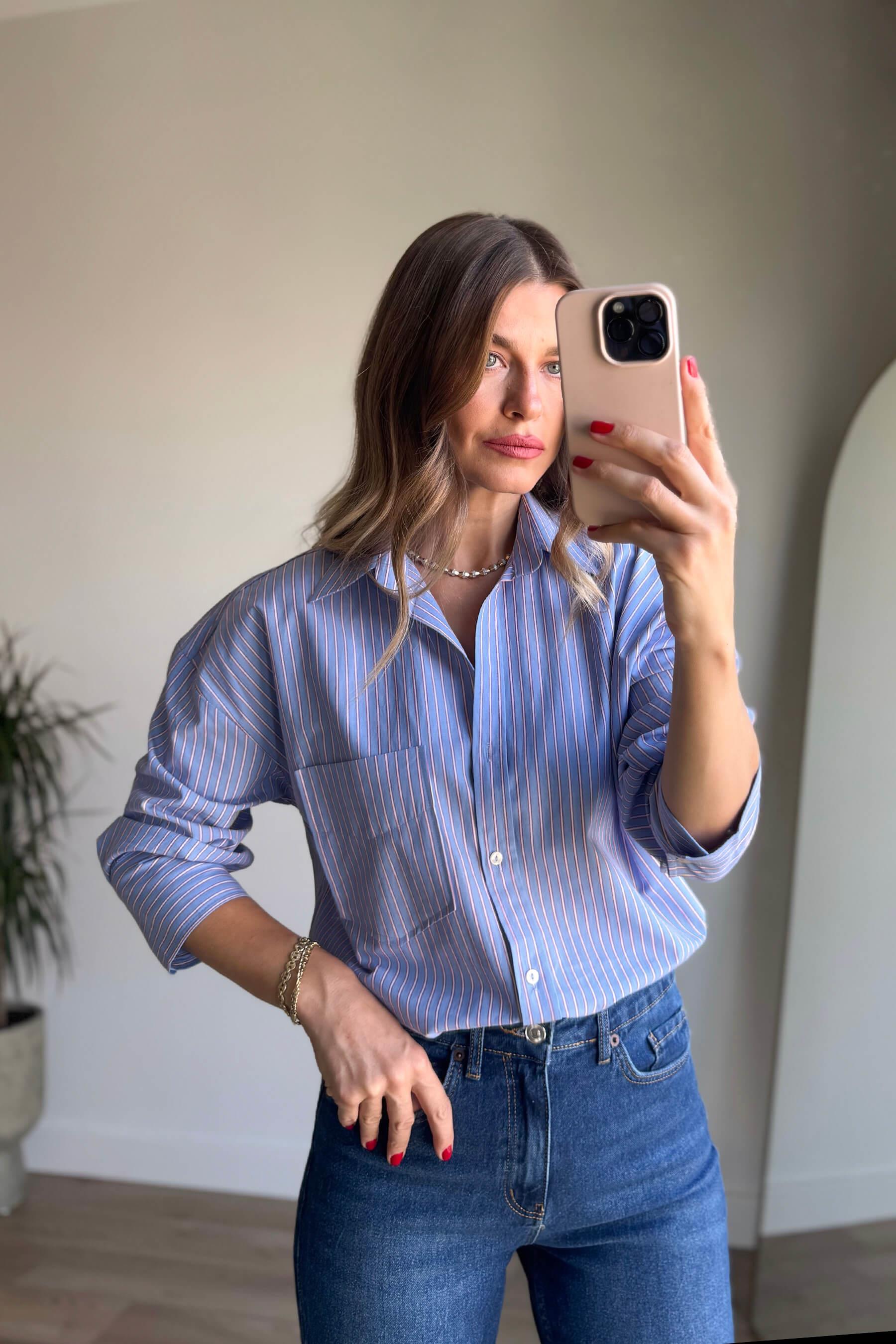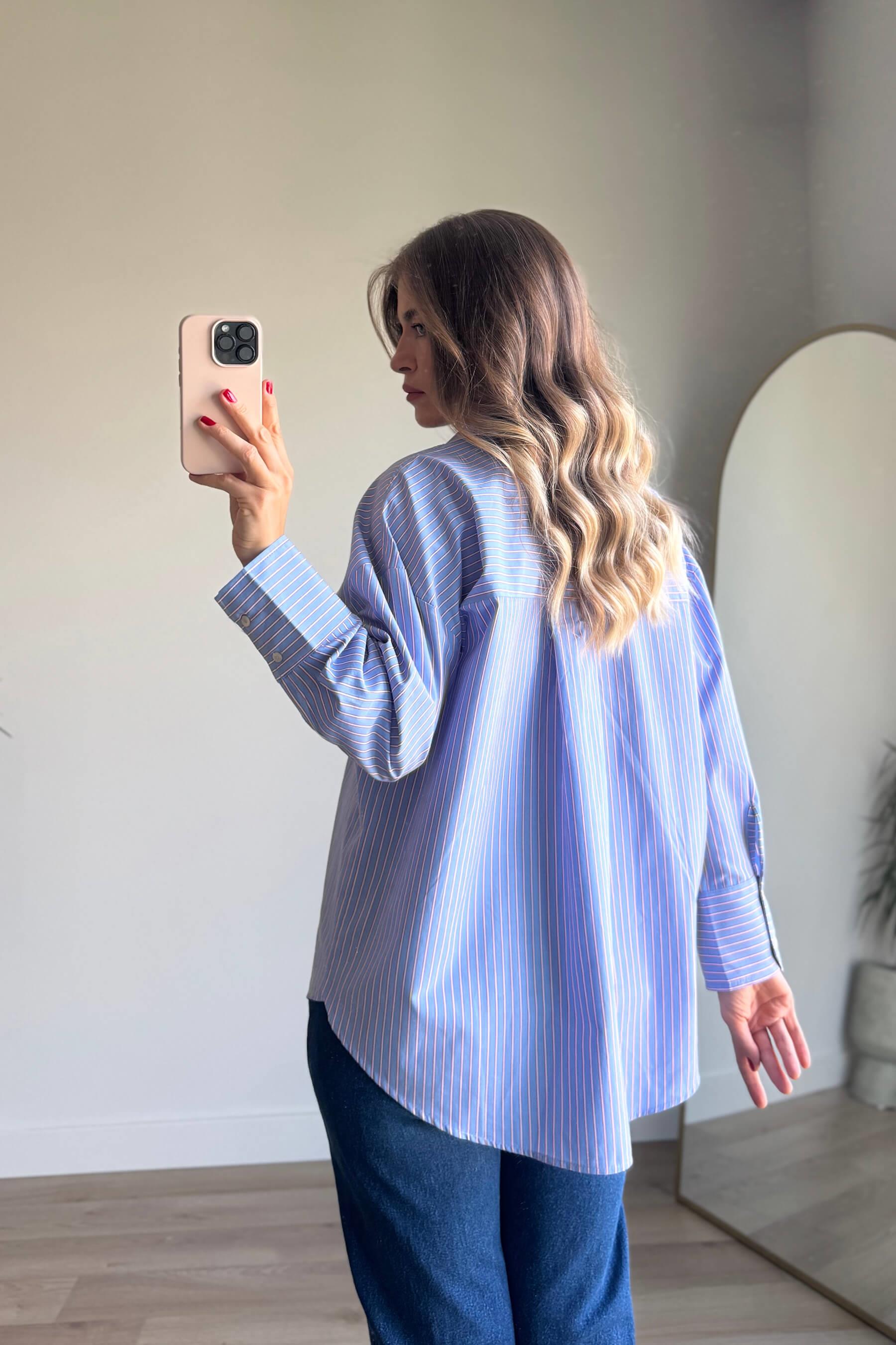 Mavi Kırmızı Çizgili Cepli Oversize Gömlek Model Ölçüleri: Boy: 166 cm, Kilo:54 kg Modelin Üzerindeki Beden: S beden Ürünün Uzunluğu: 72 cm (1-2 cm arası değişiklik gösterebilir.) Kumaş Türü: %76 Modal, %24 Polyester Yıkama Talimatı : Ürünün iç kısmında bulunan etiketten yıkama talimatına ulaşabilirsiniz.
