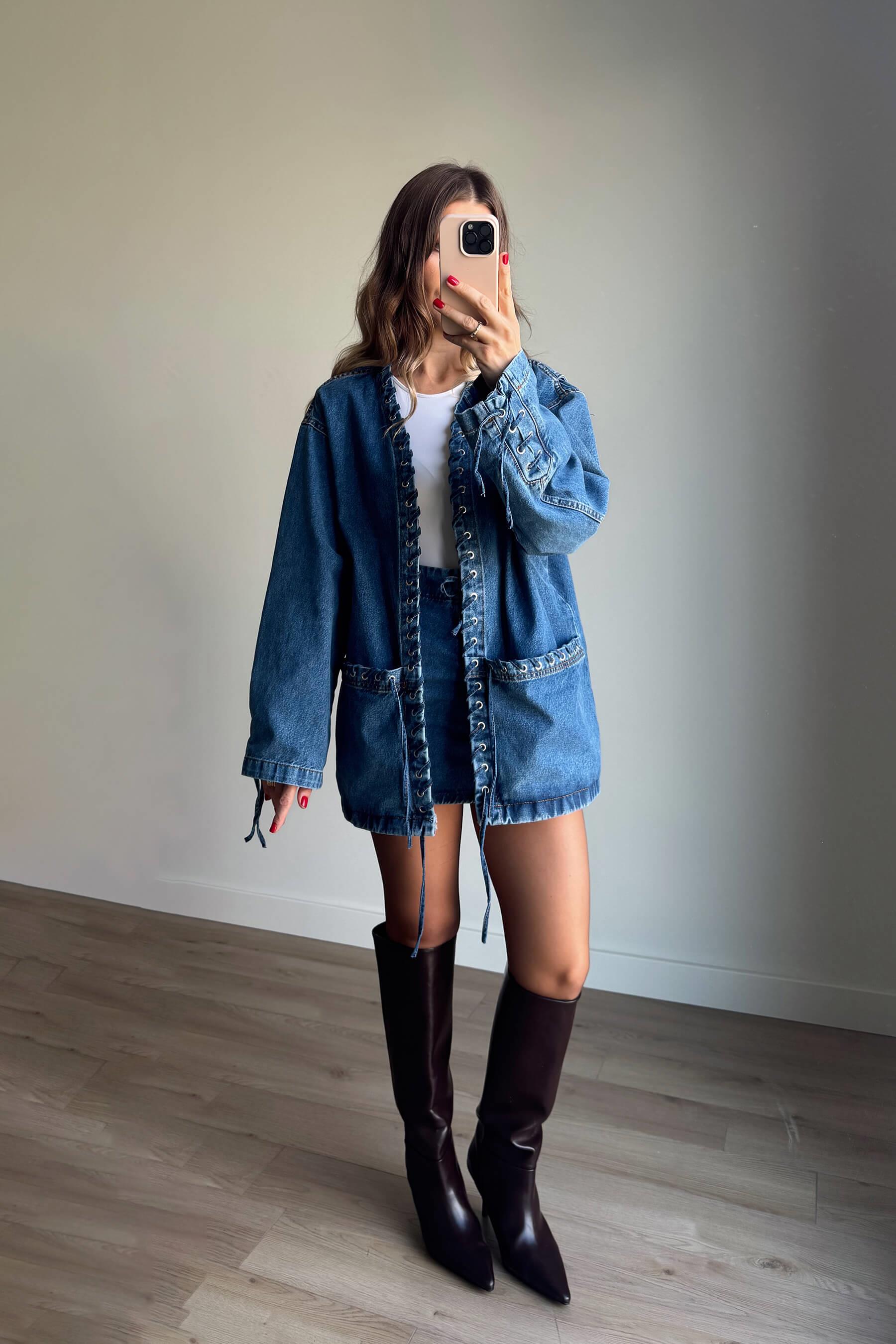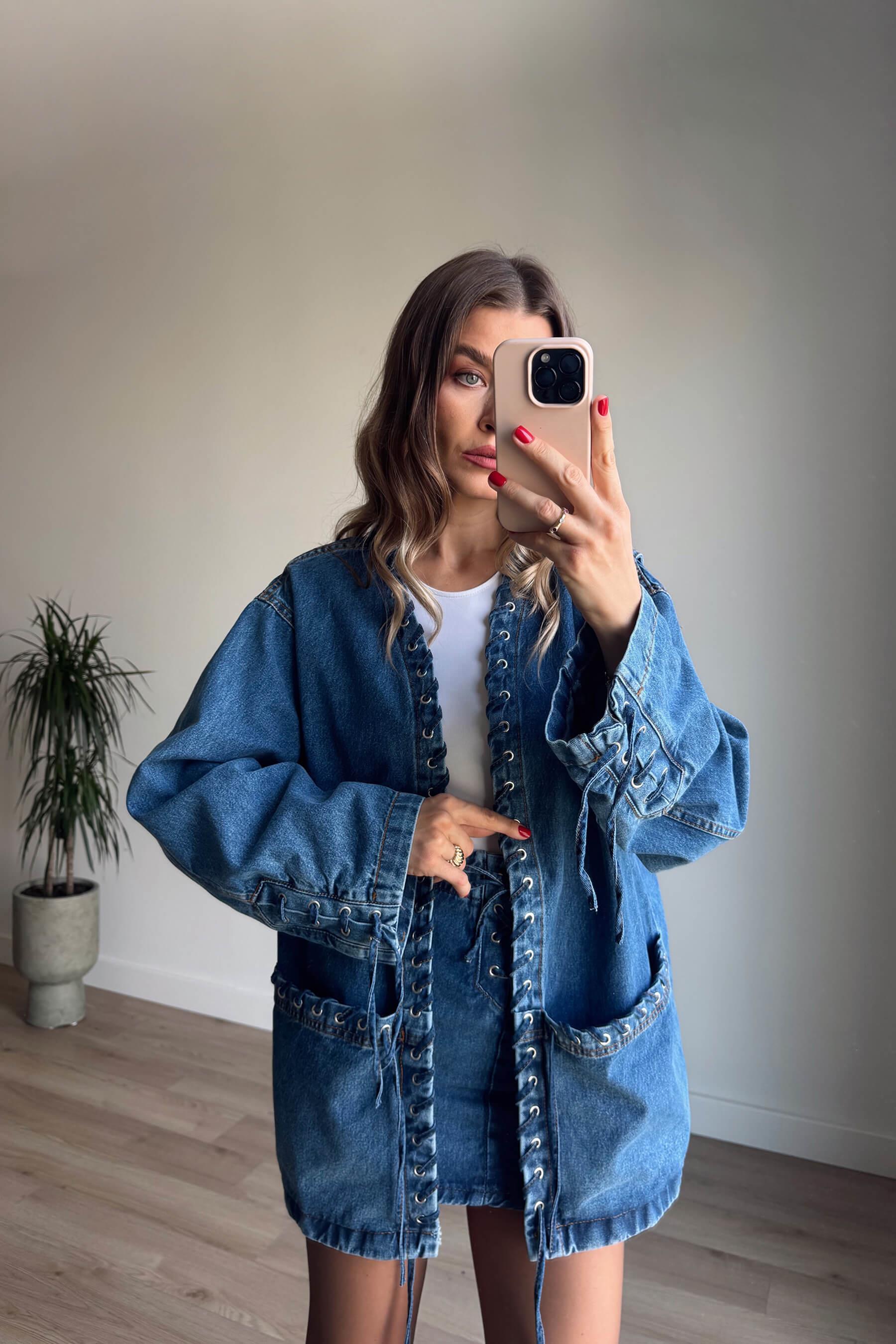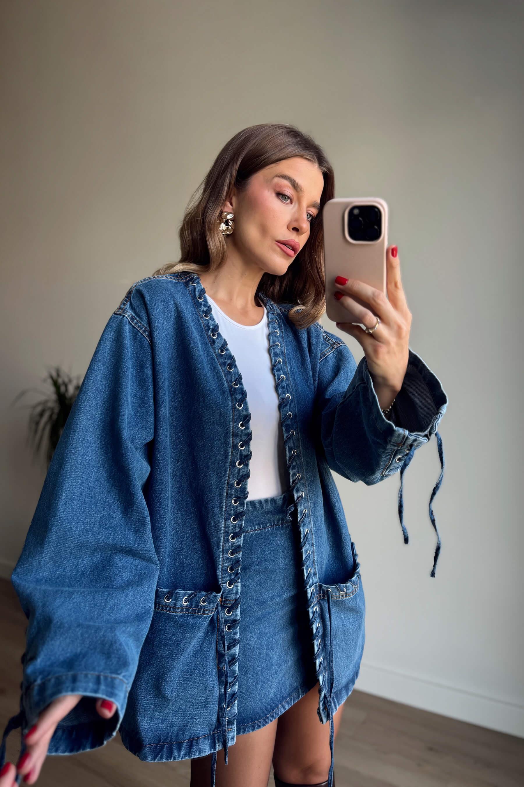 Mavi Kuş Gözü Detaylı Denim Etek Ceket Takım Model Ölçüleri: Boy: 166 cm, Kilo:54 kg Modelin Üzerindeki Beden: S/36 Ürünün Uzunluğu: Üst 72 cm, alt 35 cm (1-2 cm arası değişiklik gösterebilir.) Kumaş Türü: Pamuk Yıkama Talimatı : Ürünün iç kısmında bulunan etiketten yıkama talimatına ulaşabilirsiniz.