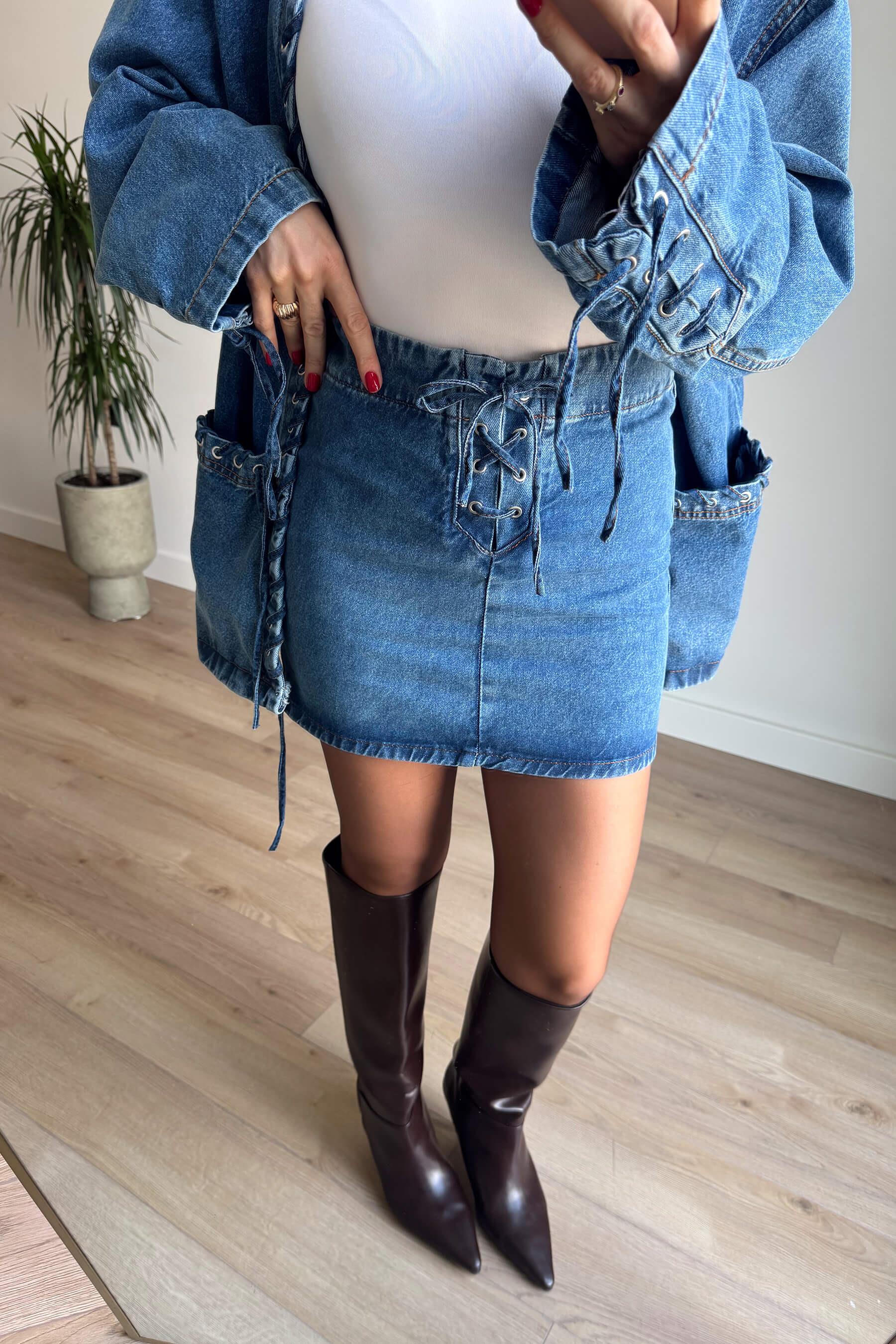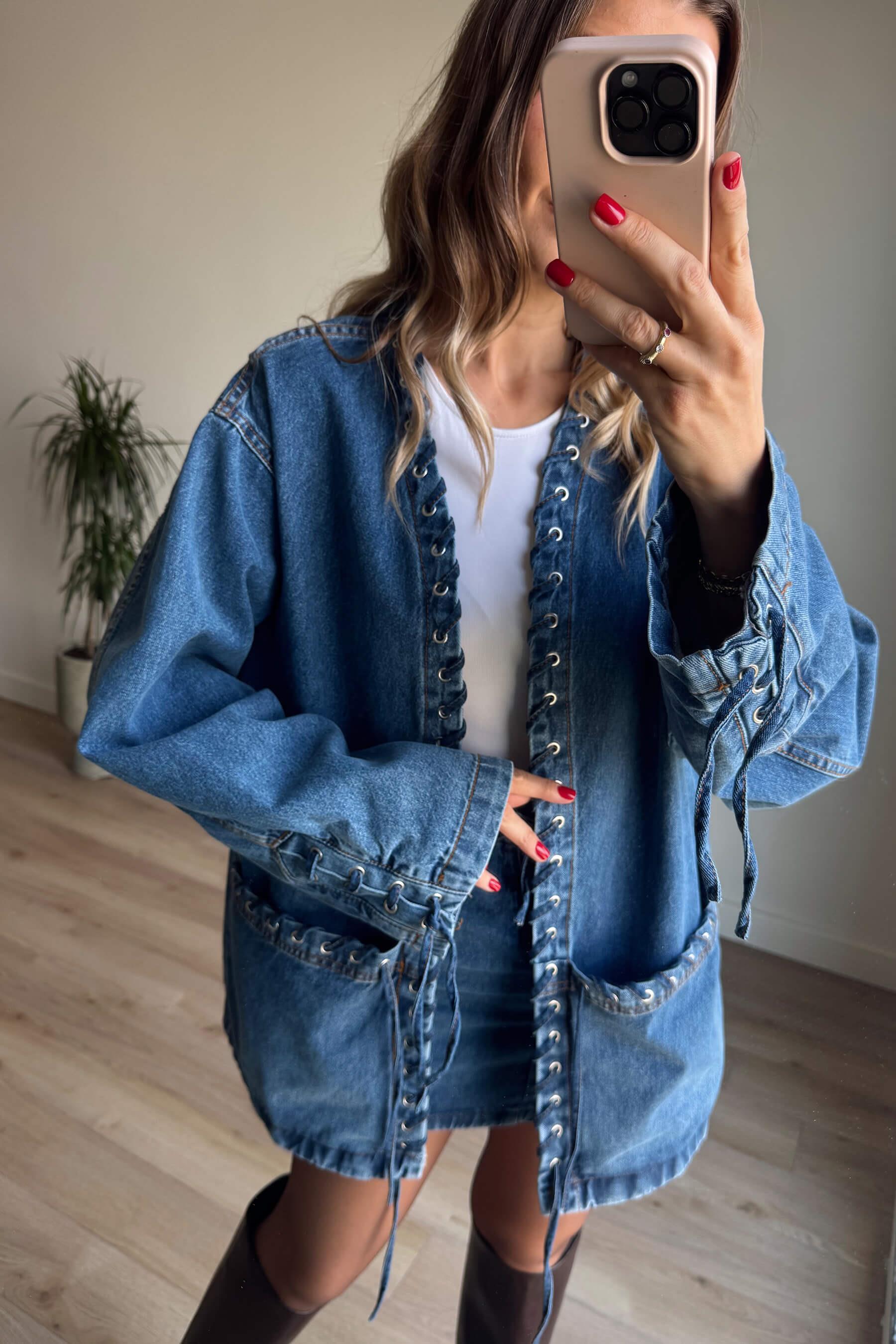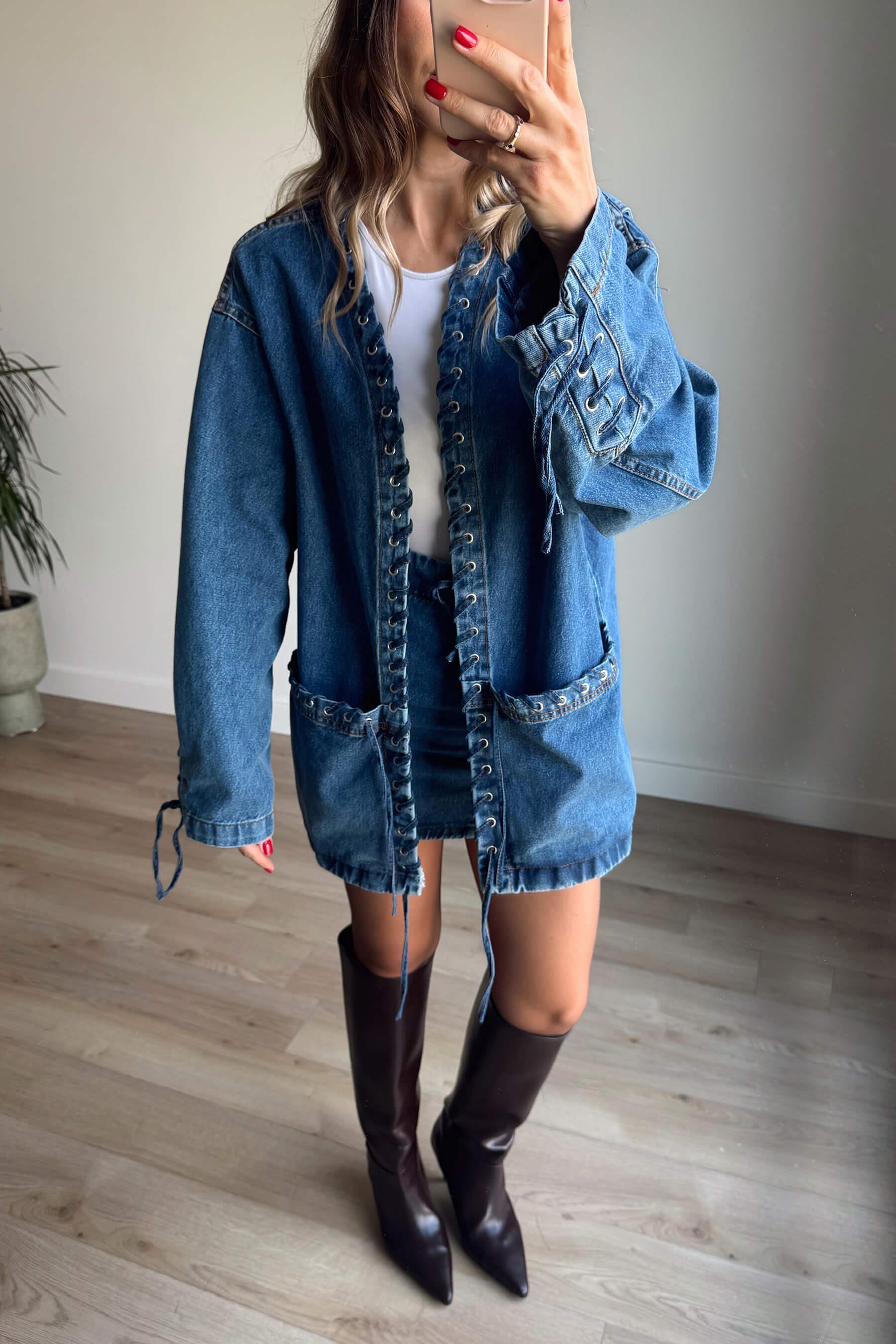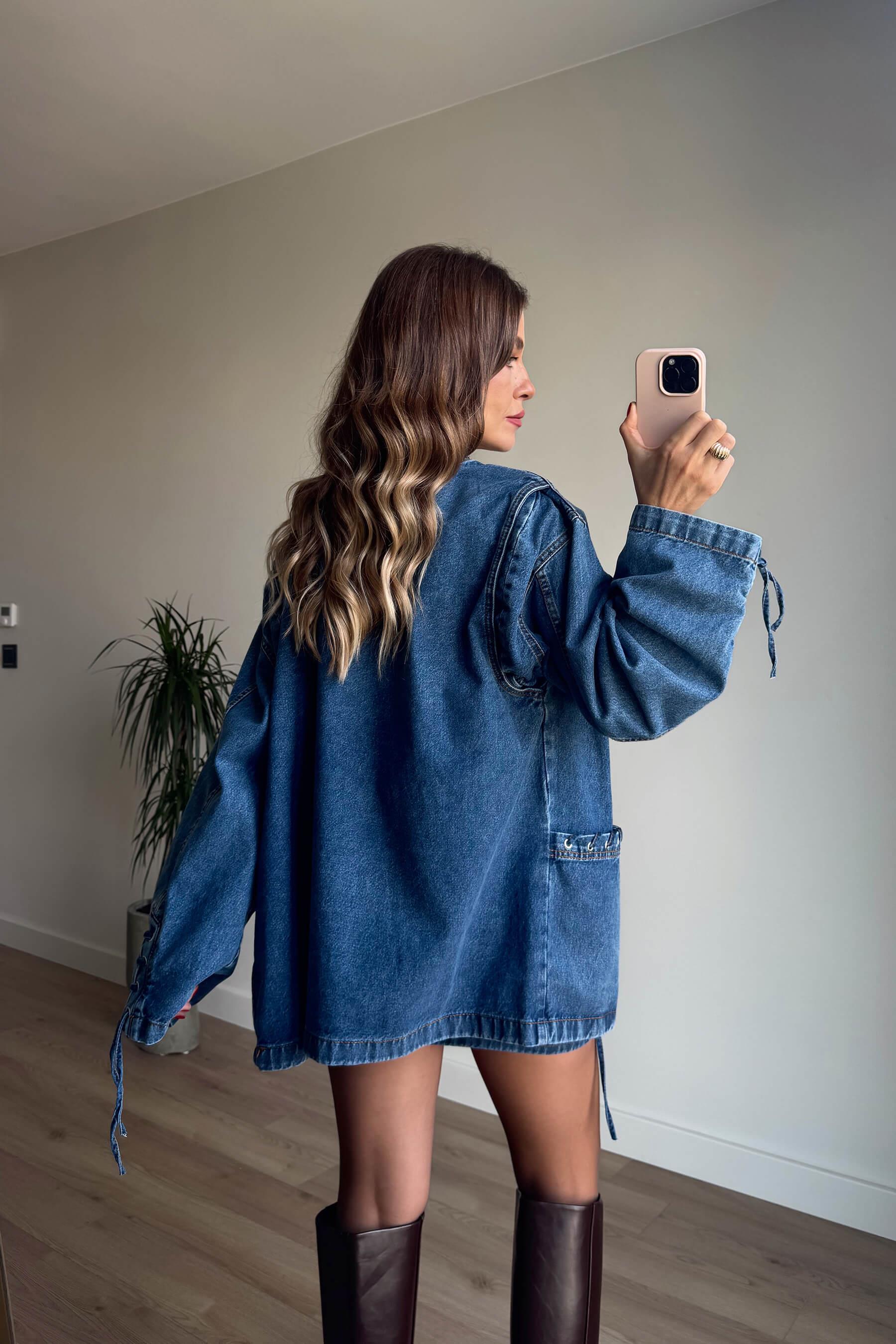 Mavi Kuş Gözü Detaylı Denim Etek Ceket Takım Model Ölçüleri: Boy: 166 cm, Kilo:54 kg Modelin Üzerindeki Beden: S/36 Ürünün Uzunluğu: Üst 72 cm, alt 35 cm (1-2 cm arası değişiklik gösterebilir.) Kumaş Türü: Pamuk Yıkama Talimatı : Ürünün iç kısmında bulunan etiketten yıkama talimatına ulaşabilirsiniz.