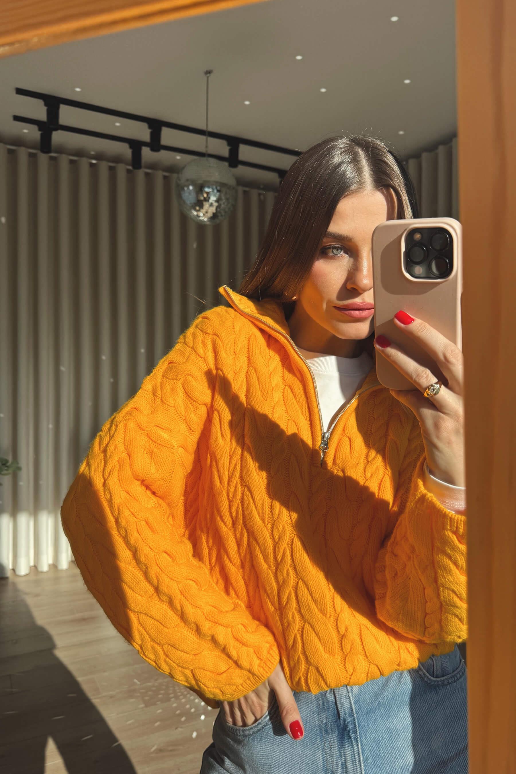 Orange Fermuarlı Saç Örgü Kazak Model Ölçüleri: Boy: 166 cm, Kilo:54 kg Modelin Üzerindeki Beden: Standart Ürünün Uzunluğu: 61 cm (1-2 cm arası değişiklik gösterebilir.) Kumaş Türü: %100 Akrilik Yıkama Talimatı : Ürünün iç kısmında bulunan etiketten yıkama talimatına ulaşabilirsiniz.
