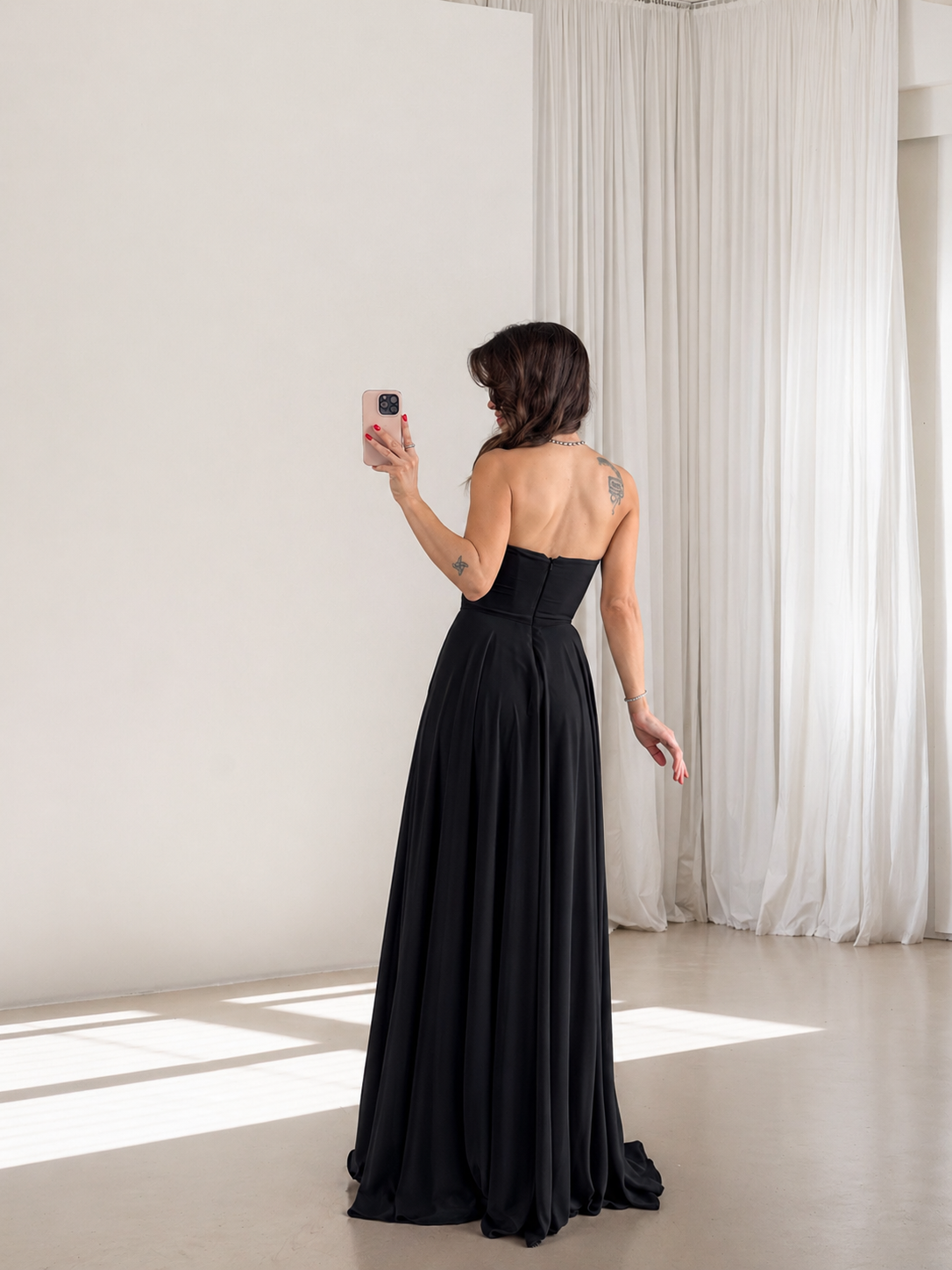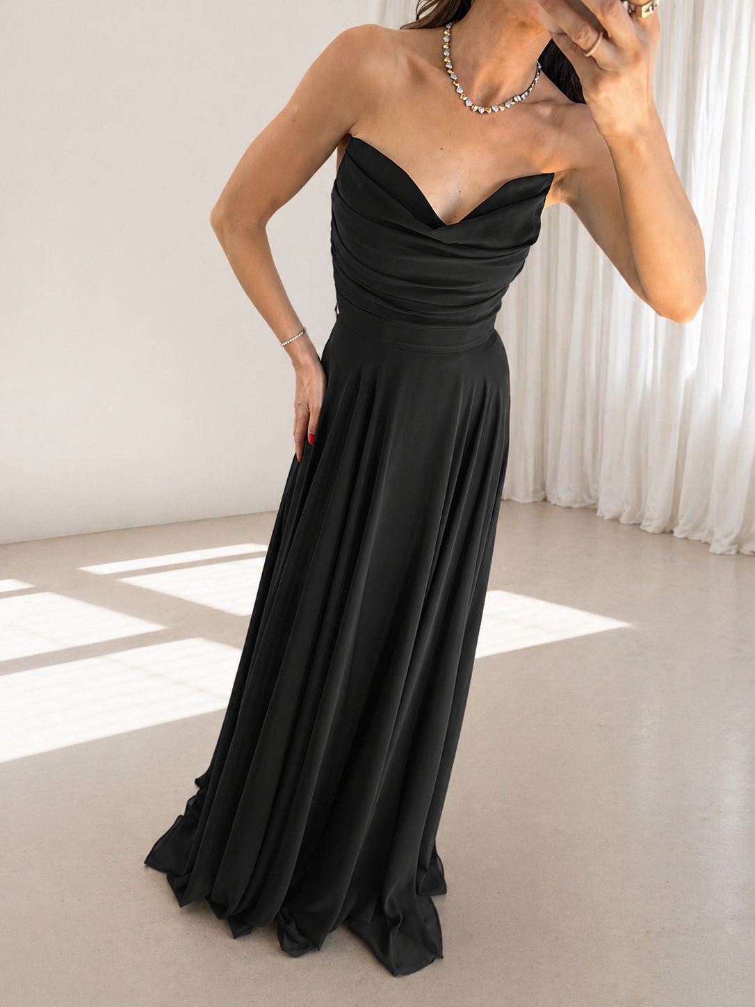 Siyah Drapeli Straplez Şallı Abiye Elbise Model Ölçüleri: Boy: 166 cm, Kilo:54 kg Modelin Üzerindeki Beden: S/36 Ürünün Uzunluğu: 138 cm (1-2 cm arası değişiklik gösterebilir.) Kumaş Türü: Polyester Yıkama Talimatı : Ürünün iç kısmında bulunan etiketten yıkama talimatına ulaşabilirsiniz.