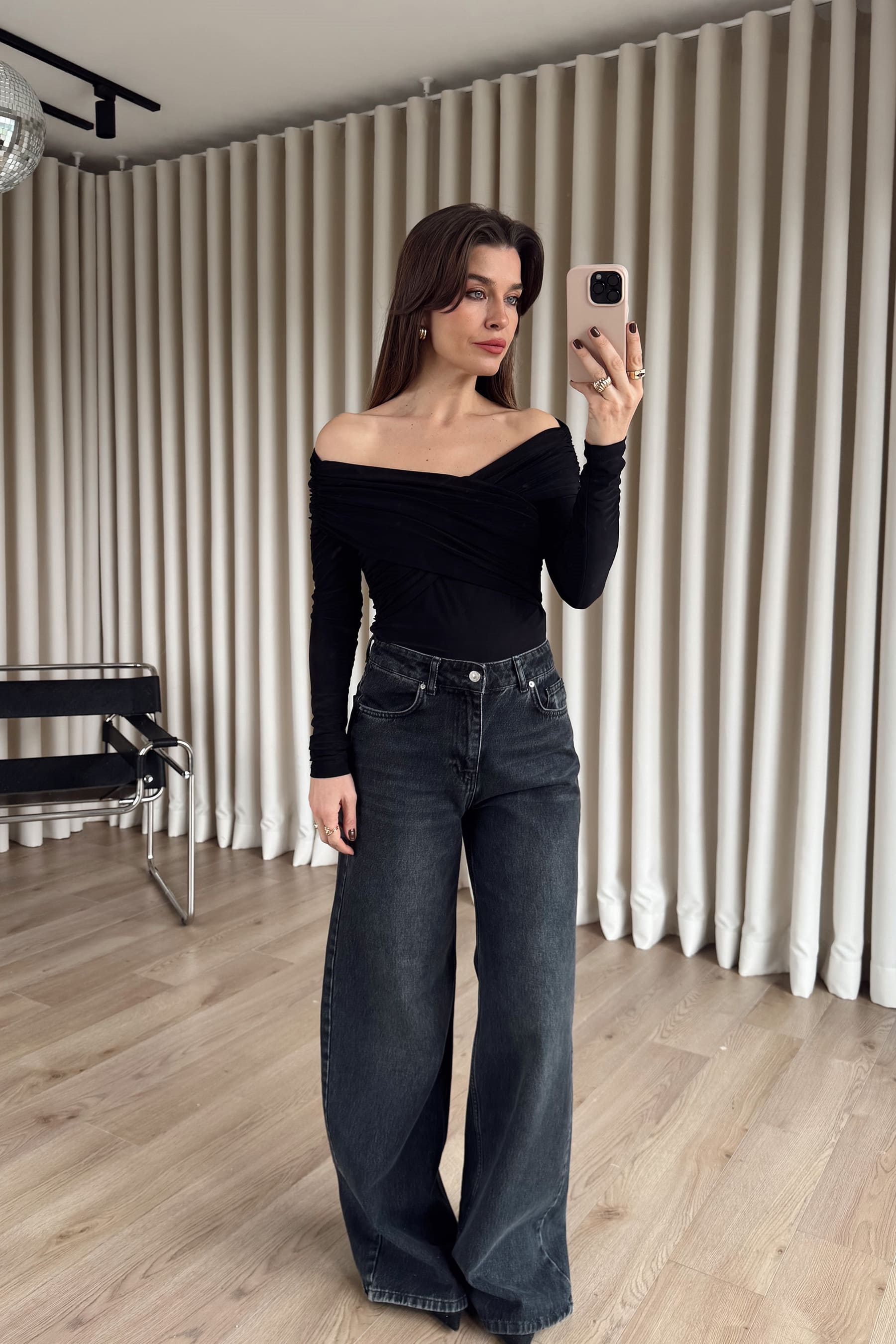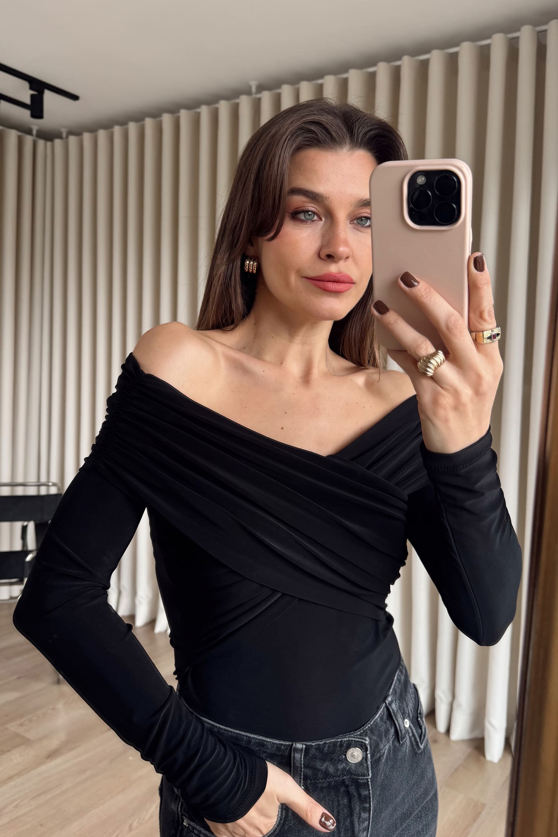 Siyah Omuzdan Çapraz Drapeli Bluz Model Ölçüleri: Boy: 166 cm, Kilo:54 kg Modelin Üzerindeki Beden: S/36 Ürünün Uzunluğu: 47 cm (1-2 cm arası değişiklik gösterebilir.) Kumaş Türü:%95 Polyester, %5 Elestan Yıkama Talimatı : Ürünün iç kısmında bulunan etiketten yıkama talimatına ulaşabilirsiniz.