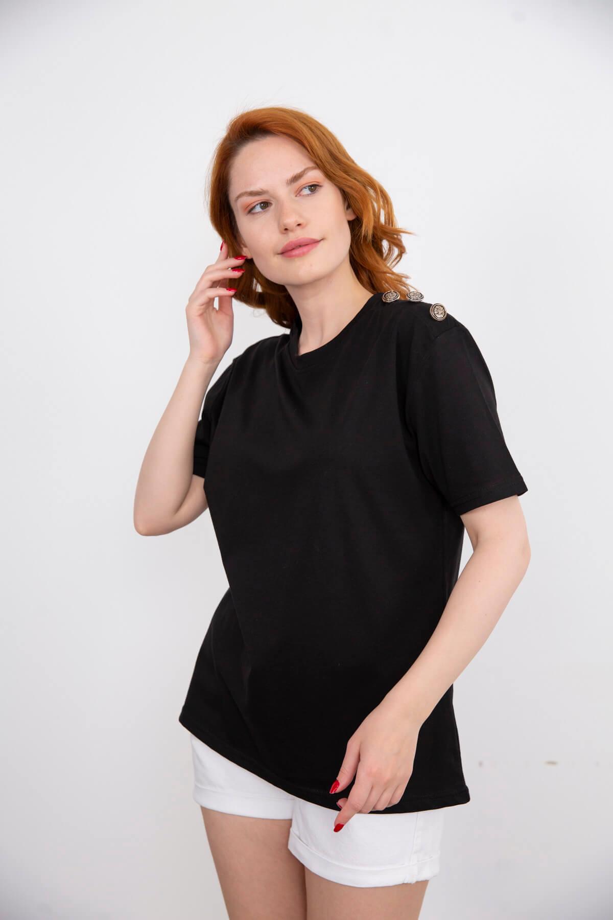 Siyah Omzu Düğmeli Bisiklet Yaka T-Shirt Model Ölçüleri: Boy: 168 cm, Kilo:51 kg Modelin Üzerindeki Beden: S/36 Ürünün Uzunluğu: 65 cm (1-2 cm arası değişiklik gösterebilir.) Kumaş Türü: %97 Pamuk, %3 Elastan Yıkama Talimatı : Ürünün iç kısmında bulunan etiketten yıkama talimatına ulaşabilirsiniz.