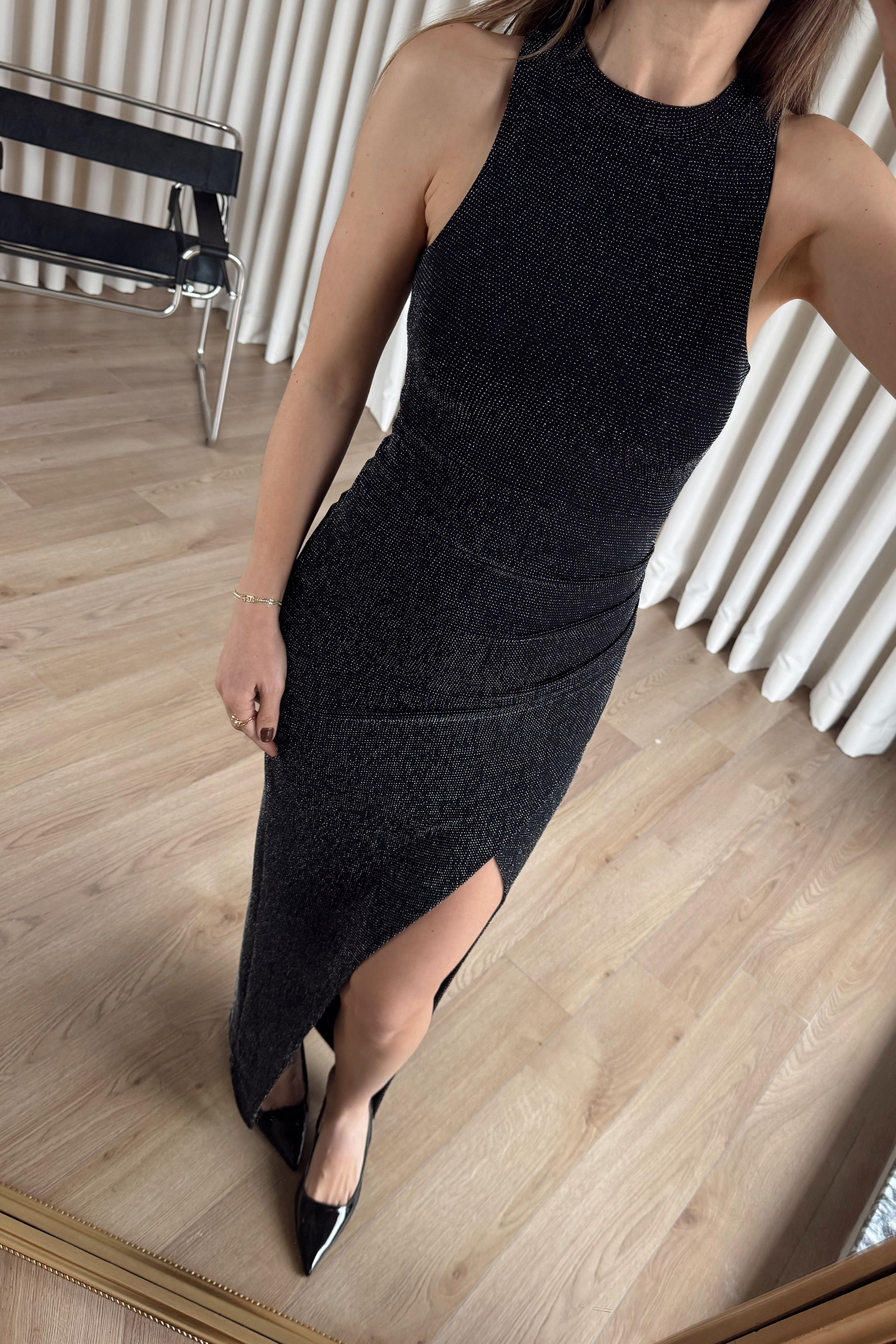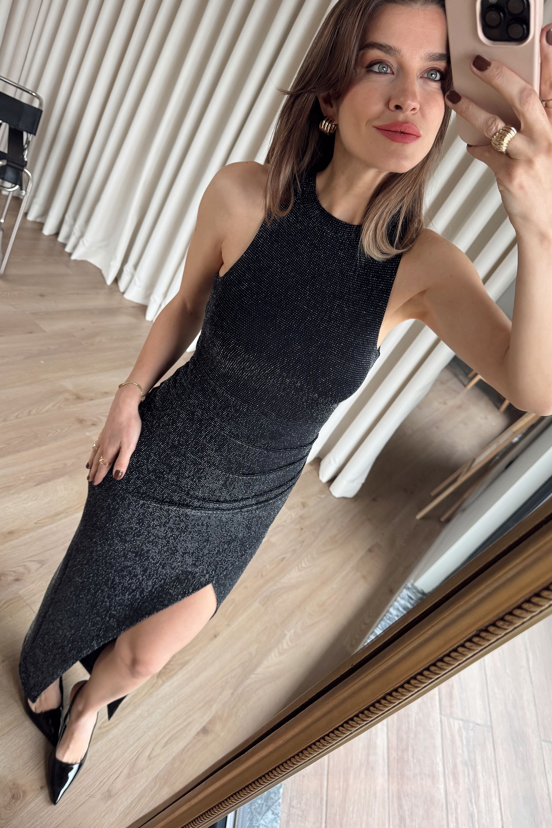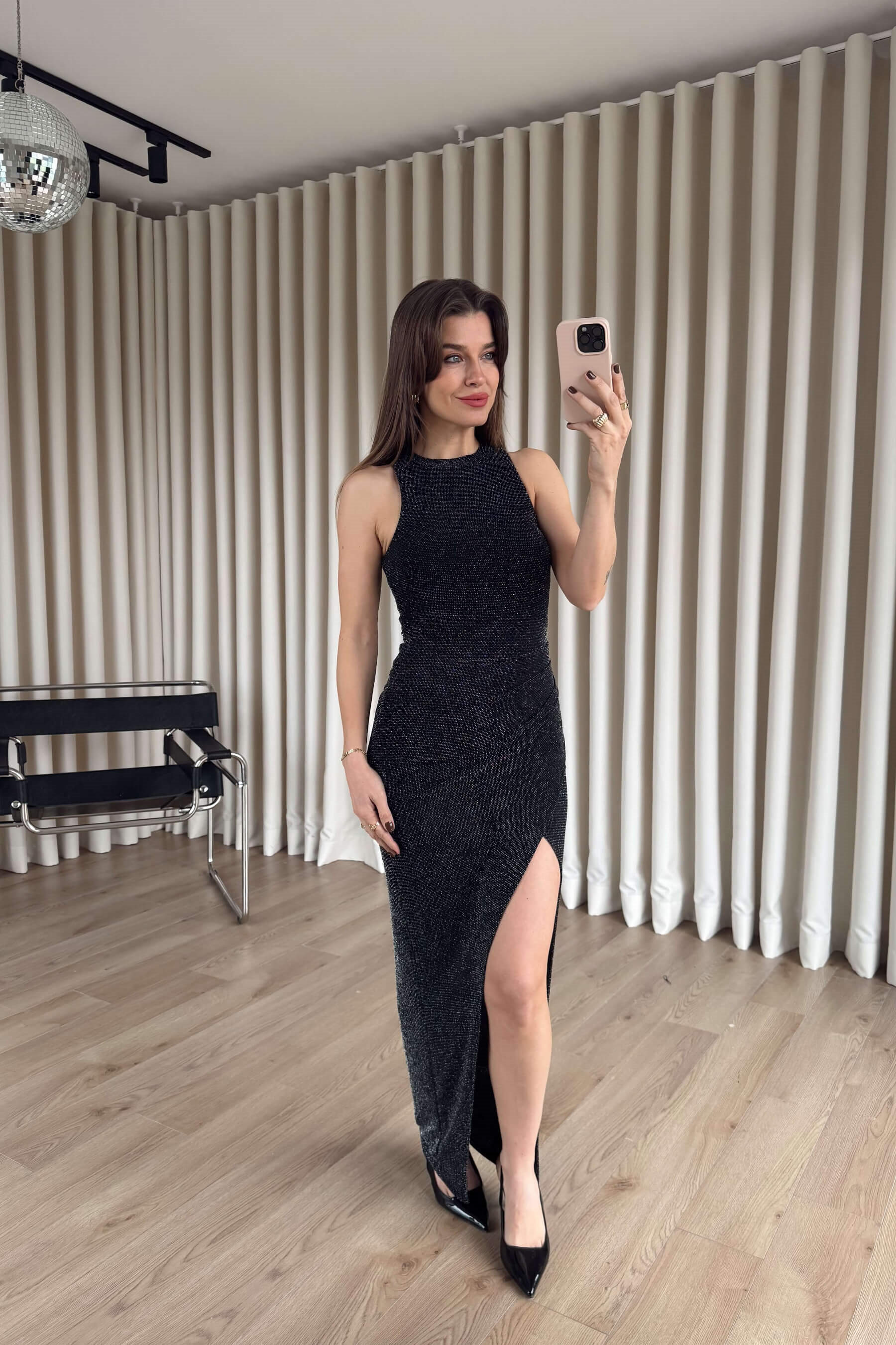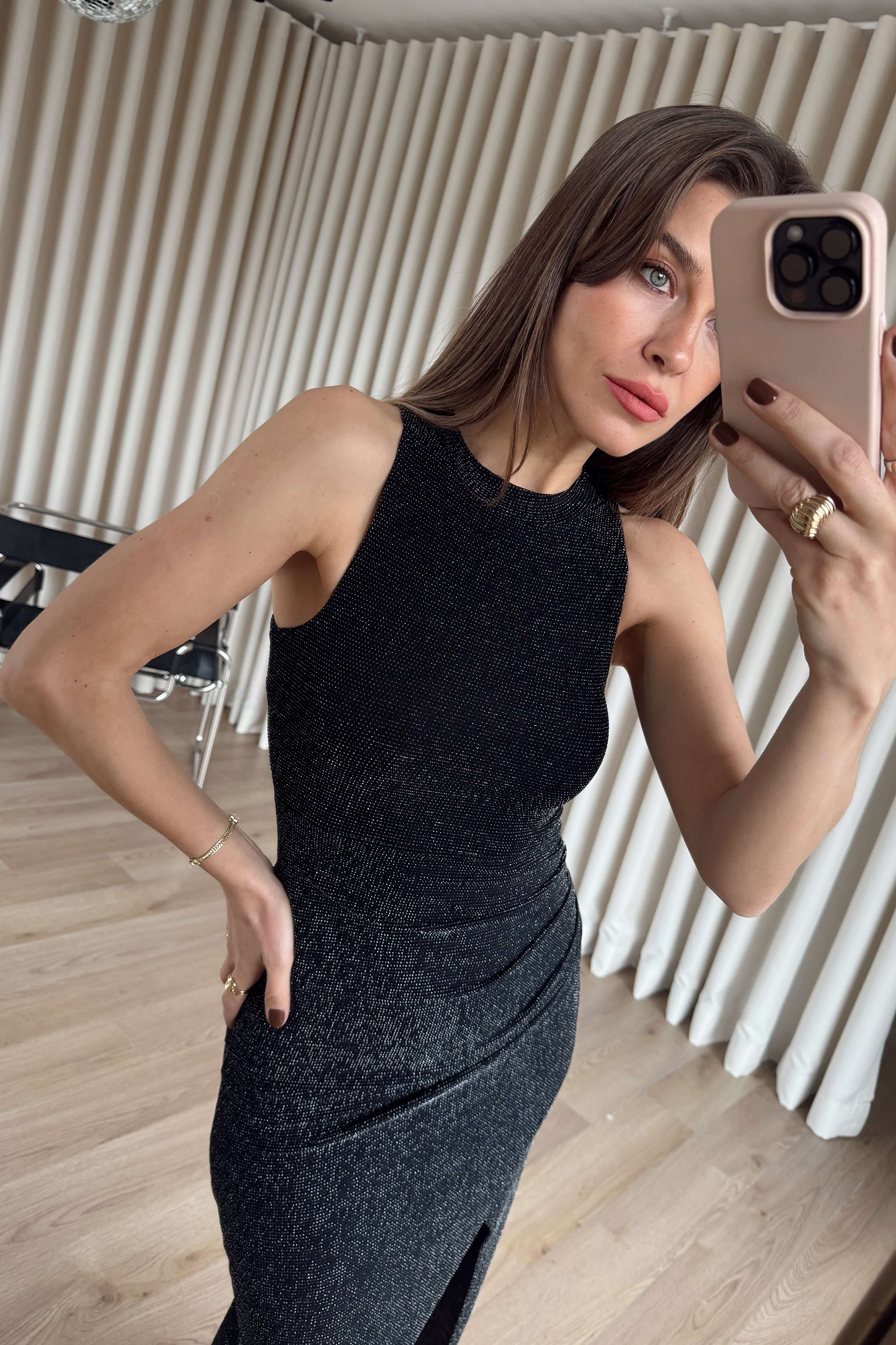 Siyah Simli Sıfır Kol Belden Drapeli Yırtmaçlı Elbise Model Ölçüleri: Boy: 166 cm, Kilo:54 kg Modelin Üzerindeki Beden: S/36 Ürünün Uzunluğu: 134 cm (1-2 cm arası değişiklik gösterebilir.) Kumaş Türü: %95 Polyester, %5 Elestan Yıkama Talimatı : Ürünün iç kısmında bulunan etiketten yıkama talimatına ulaşabilirsiniz.