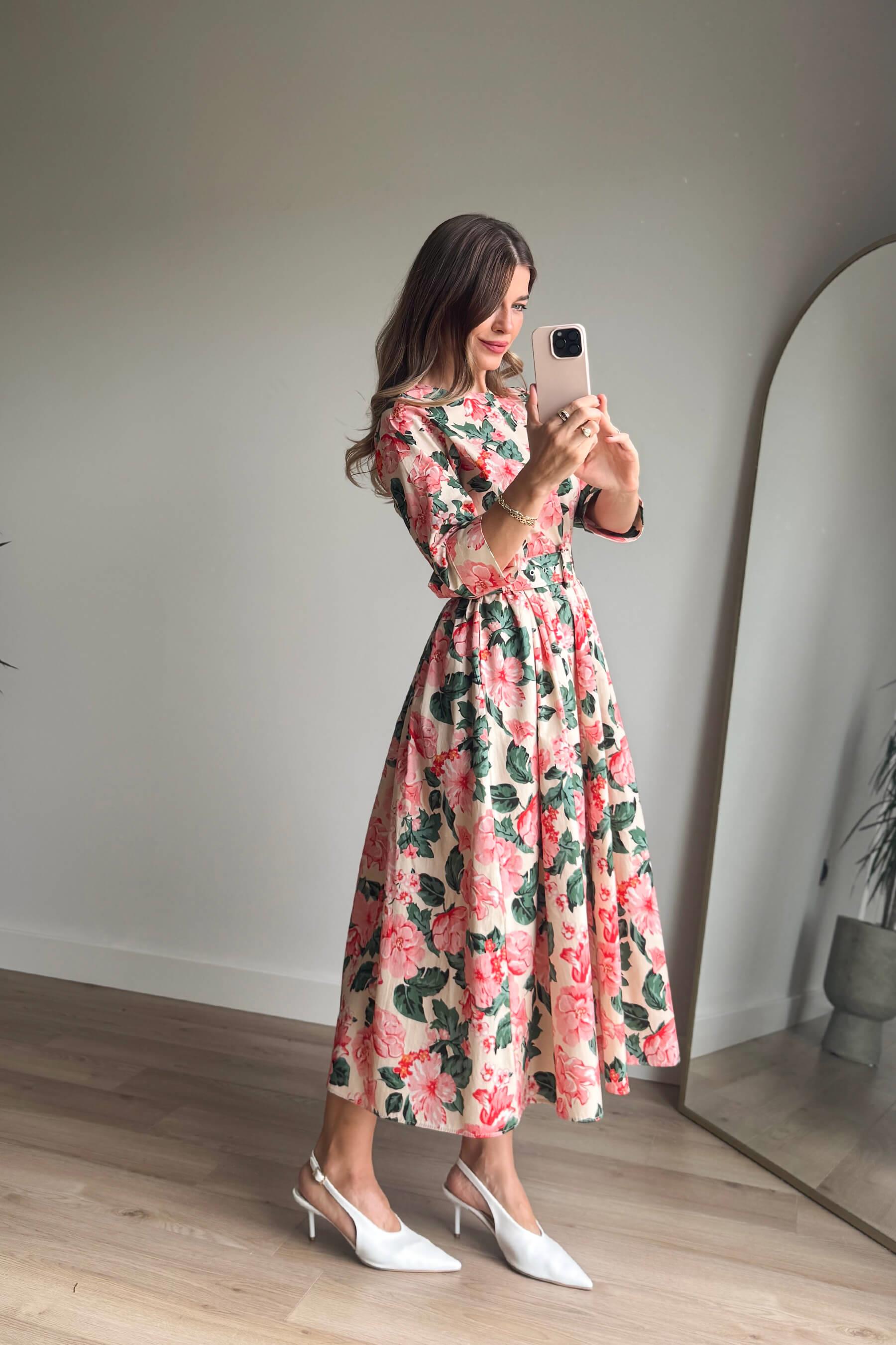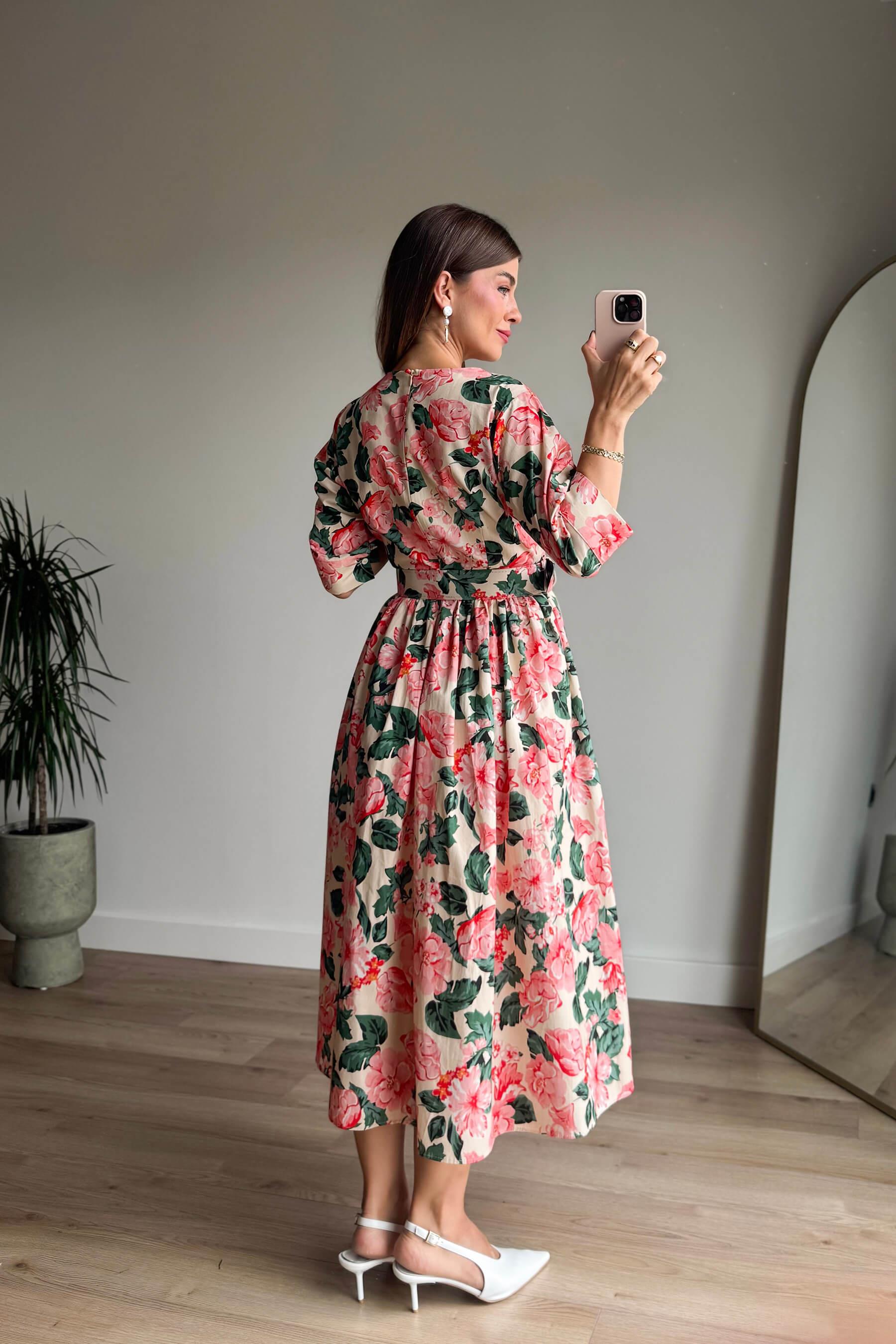 Somon Çiçekli Bisiklet Yaka Kemerli Elbise Model Ölçüleri: Boy: 166 cm, Kilo:54 kg Modelin Üzerindeki Beden: S/36 Ürünün Uzunluğu: 120 cm (1-2 cm arası değişiklik gösterebilir.) Kumaş Türü: Pamuk Yıkama Talimatı : Ürünün iç kısmında bulunan etiketten yıkama talimatına ulaşabilirsiniz.