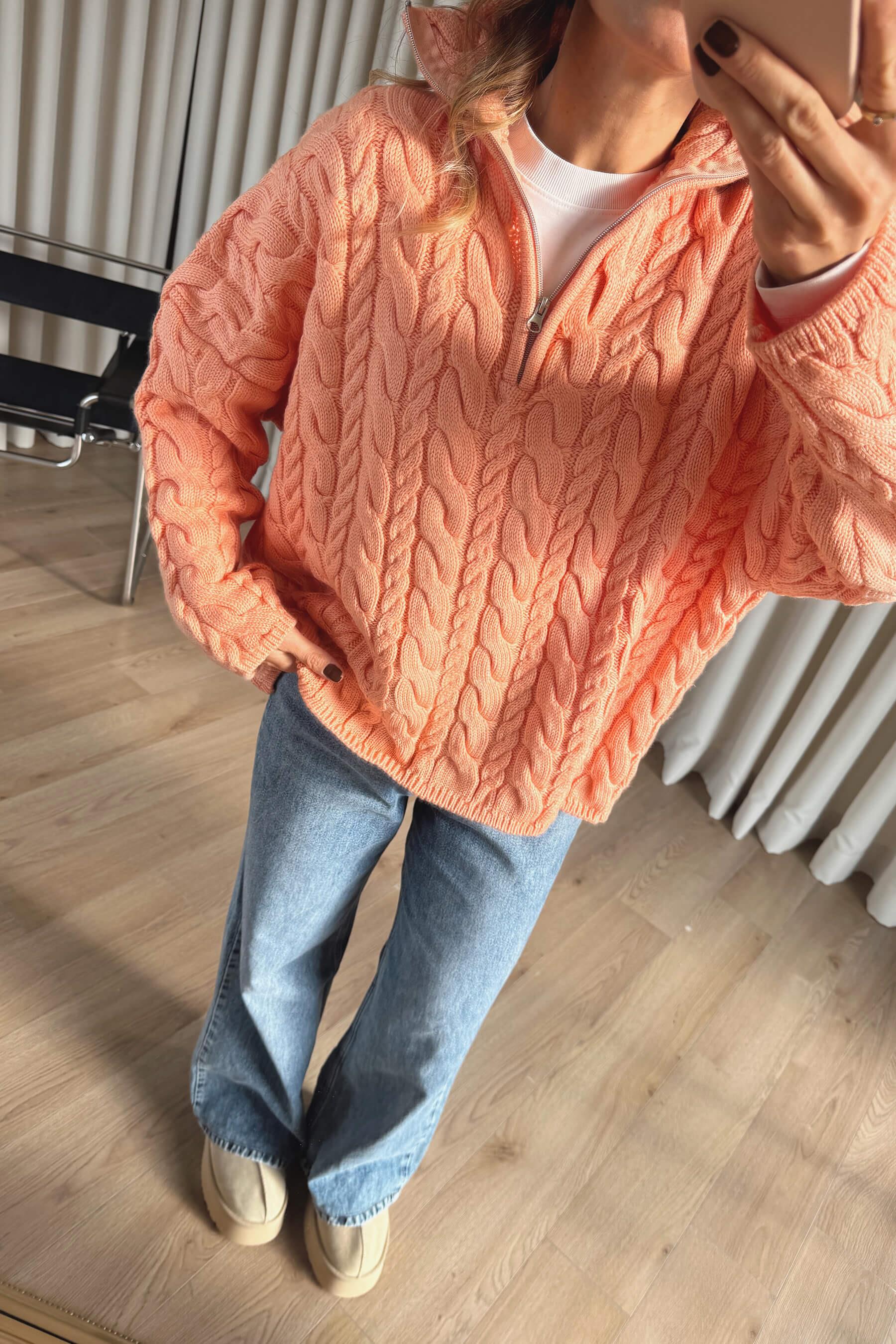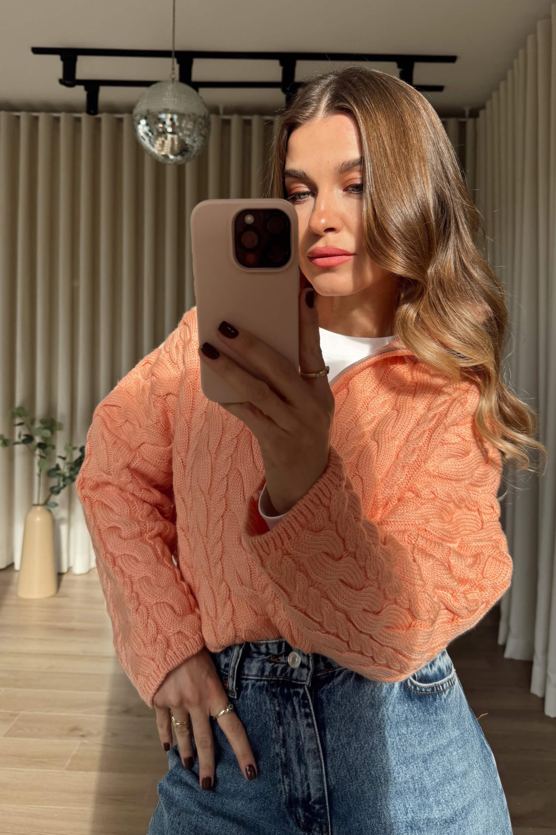 Somon Fermuarlı Saç Örgü Kazak Model Ölçüleri: Boy: 166 cm, Kilo:54 kg Modelin Üzerindeki Beden: Standart Ürünün Uzunluğu: 61 cm (1-2 cm arası değişiklik gösterebilir.) Kumaş Türü: %100 Akrilik Yıkama Talimatı : Ürünün iç kısmında bulunan etiketten yıkama talimatına ulaşabilirsiniz.