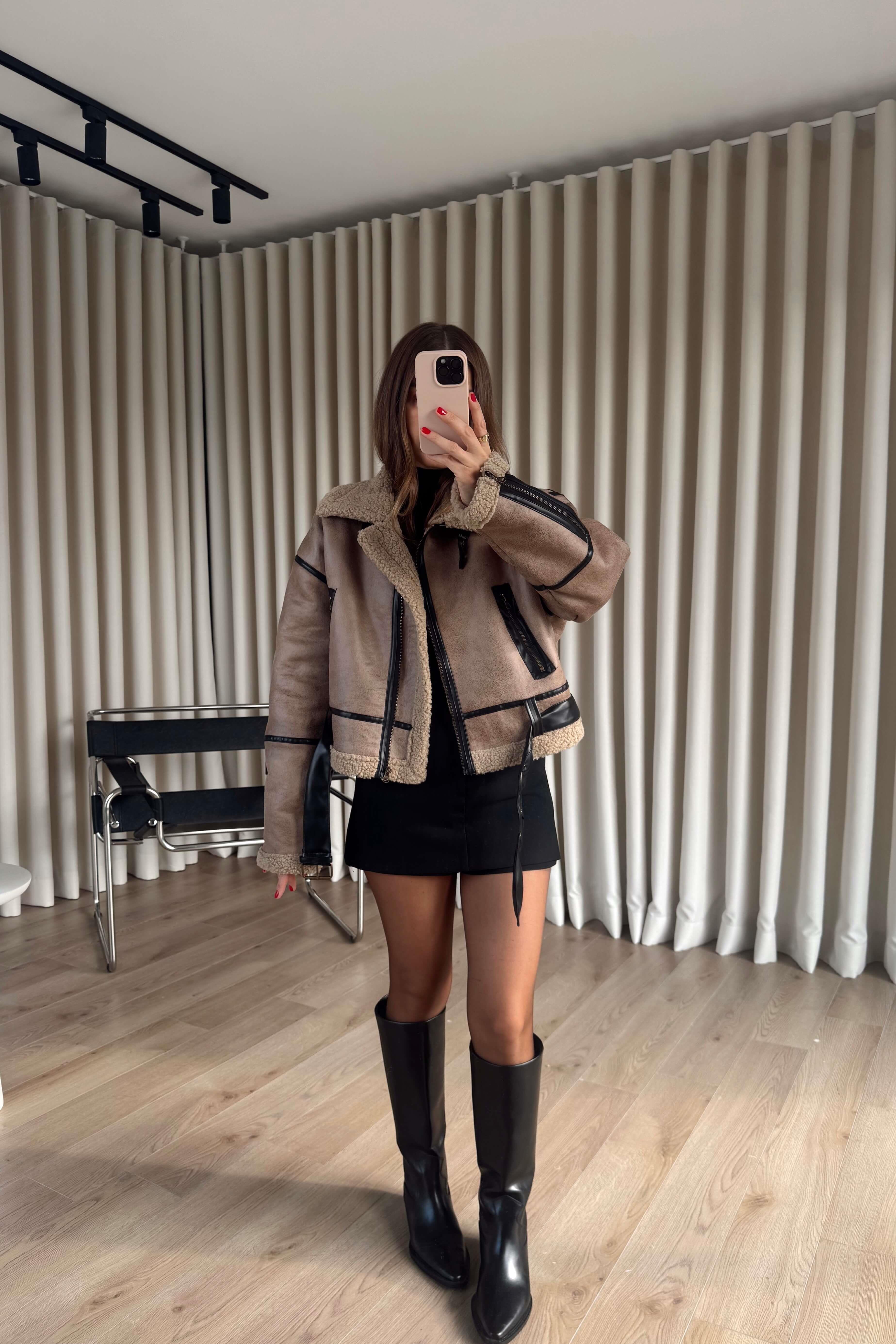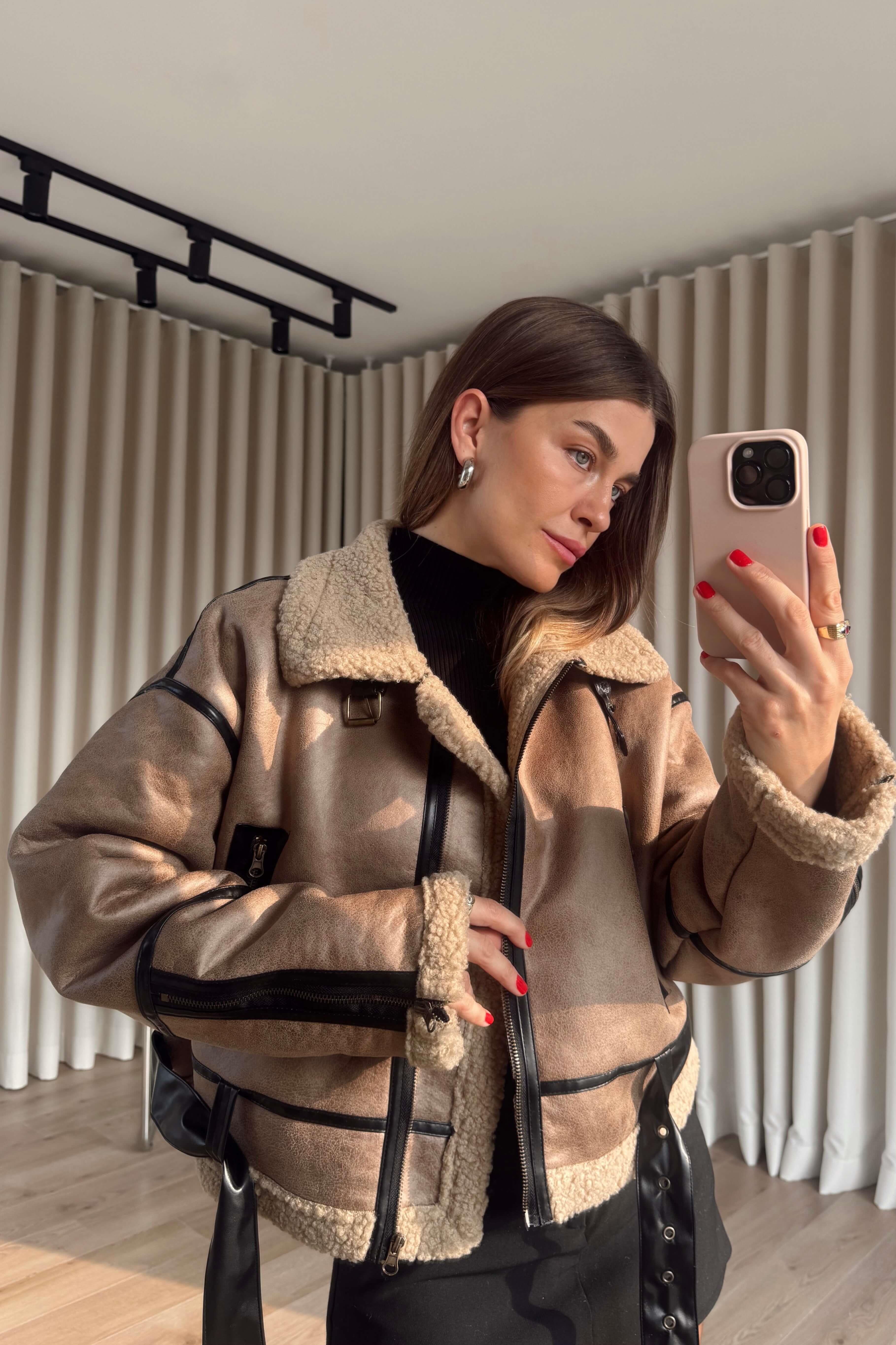 Sütlü Kahve Siyah Kemer Detaylı İçi Kürklü Oversize Deri Mont Model Ölçüleri: Boy: 166 cm, Kilo:54 kg Modelin Üzerindeki Beden: S/36 Ürünün Uzunluğu: 52 cm (1-2 cm arası değişiklik gösterebilir.) Kumaş Türü: Polyester Yıkama Talimatı : Ürünün iç kısmında bulunan etiketten yıkama talimatına ulaşabilirsiniz.