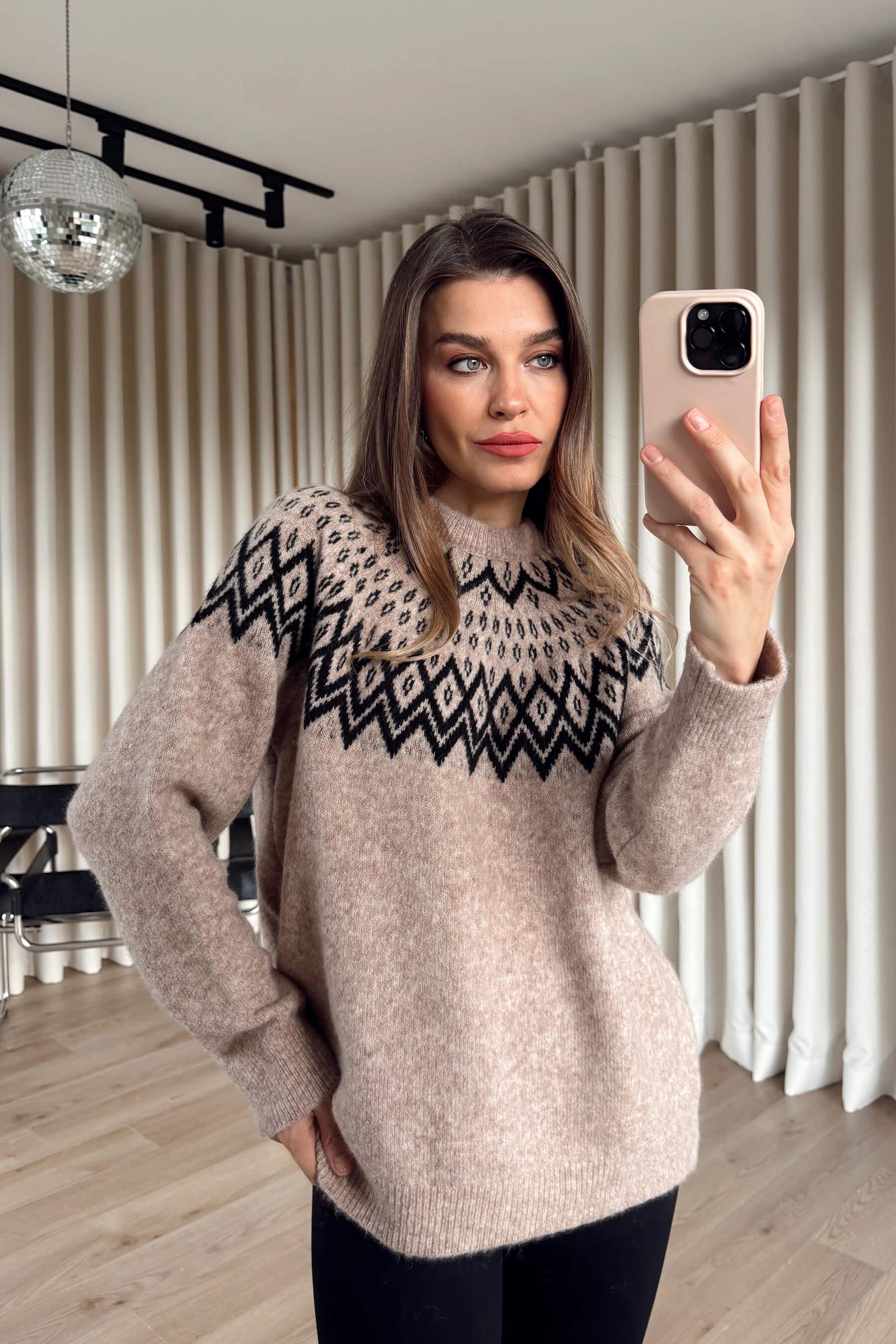 Sütlü Kahve Siyah Yaka Oversize Desenli Triko Kazak Model Ölçüleri: Boy: 166 cm, Kilo:54 kg Modelin Üzerindeki Beden: Standart Ürünün Uzunluğu: 70 cm (1-2 cm arası değişiklik gösterebilir.) Kumaş Türü: %39 Akrilik, %29 Rcl, %14 Polyester, %9 Naylon, %5 Yün, %4 Spandex